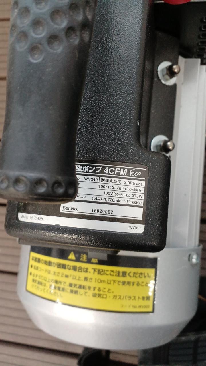 真空度:2.0Pa abs.(15ミクロン) ポンプスピード(min[[の-1乗]]):1440(50Hz)、1720(60Hz) |