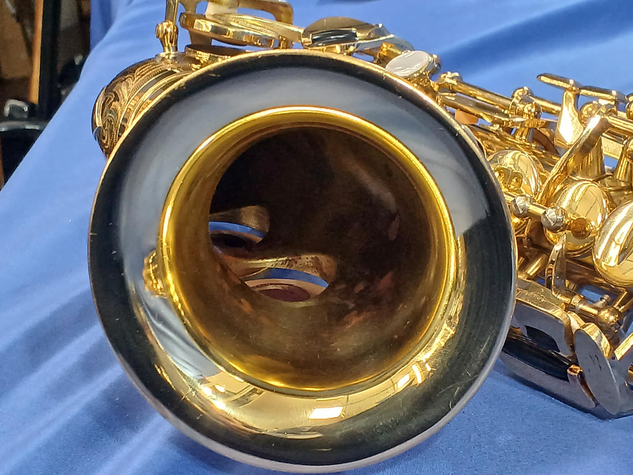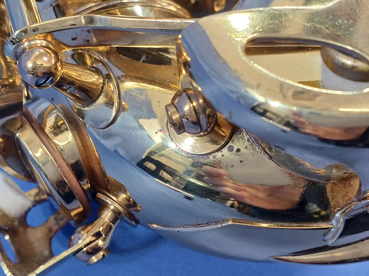 キズ:凹み直し跡あります。(ベルキイガード下、U字管キイガード下) 交換したタンポは、カップに合うもの・合わないもので、オレンジ・こげ茶が混在しています。 |