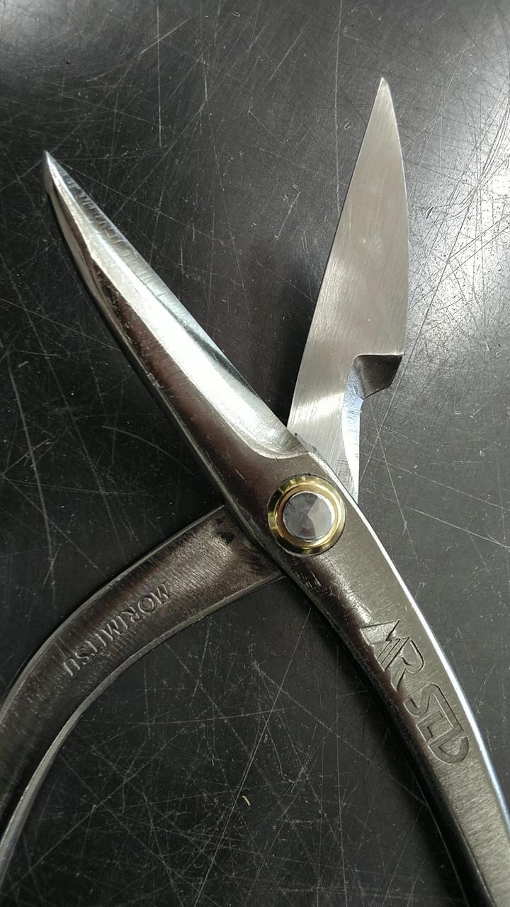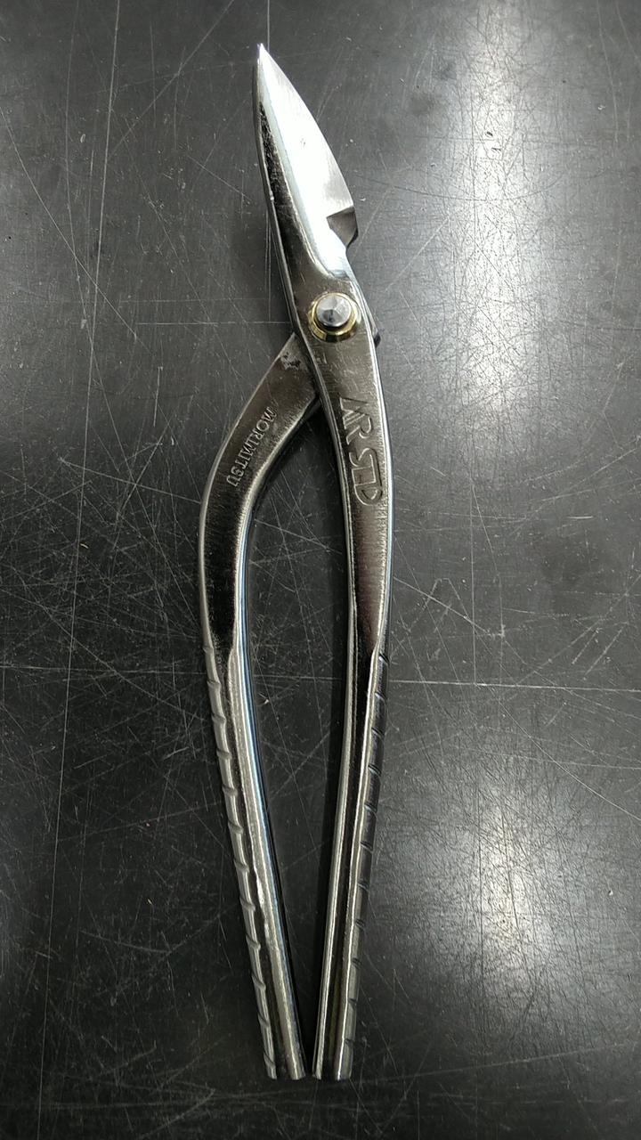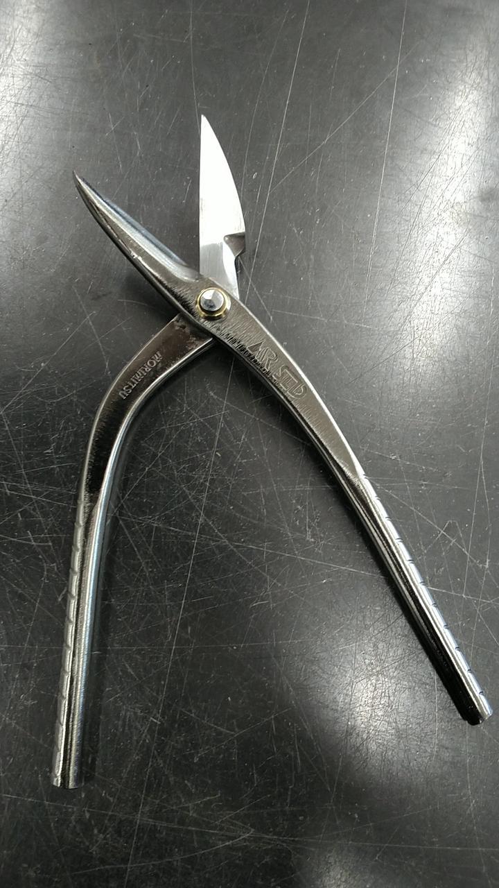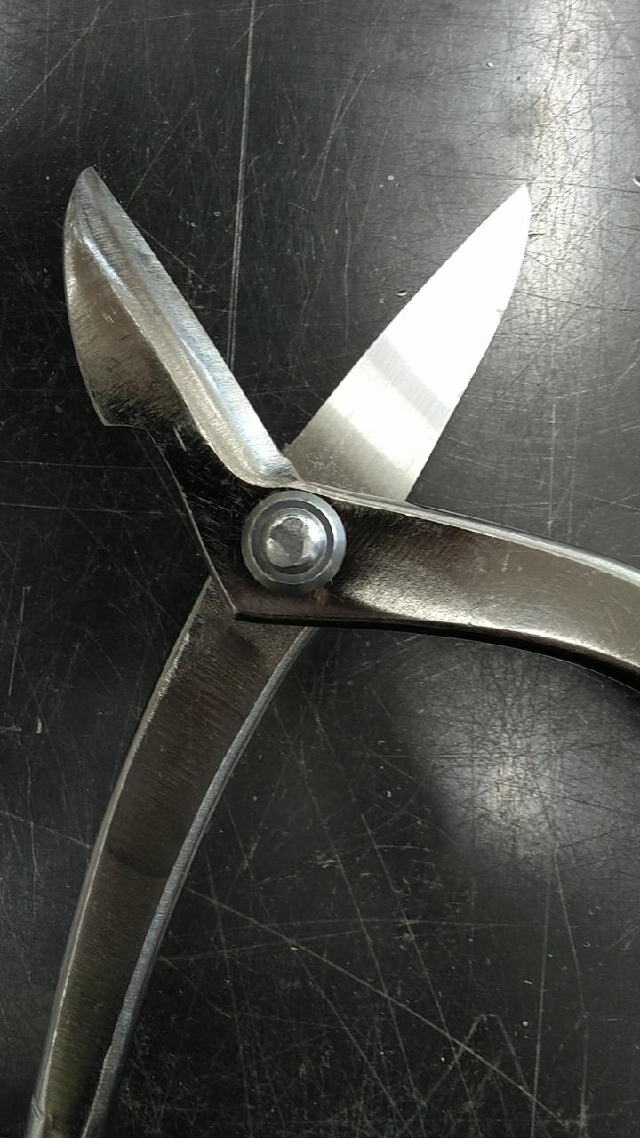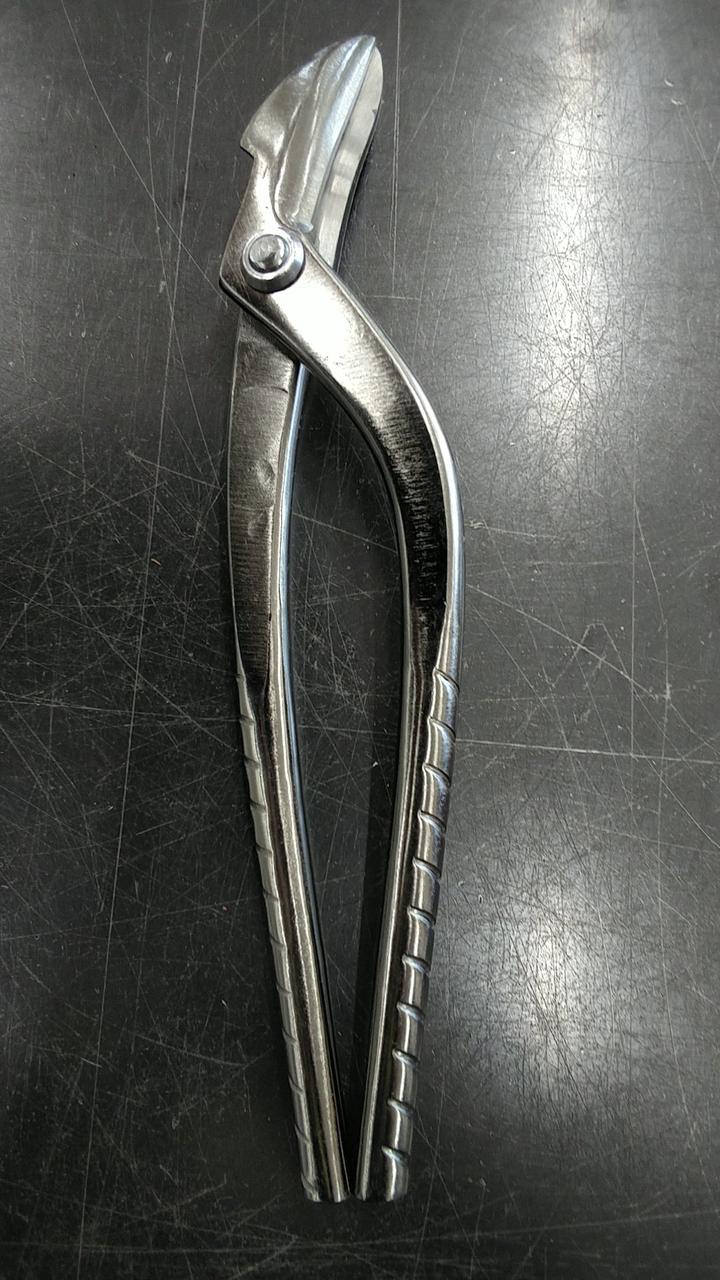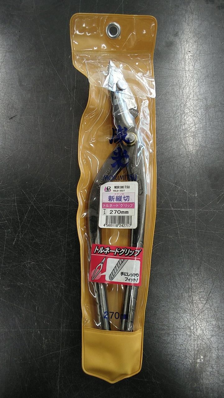 砂鉄系ハガネ日立安来SLD鋼を刃に使用しています。グリップ部に凹凸加工を施しハンドリングの良さを実現しました。表面はクロニッケルメッキ仕上げの本職用板金鋏になります。 |