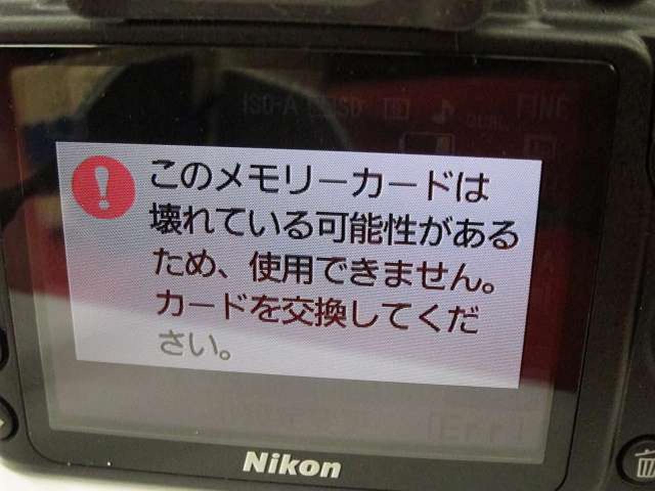 SDカードを入れてなくても「このカードは壊れている」エラーが表示されます。Nikonのデジタル一眼でよくある不良です 写真にてご確認ください。チェック用のメモリーカードに録再はできました 抜いてまた電源を入れなおすと同じエラーが表示されます |