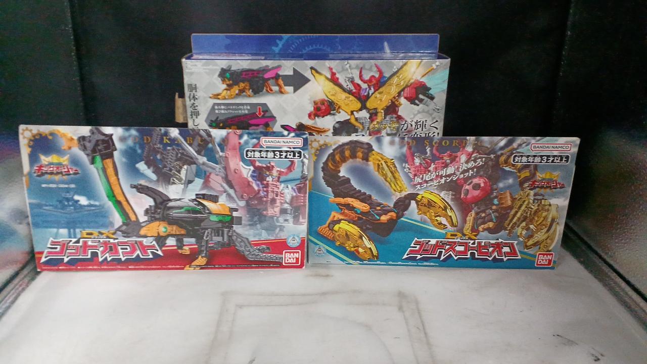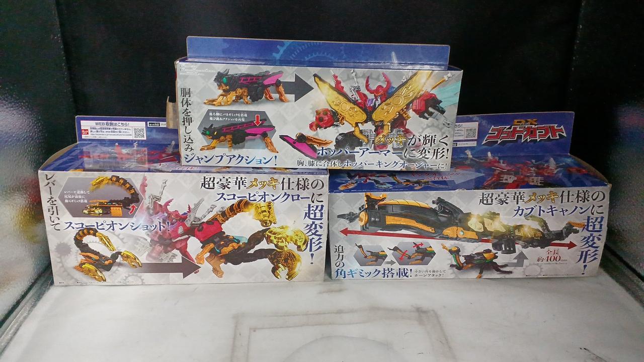 DXゴッドホッパー、DXゴッドスコーピオン、DXゴッドカブトの3つセット販売です。 |