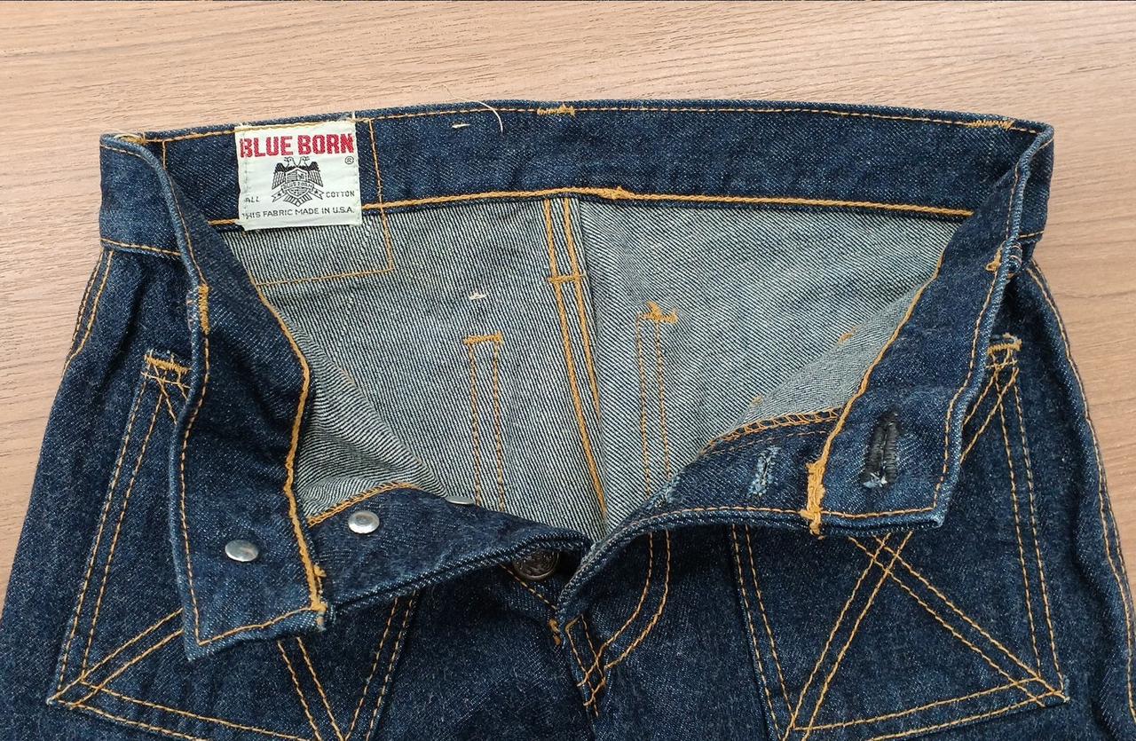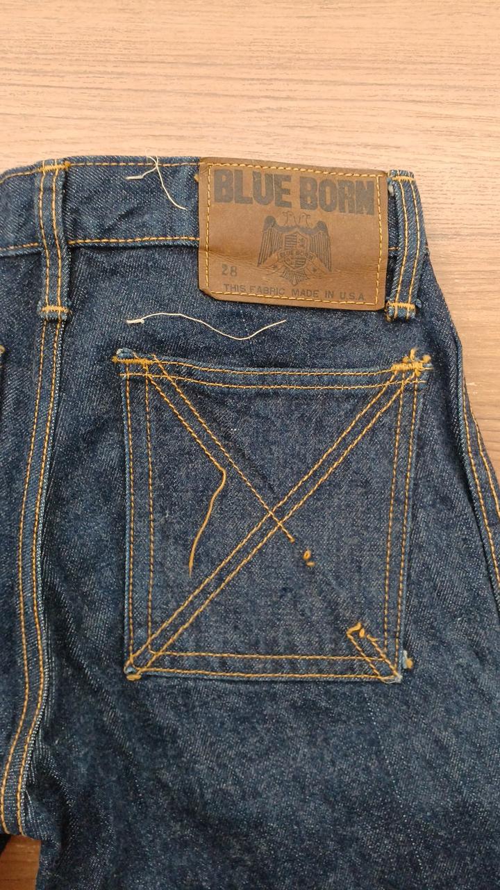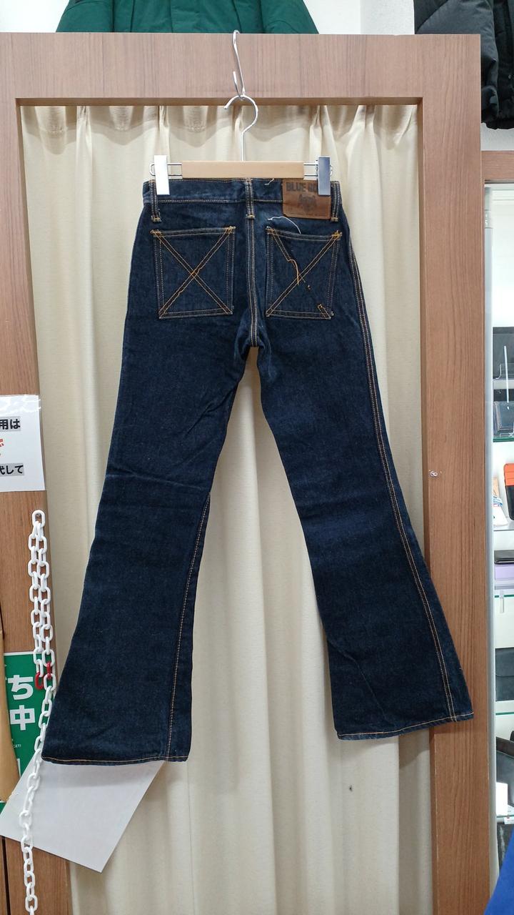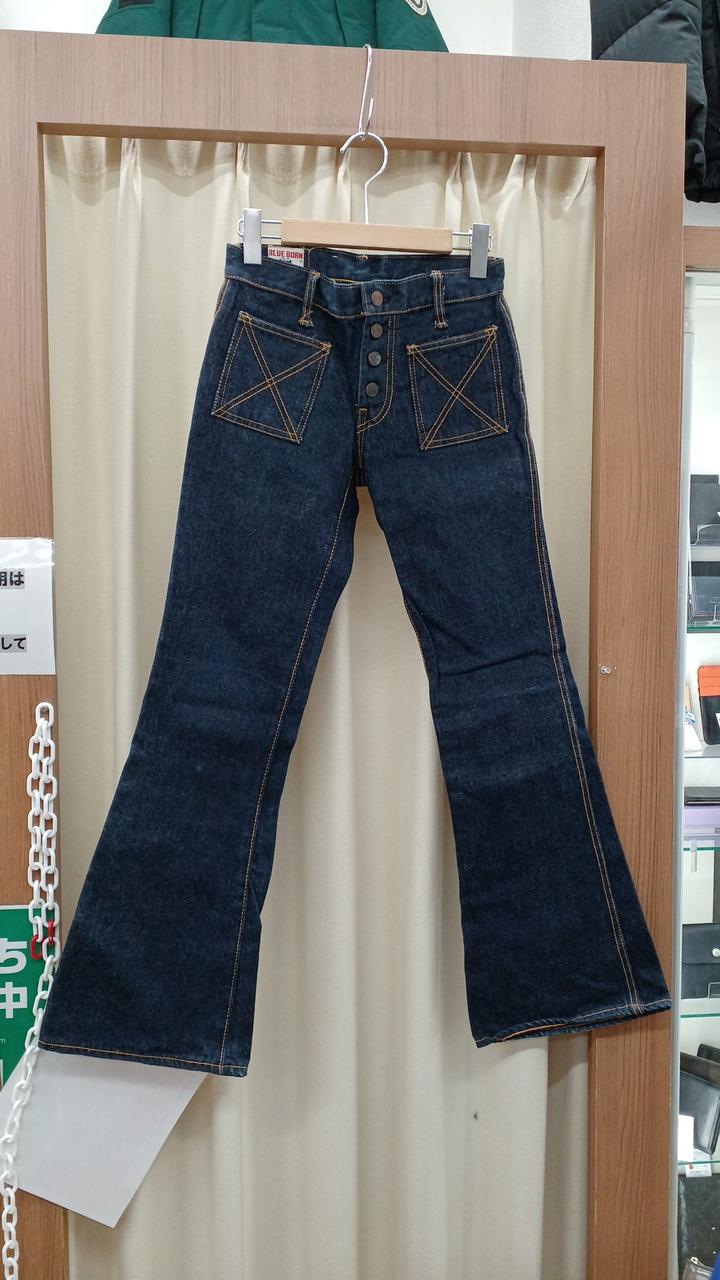 BLUE BORNのベルボトムパンツです。USA製でヴィンテージです。表面の右足部分に小さな汚れと、後ろ側の裾にスレがあります。 |