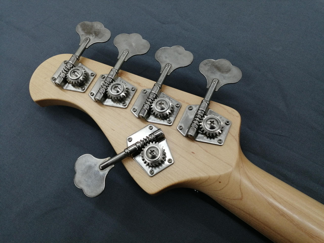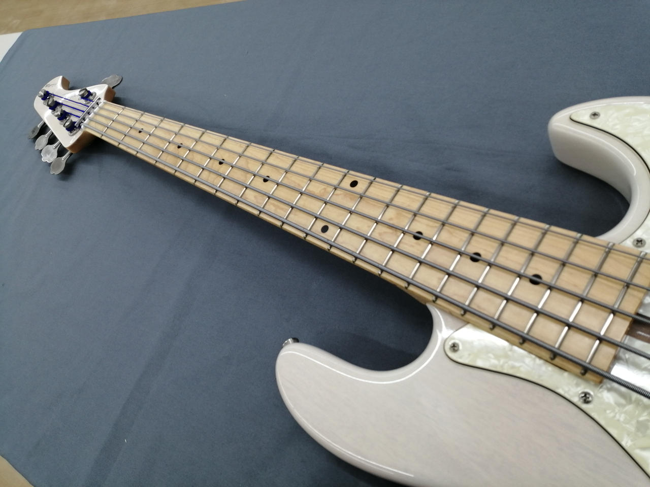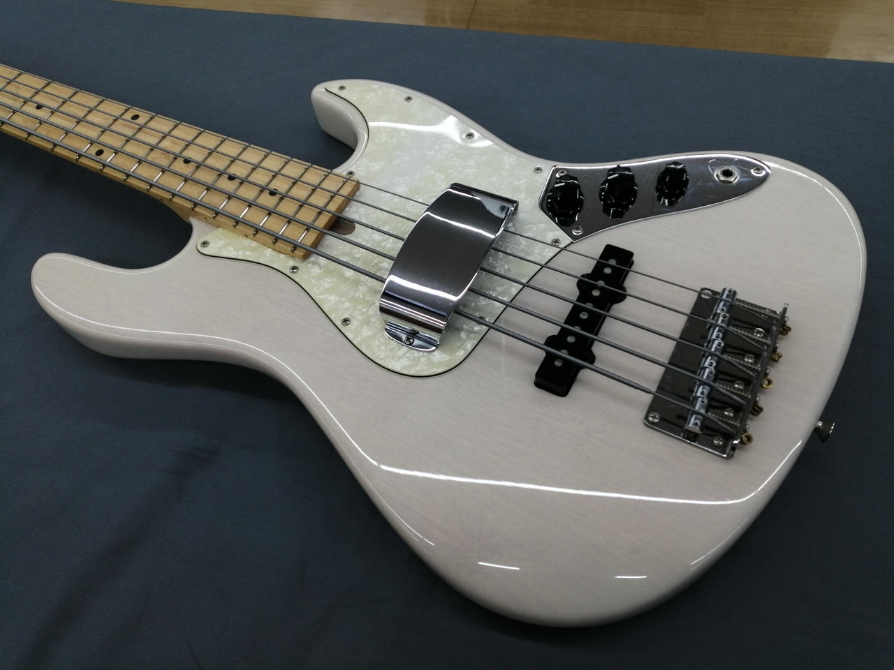 メイプルネック、マホガニーボディの5弦ジャズベース。 |