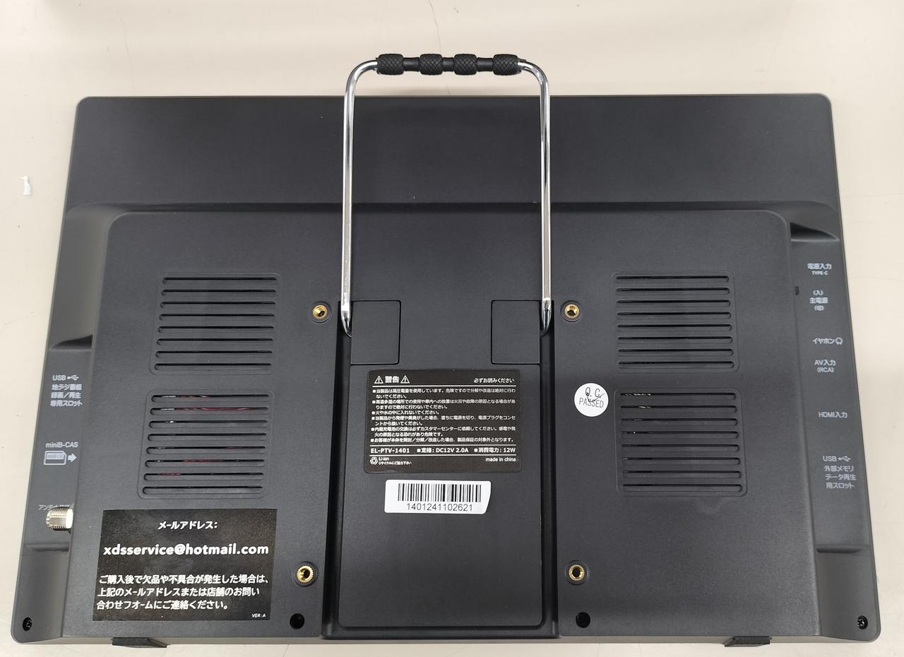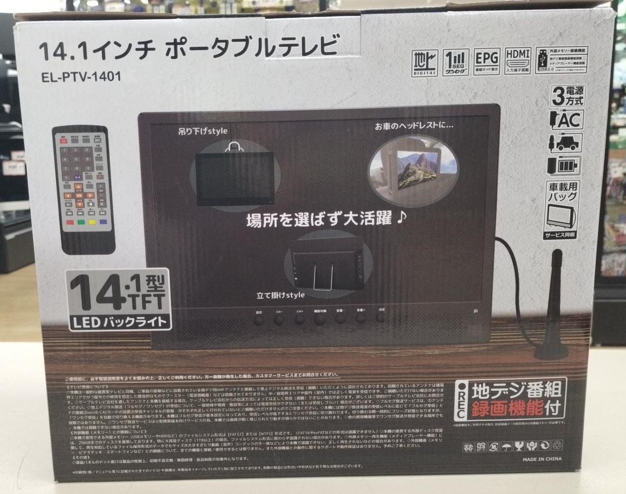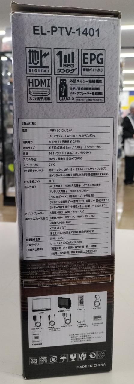 画面サイズ 14.1ディスプレイ液晶 出力端子 AV入力 HDMI入力 イヤホン入力 アンテナ入力 アスペックト比 16:9 解像度1366×768RGB |