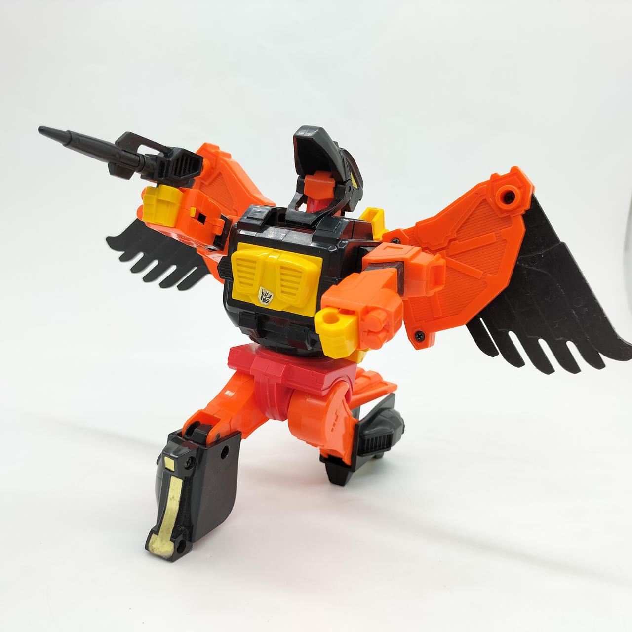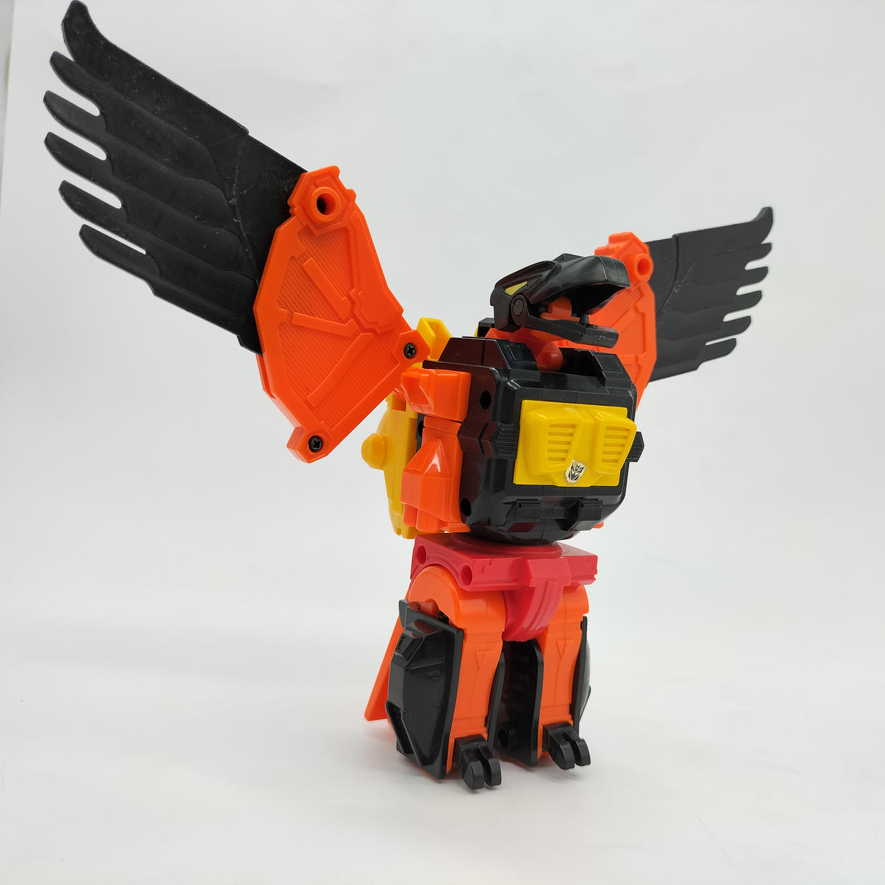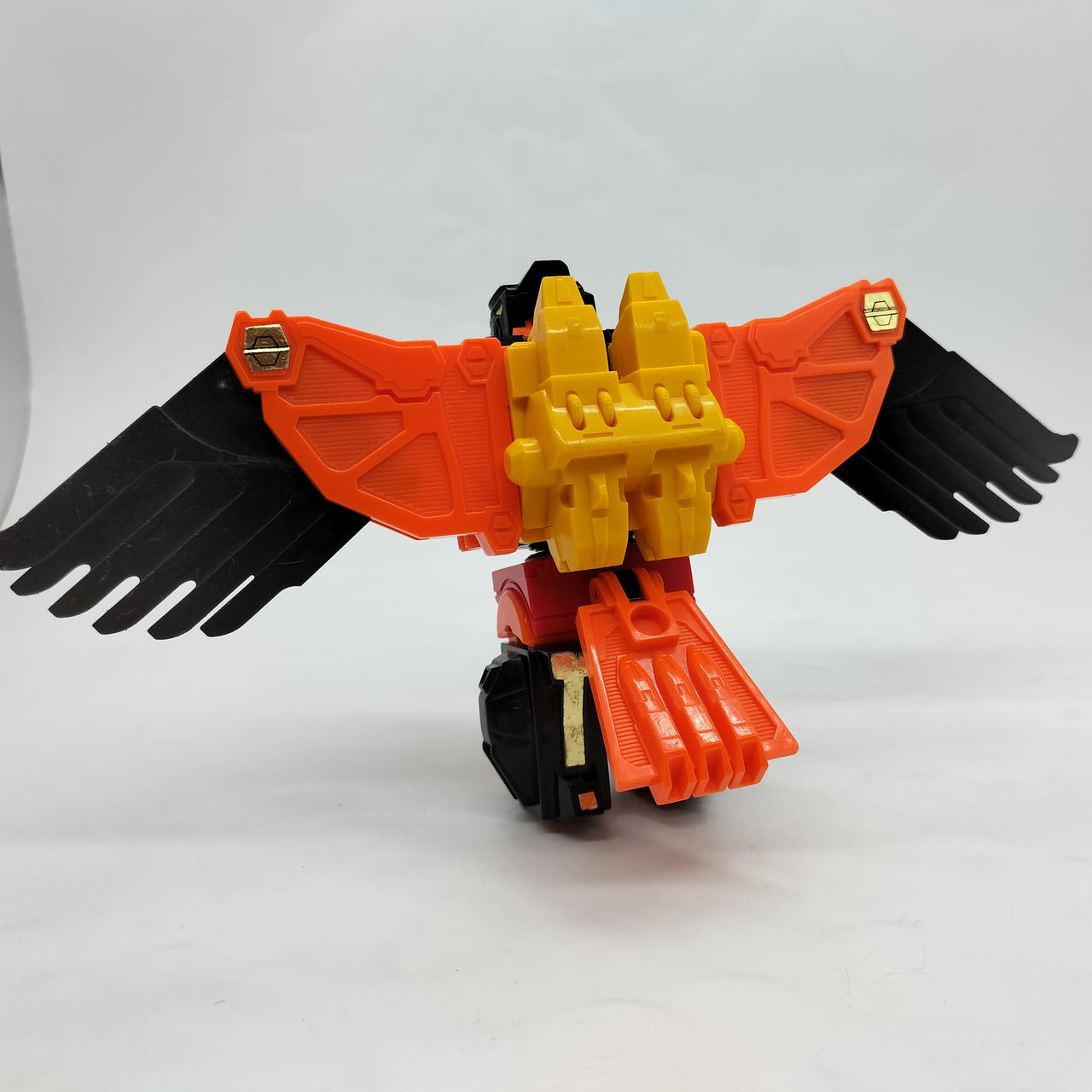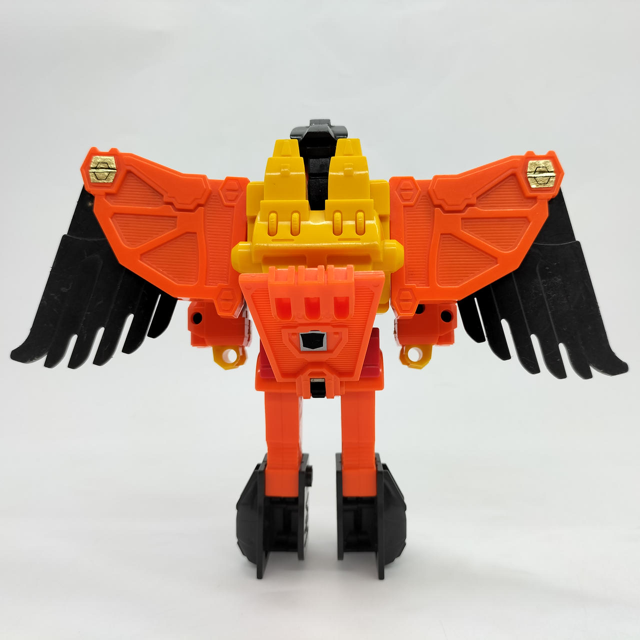 翼の重さのためかロボットモード時の自立に難があり、後ろに倒れやすいです。少し前傾にしてバランスを取ればなんとか立たせられます。 |