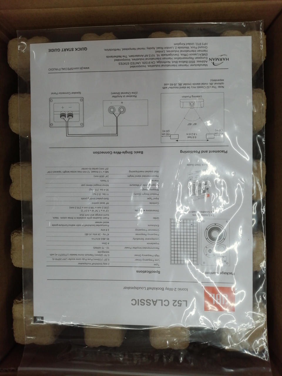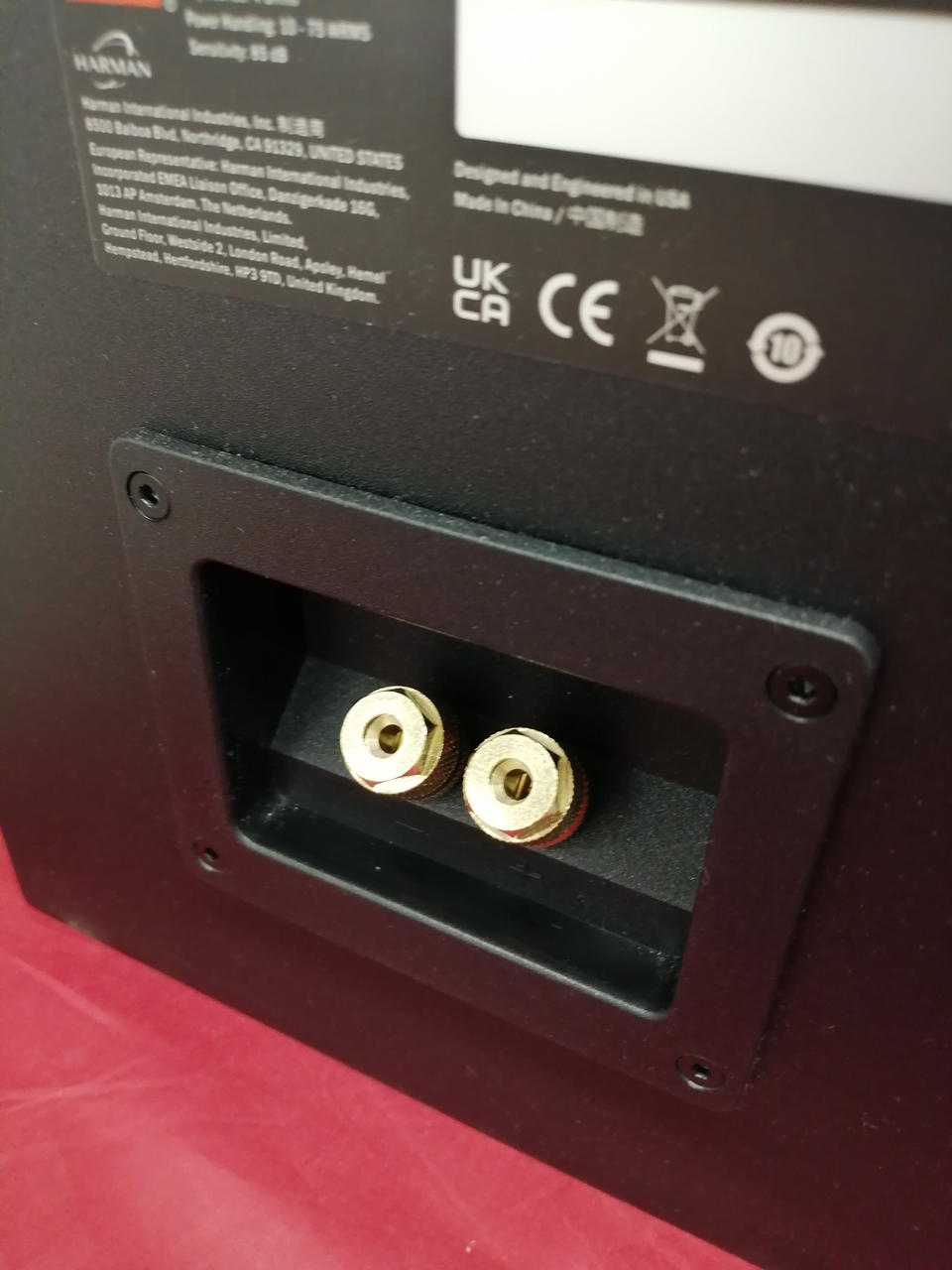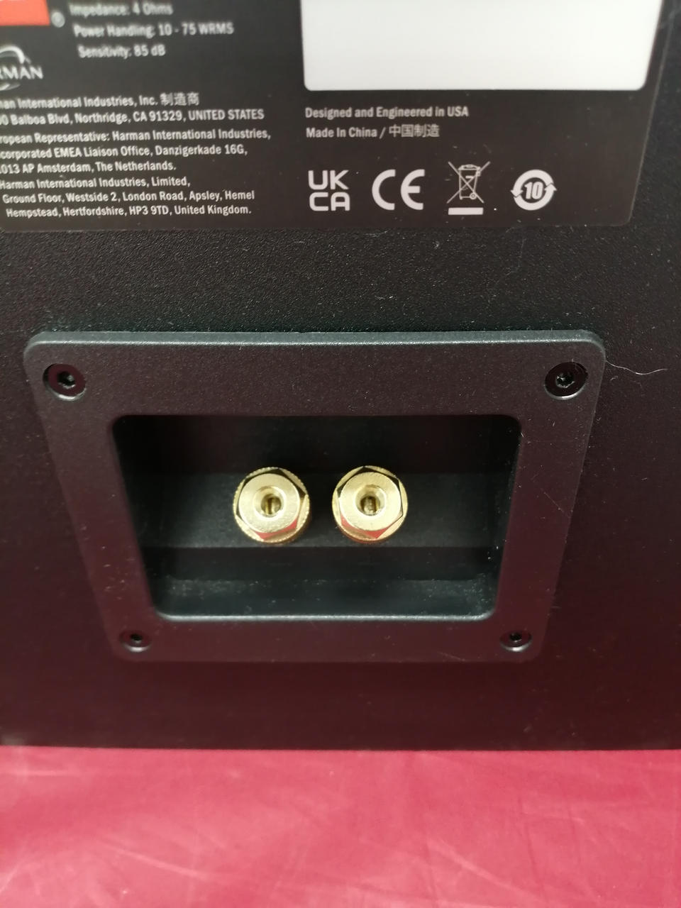 公称インピーダンスは4Ω。再生周波数特性(-6DB/無響室特性)は47HZ~24KHZ。推奨アンプ出力(RMS)は10W~75W |