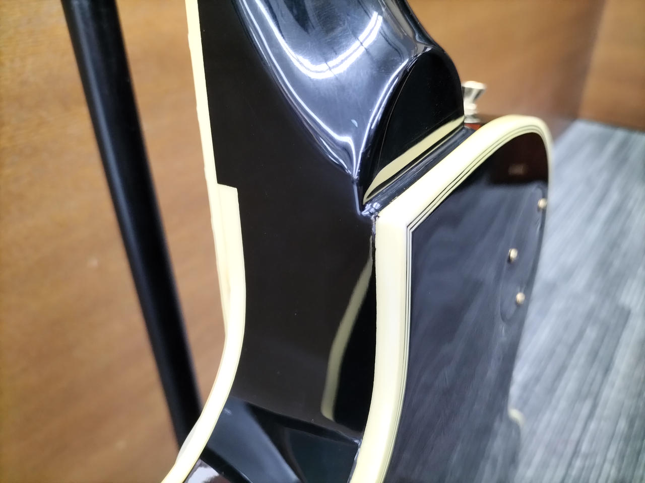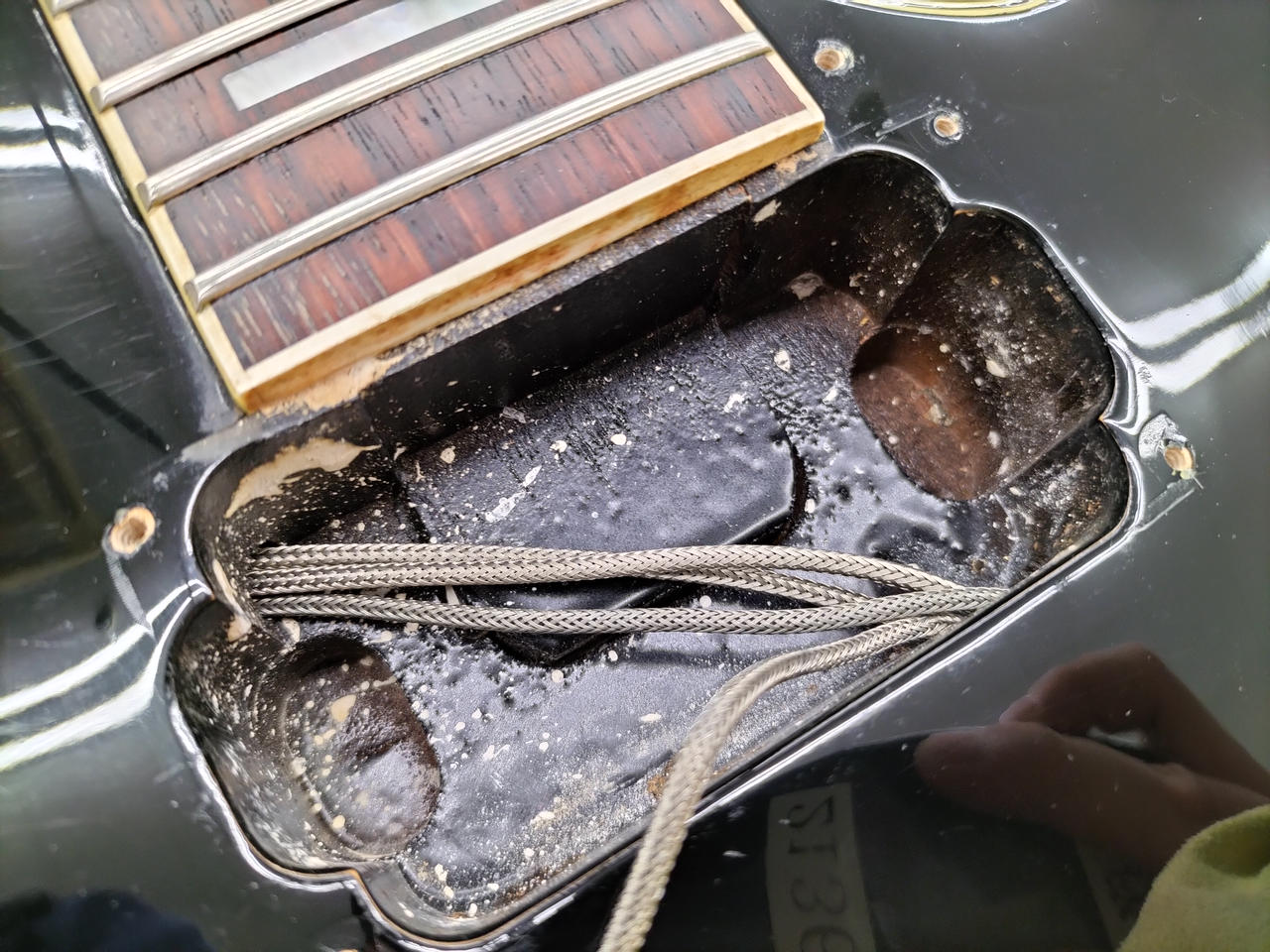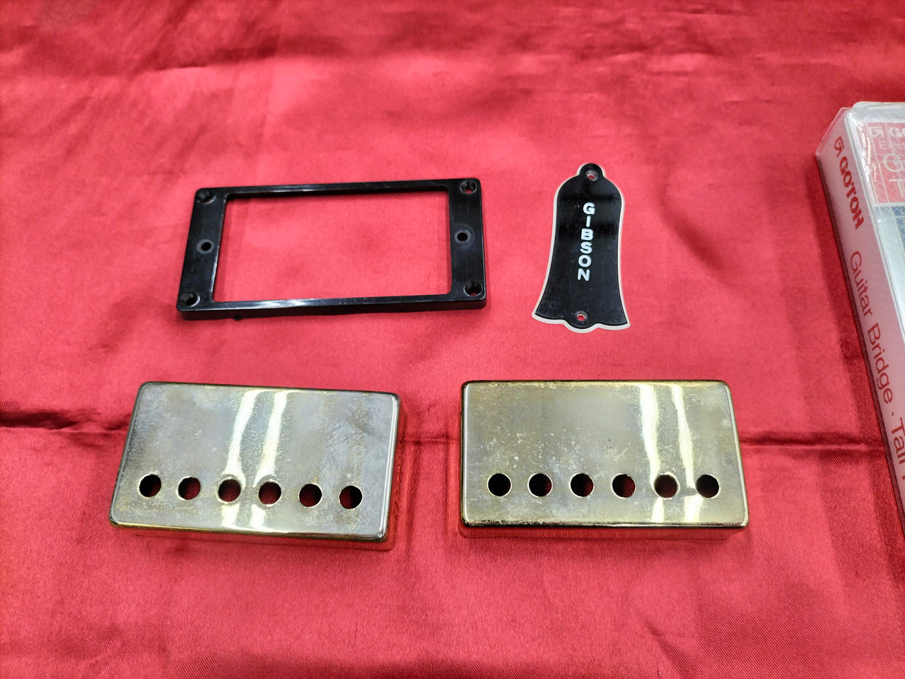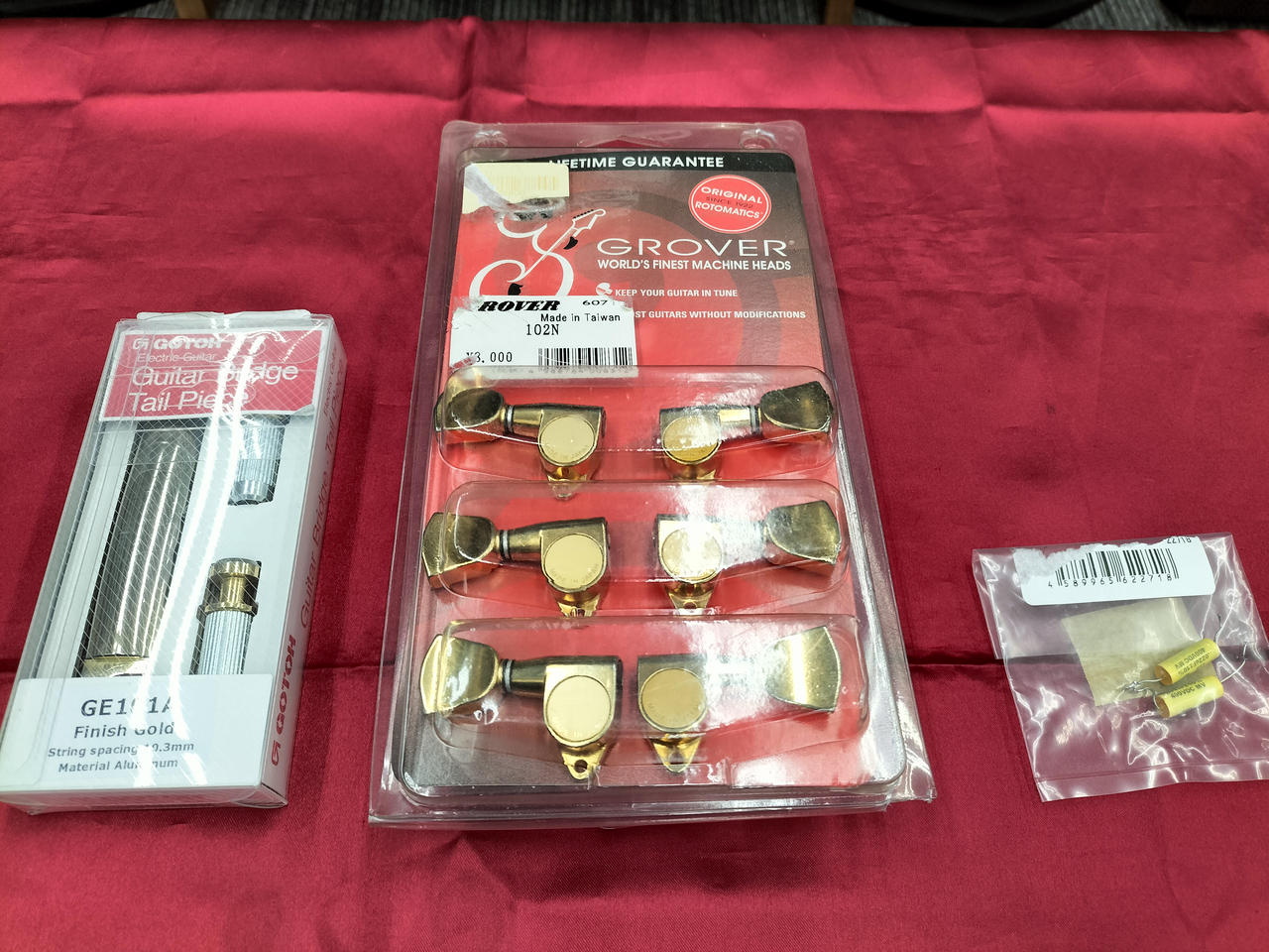 元のペグ、テールピース、ピックアップカバー、ロッドカバーフロントエスカッション、コンデンサ×2付属します。 |