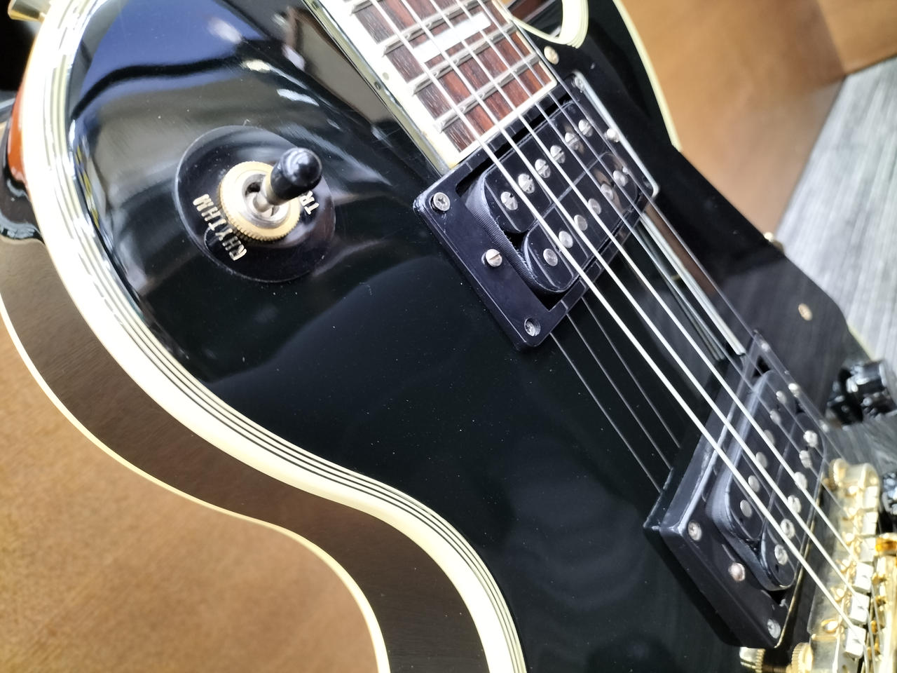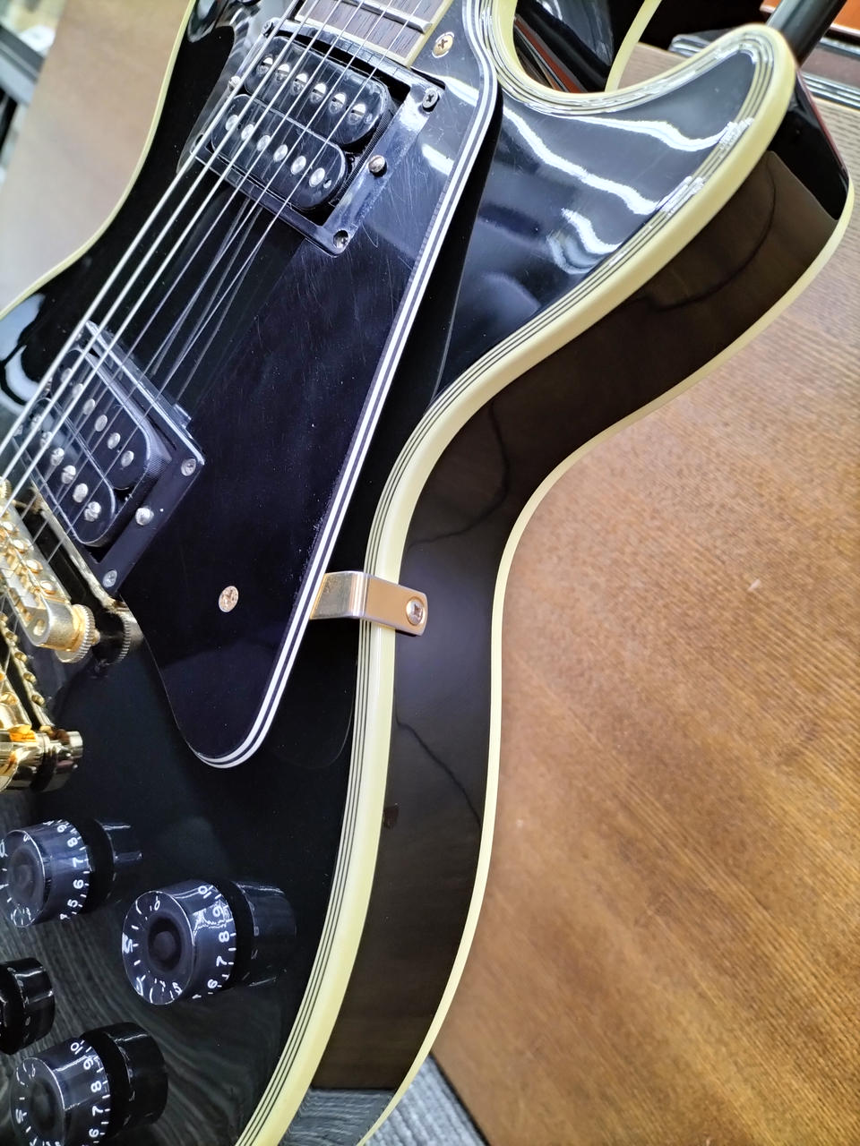 シリアルから2000年フジゲン製と思われる日本製EPIPHONEのレスポールカスタムです!PUはGibson BurstbuckerⅡ,CTSポット,オレンジドロップコンデンサ,SWITCHCRAFT製ジャックと電装系がアップデートされています!ペグもGROVERへ、テールピースはGOTOHのGE101Aに交換されています!ディープジョイントネック等日本製らしいしっかりした造りと相まって即戦力の一本です! |