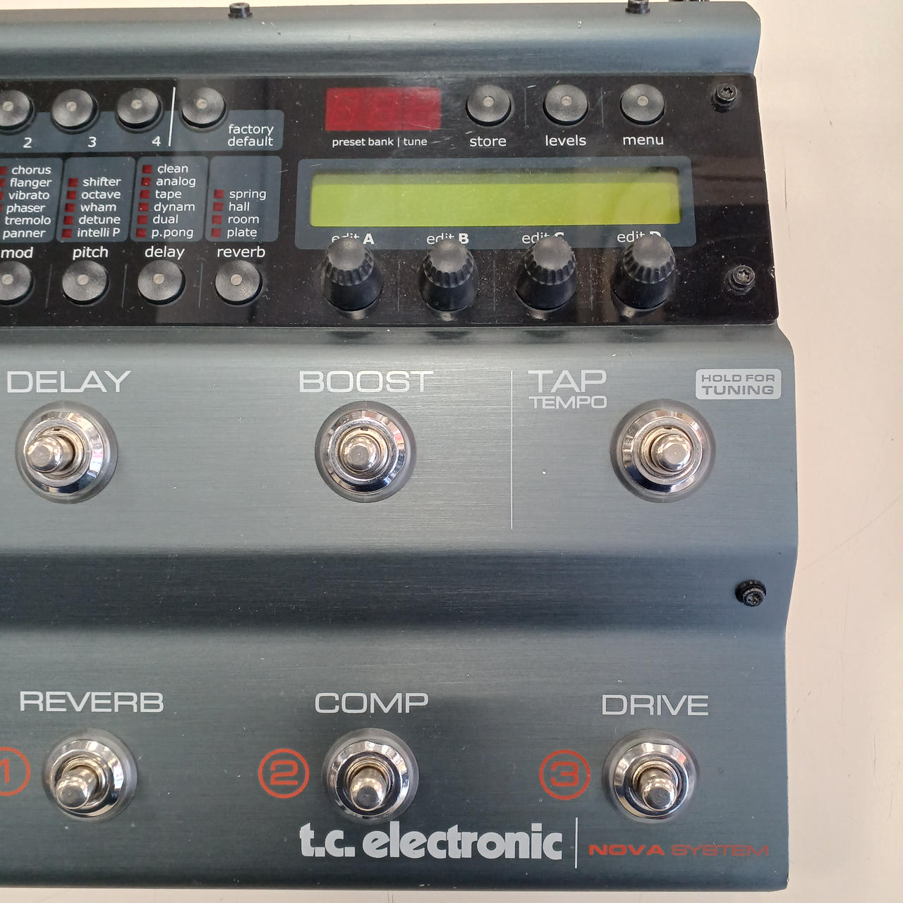 トップクラスのコンプレッション/EQ/ノイズ・ゲート/モジュレーション/ピッチ/ディレイ/リバーブが足元に並びます。 |
