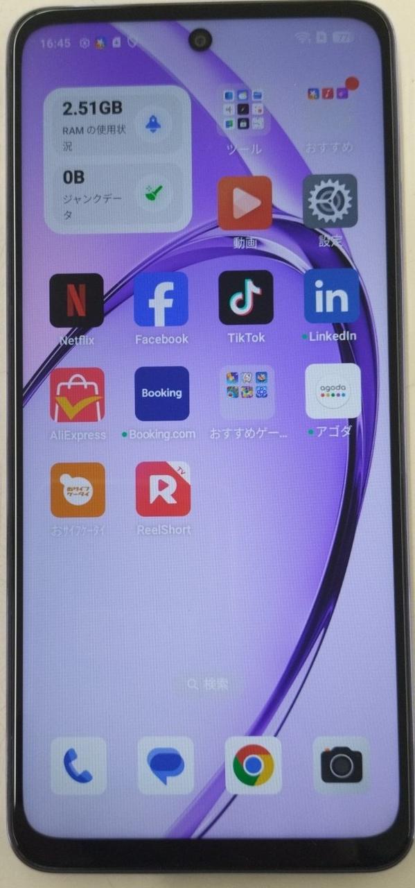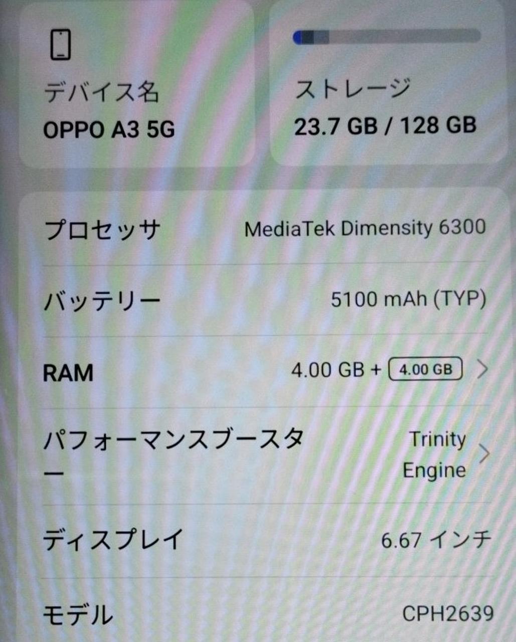 6.67インチ 1604x720 128GB CPU:MediaTekDimesity6300/8コア おサイフケータイ/急速充電/指紋/顔認証 ColorOS:15(Android:15) |