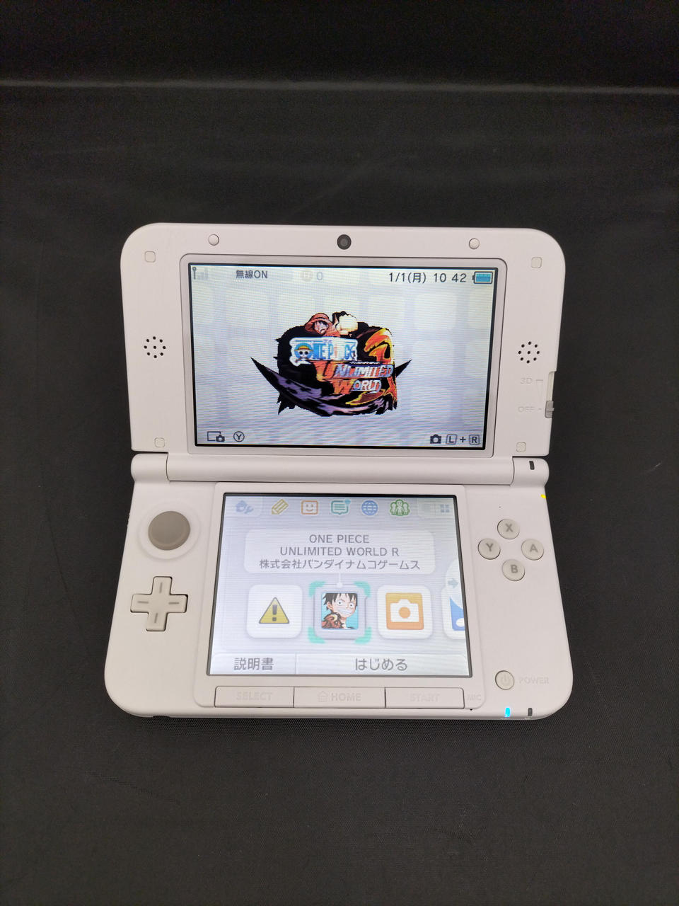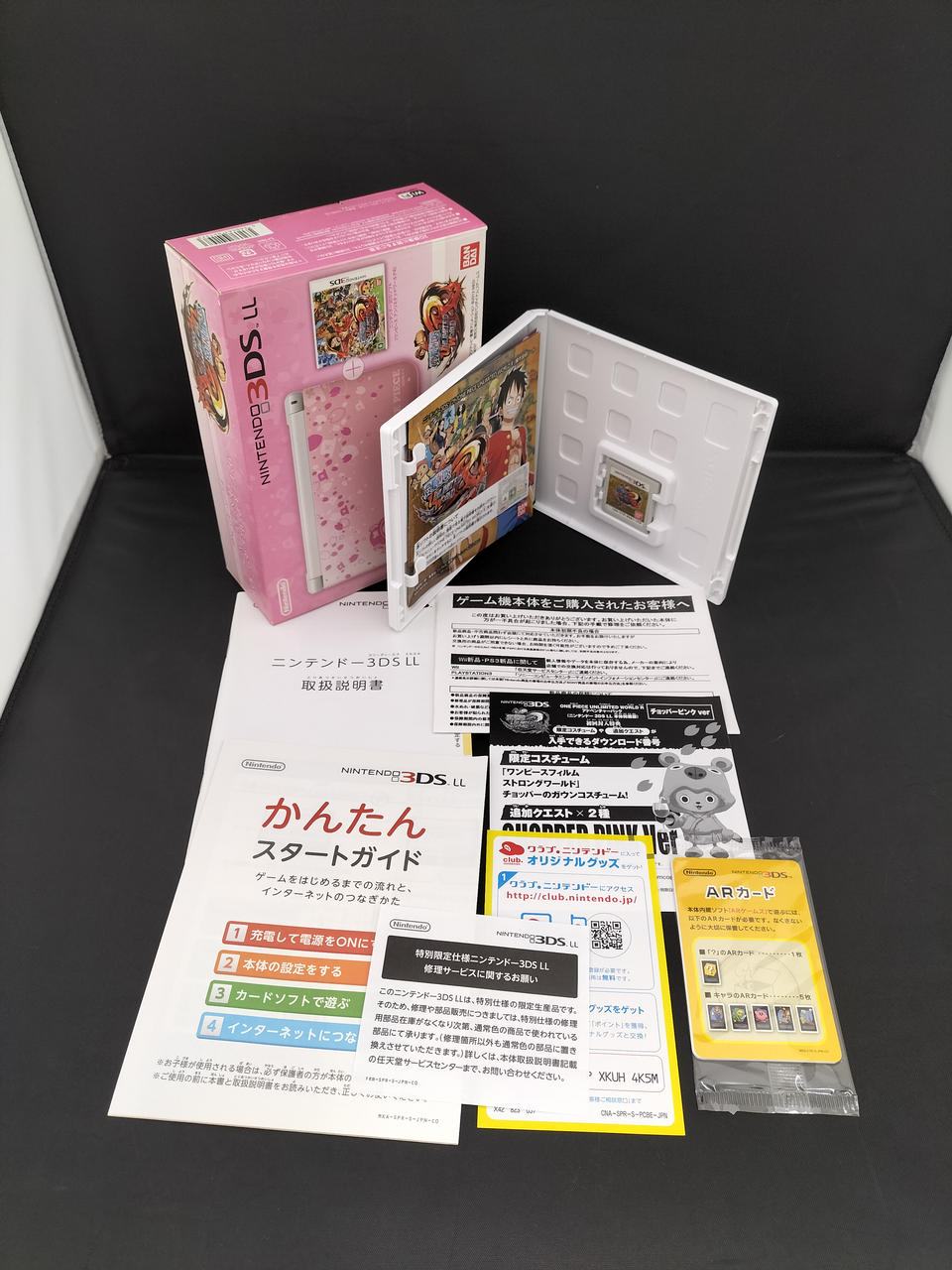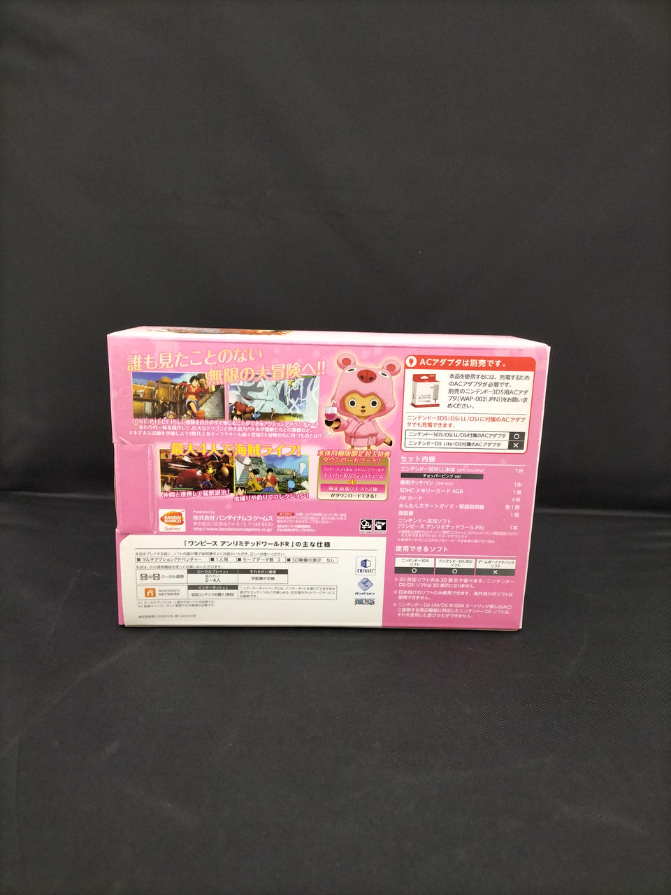 本体同梱版ワンピース アンリミテッドワールドR アドベンチャーパック:チョッパーピンクver。化粧箱、取扱説明書、ARカード、タッチペン、ソフト付属。※液晶画面少しキバミがあるように見えます。メモリーカード欠品。 |