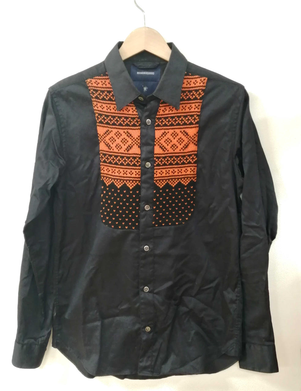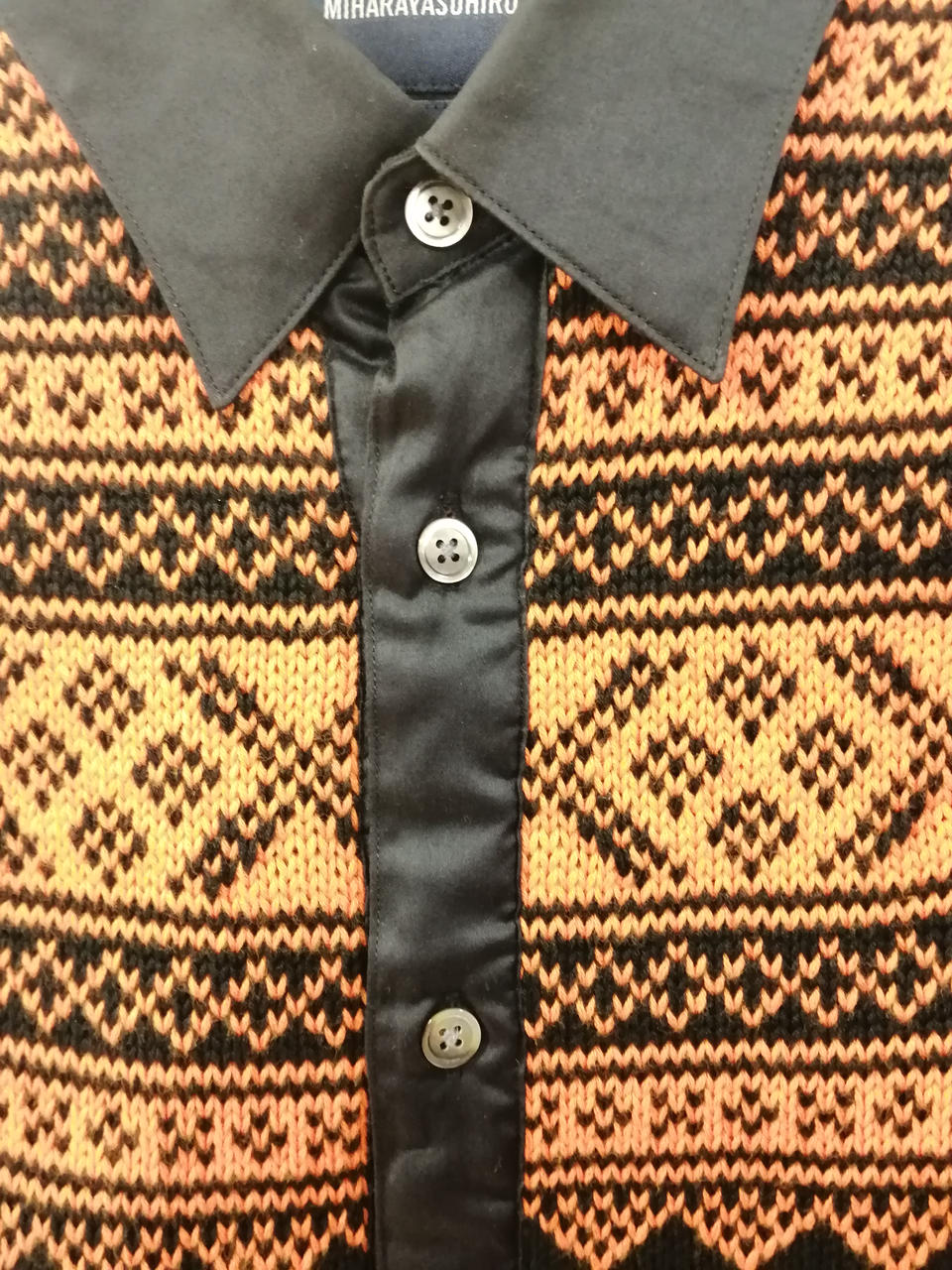 黒い生地にオレンジ色のジャカードニットのパネルが胸元にあしらわれた特徴的なデザインの逸品です! |