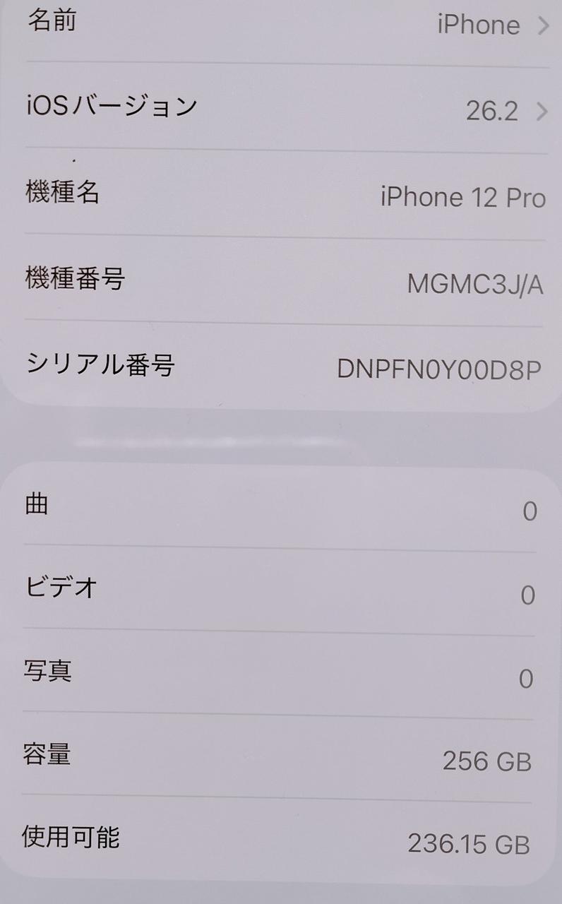 OS:iOS26.2、ストレージ:256GB、トリプルカメラ搭載、画面サイズ:6.1インチ |