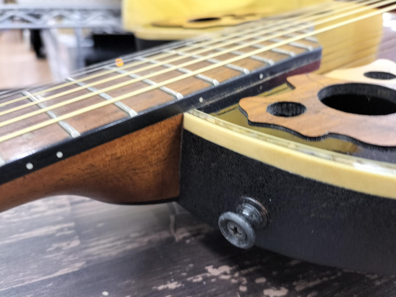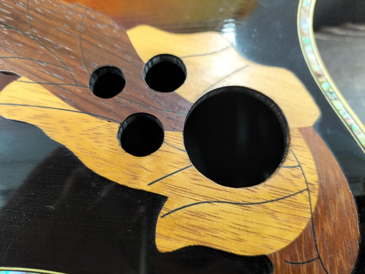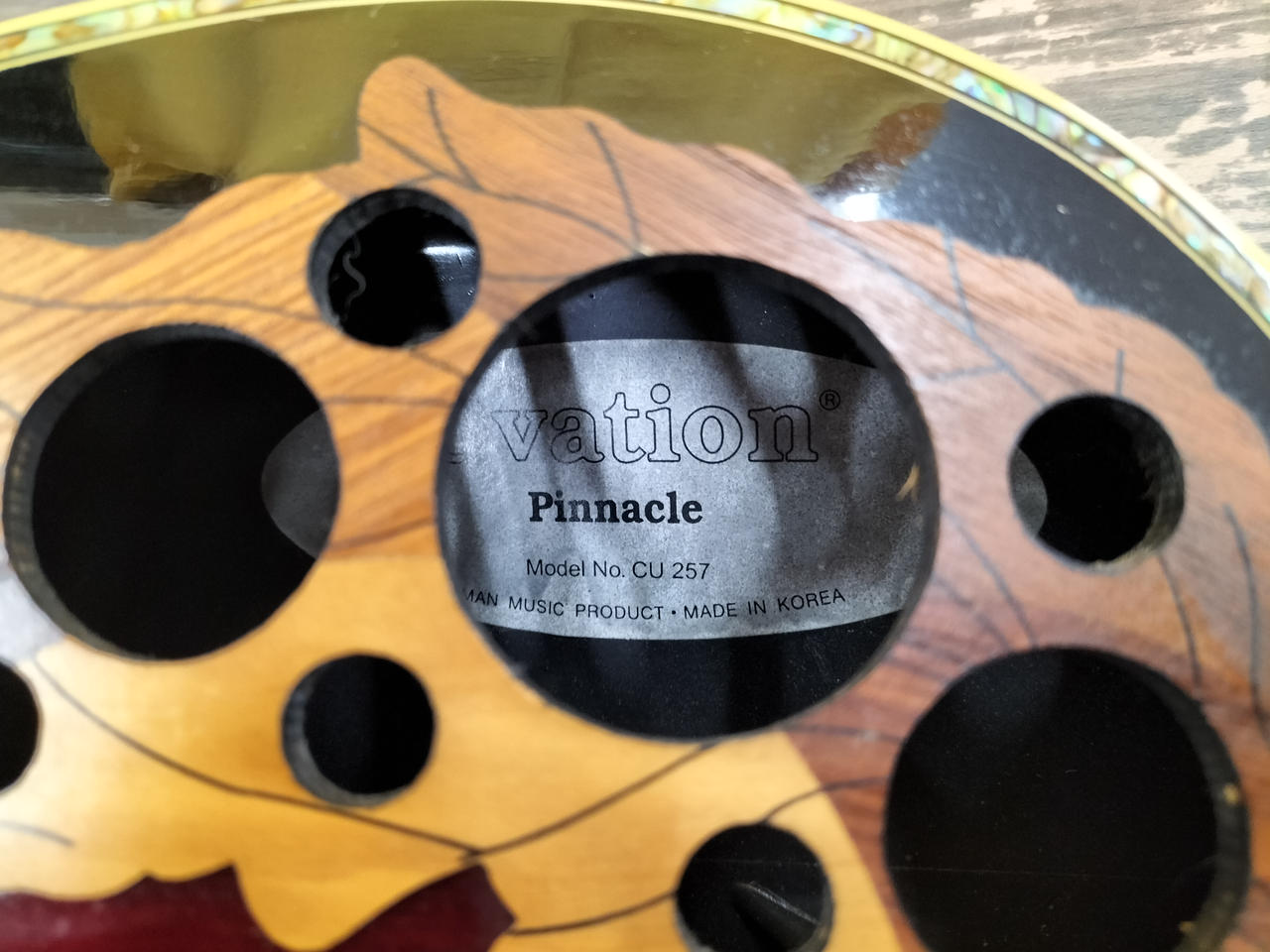 スーパーシャロウボディ、リーフホール、表が単板のピナクルでアバロンのバインディングが特徴的 |