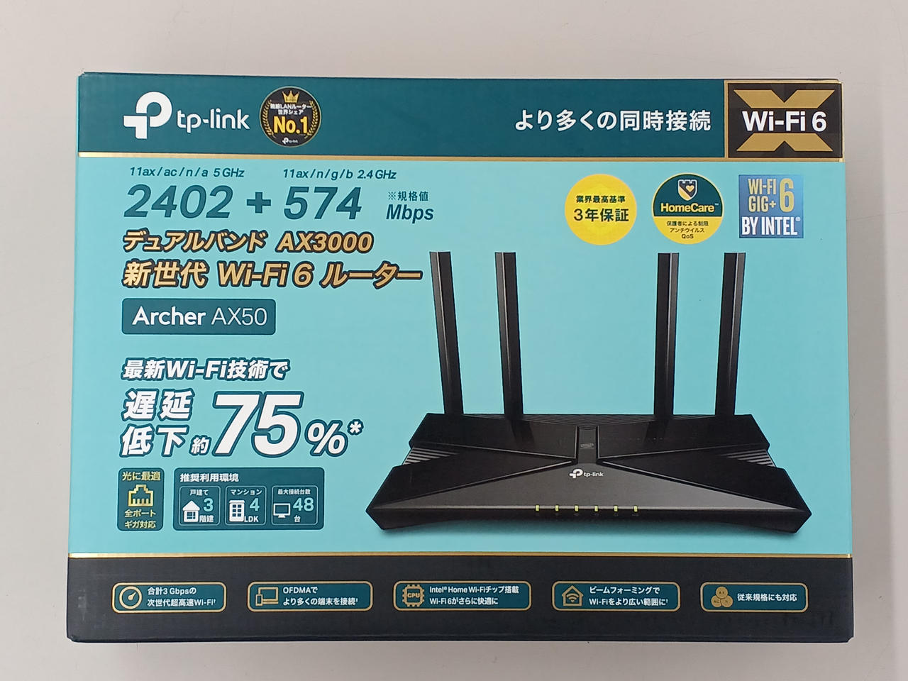 最大通信速度は5GHz帯が2402Mbps、2.4GHz帯が574Mbps |