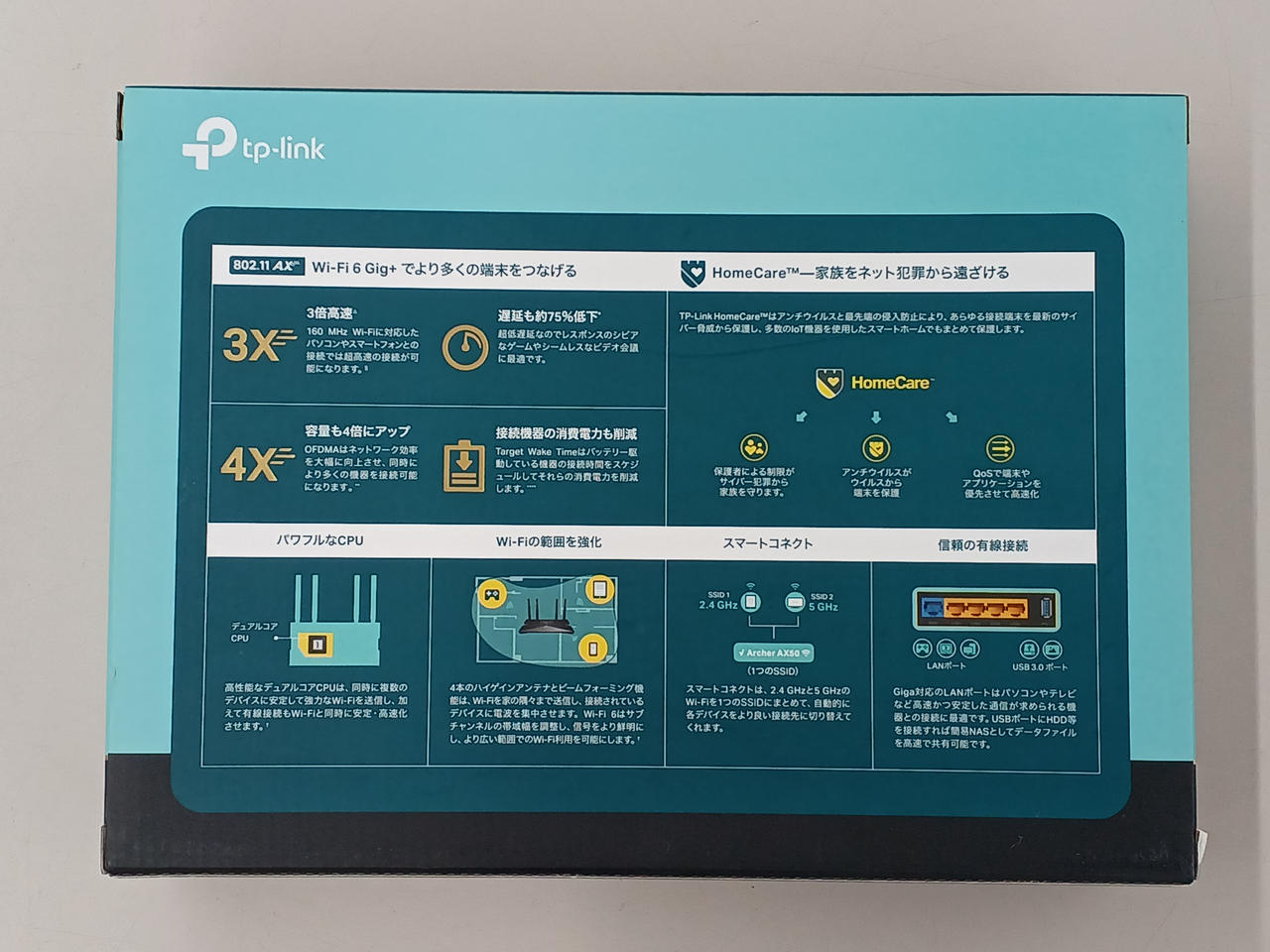 Wi-Fi6対応デュアルバンドルーター WANポート×1、ギガビット LANポート×4、Type A USB 3.0ポート×1を搭載 |