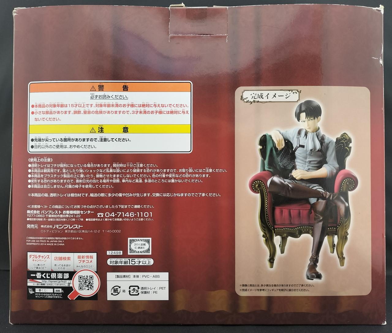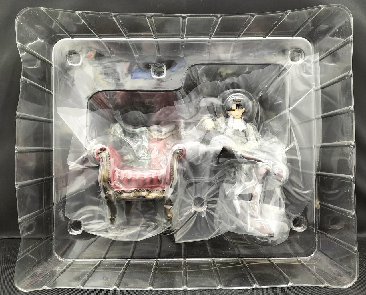 アンティーク風デザインの豪華な椅子に座るリヴァイ兵士長を、リアルフィギュアで再現。版権イラストをイメージソースに作成し、椅子の背もたれに無造作にかけられた調査兵団マントも再現しました。 |