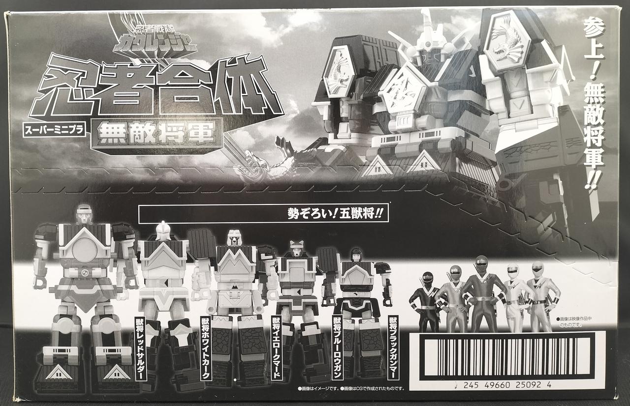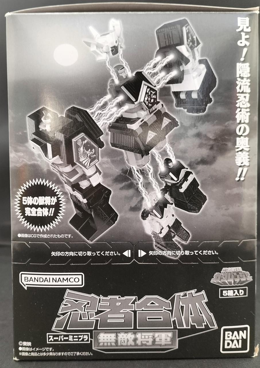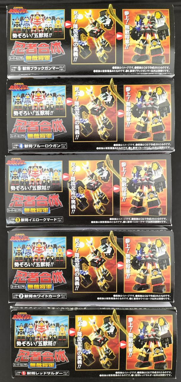 スーパーミニプラ商品アンケートでも大人気の無敵将軍がスーパーミニプラで登場。5体の獣将が忍者合体して無敵将軍になります。 もちろん獣将それぞれの武器や火炎将軍剣も付属。 プレミアムバンダイで発売の隠大将軍&ツバサマルセットのツバサマルと超忍者合体してスーパー無敵将軍を再現可能です。 |