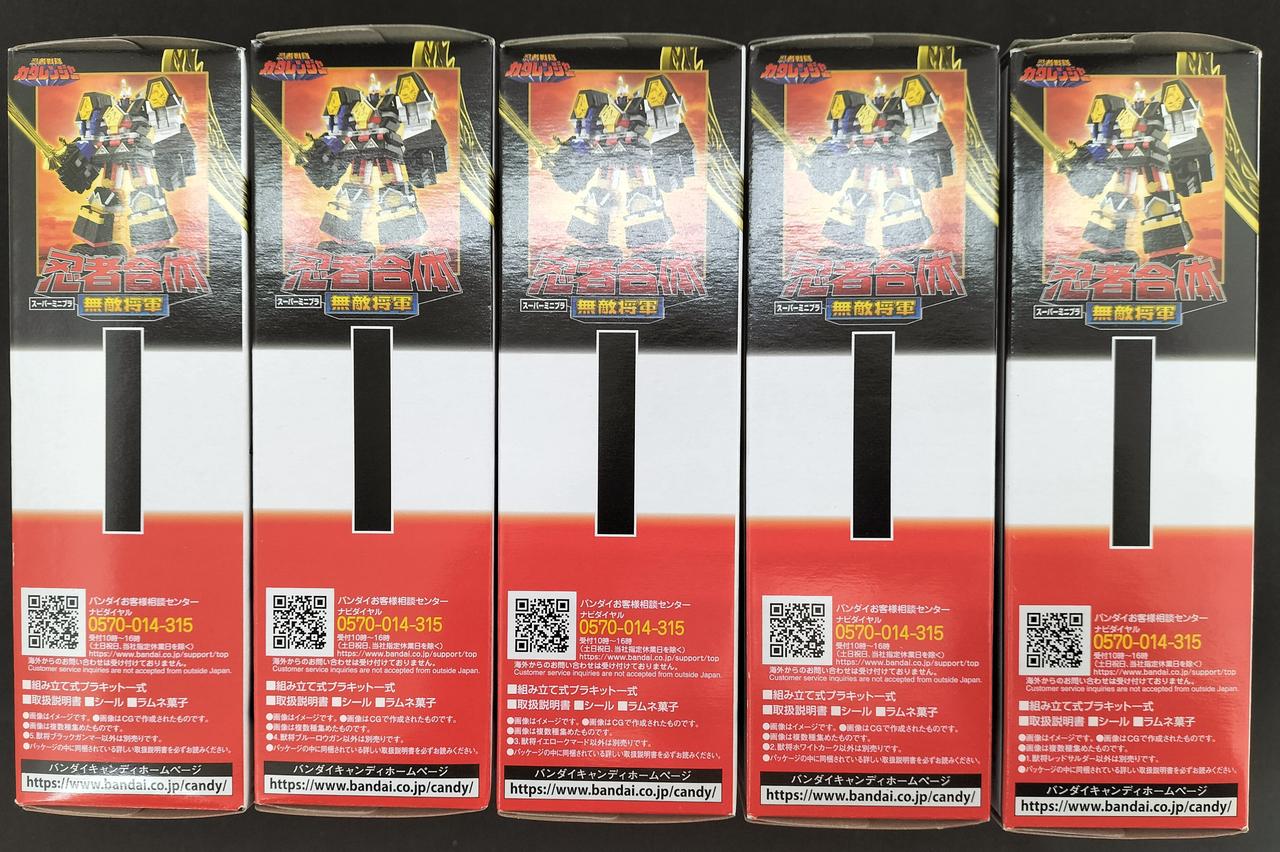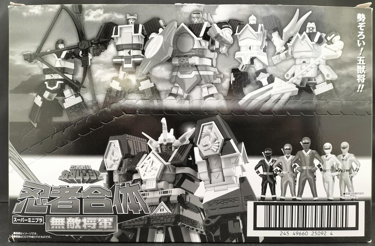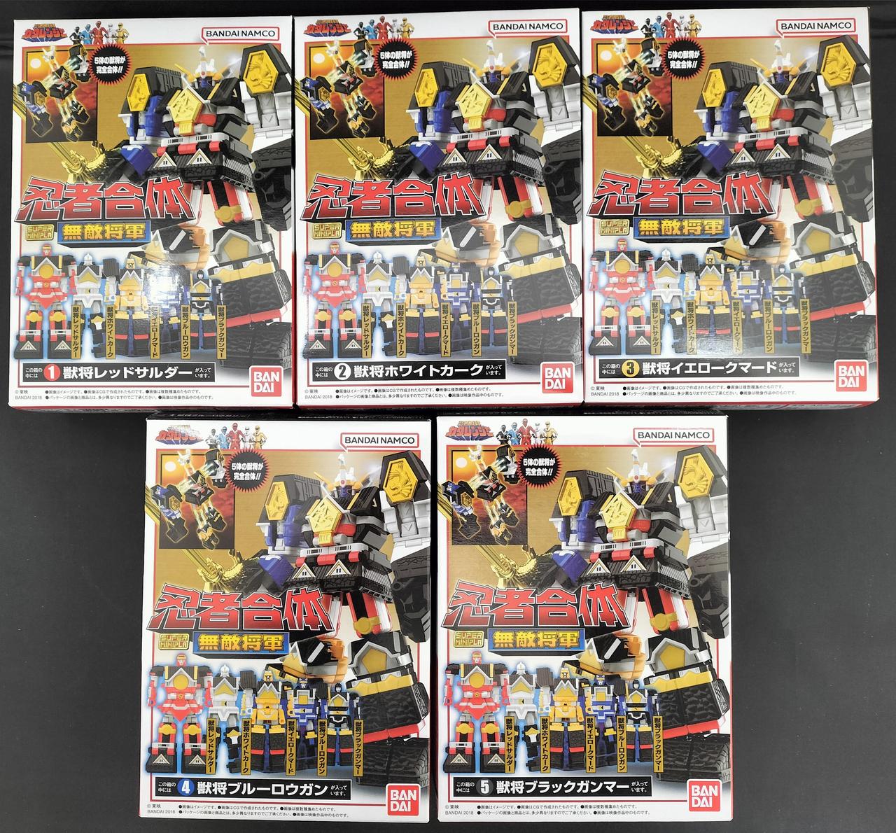 スーパーミニプラ商品アンケートでも大人気の無敵将軍がスーパーミニプラで登場。5体の獣将が忍者合体して無敵将軍になります。 もちろん獣将それぞれの武器や火炎将軍剣も付属。 プレミアムバンダイで発売の隠大将軍&ツバサマルセットのツバサマルと超忍者合体してスーパー無敵将軍を再現可能です。 |