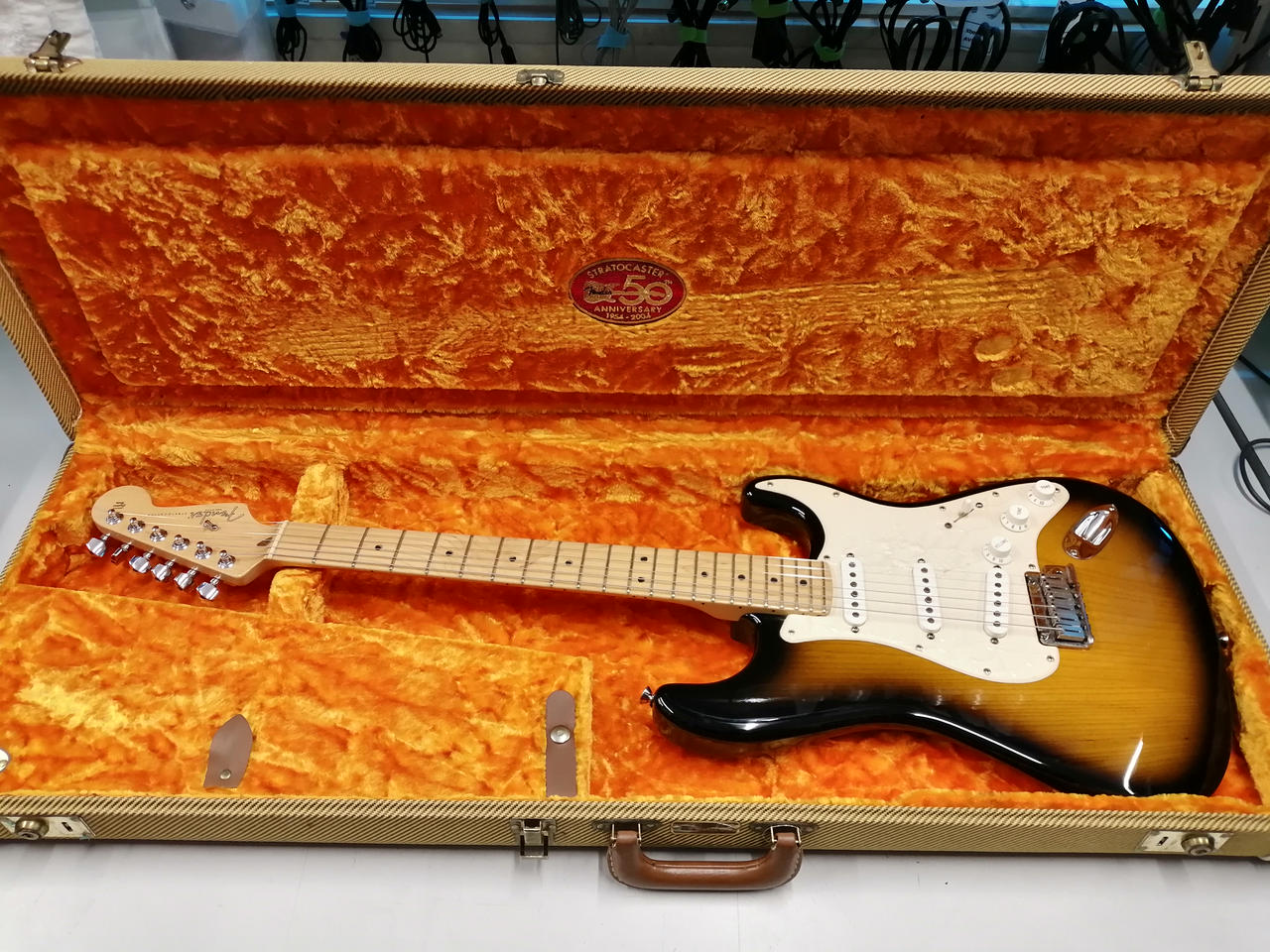 Fender Stratcaster誕生50周年を記念した希少なモデル!ネックプレートやケース内部に限定デザインが施されています。アメリカン・スタンダードシリーズでは珍しいメイプル指板とやや渋めのサンバーストカラーをしており、レトロとモダンを両取りしたスタイル。年式を考慮すればかなり良い状態であり、弾きやすさ・音色共に一級品のオリジナルストラトキャスターです。 |
