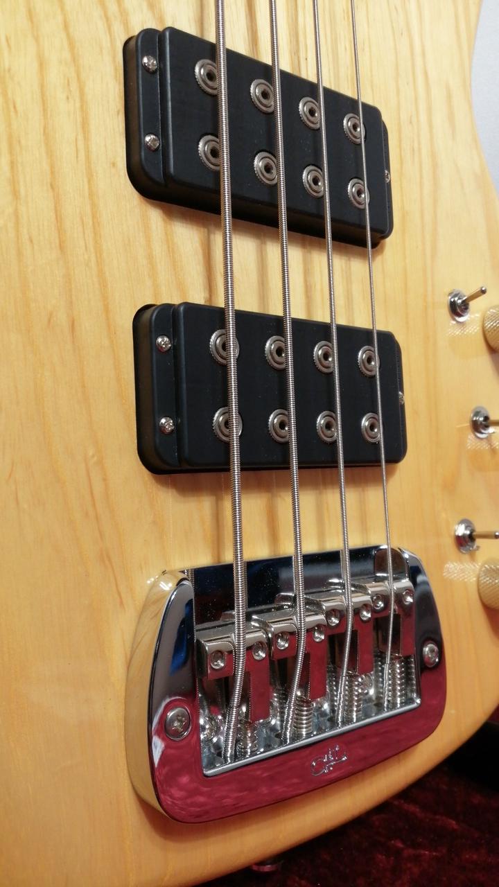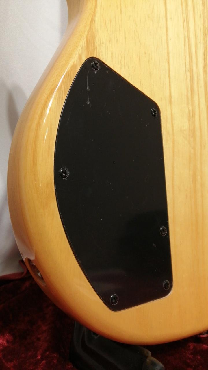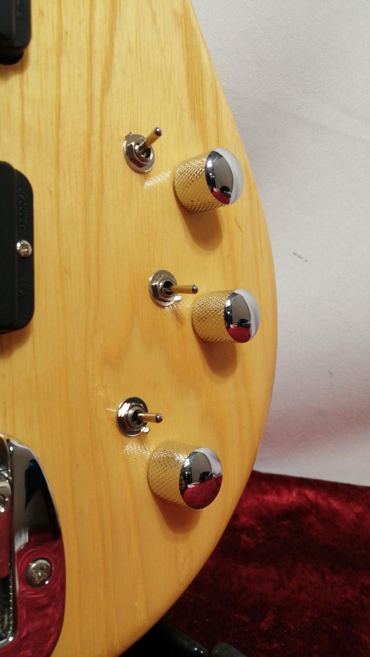 オリジナルハムP.Uに3つのミニSWで、PUセレクト、シリーズ/パラレル配列切替、アクティブON/OFF/トレブルブーストが可能。 |