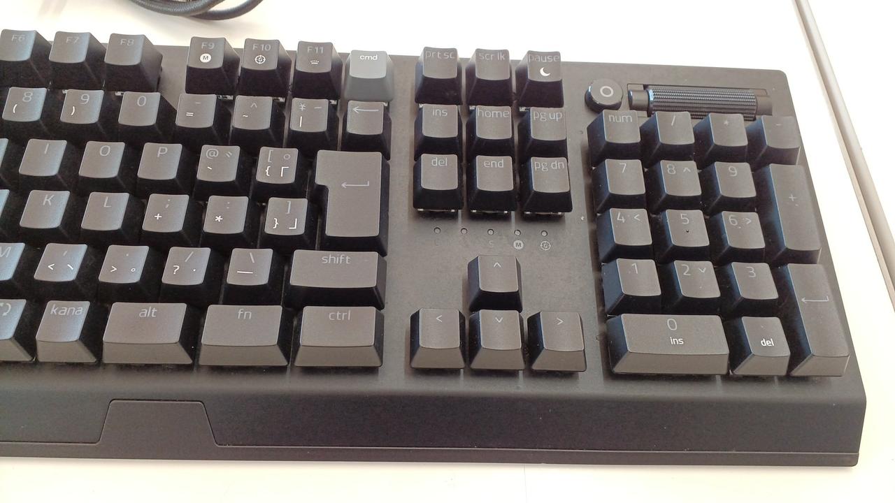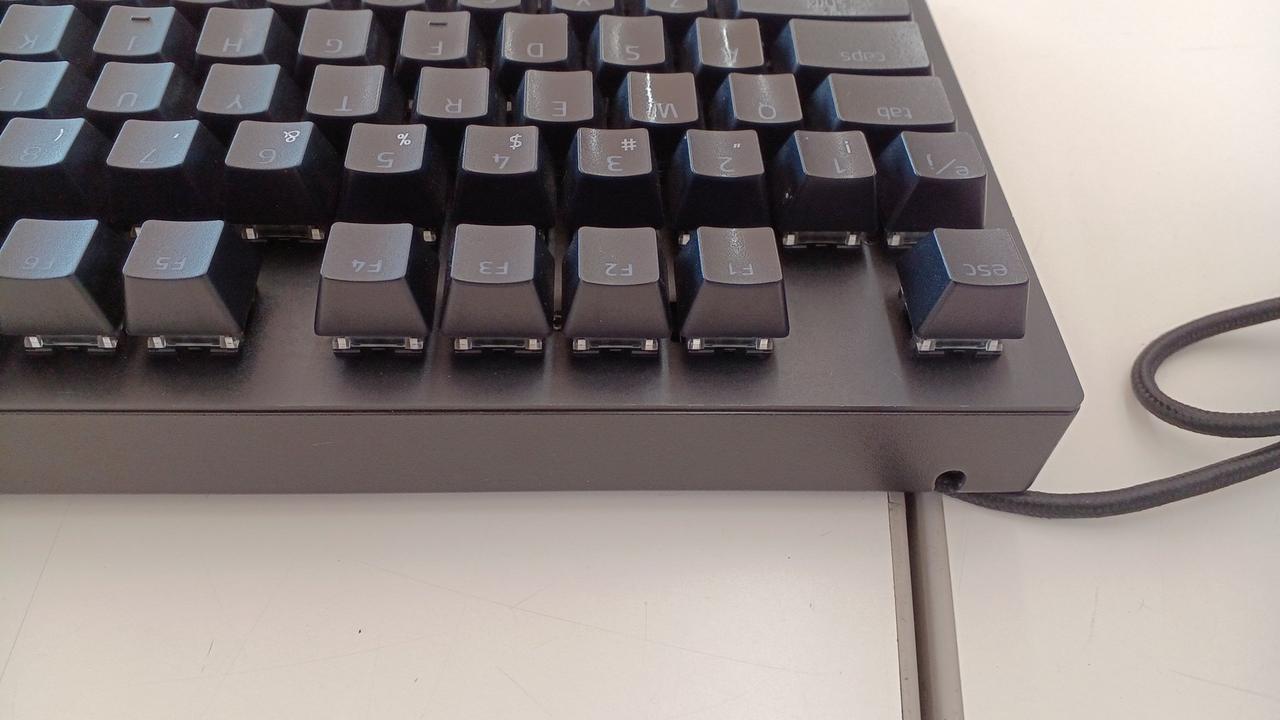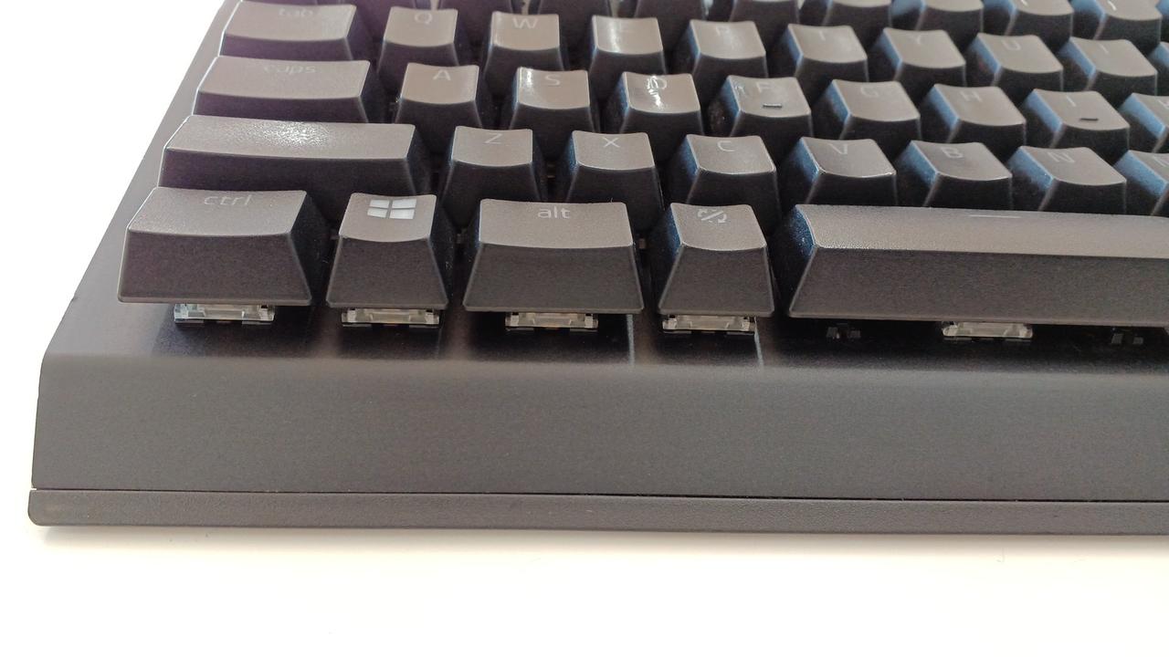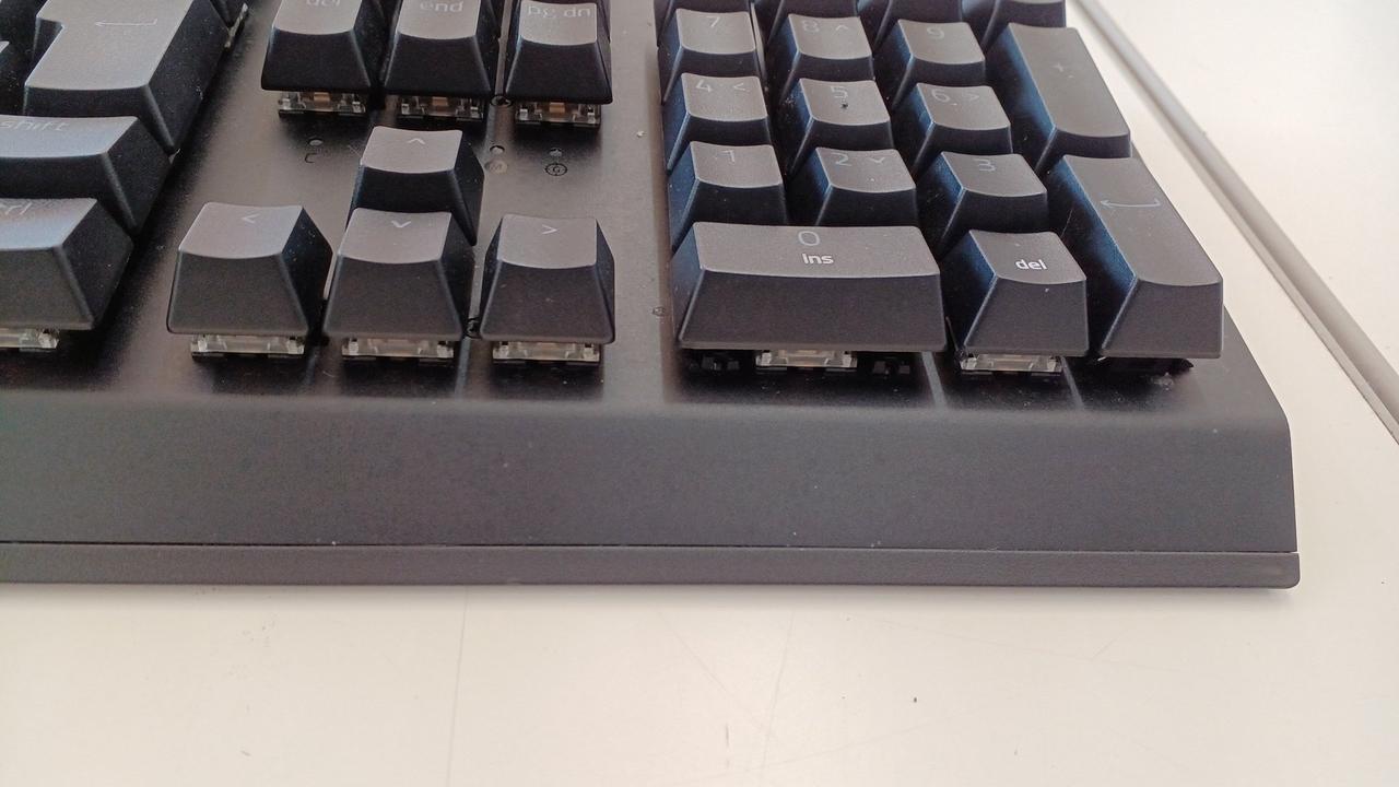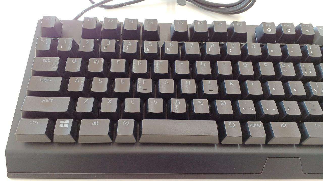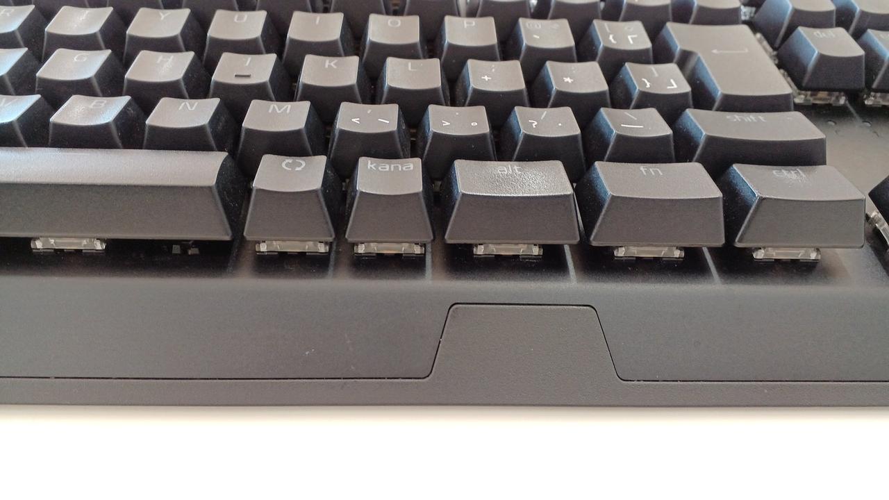 クリック感とタクタイル感のある設計の「グリーンメカニカルスイッチ」を採用した有線ゲーミングキーボード(緑軸)。 |
