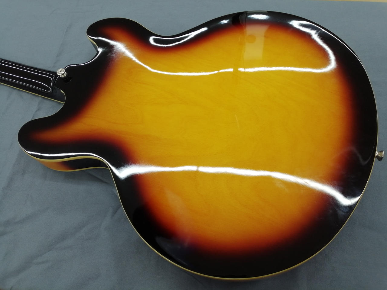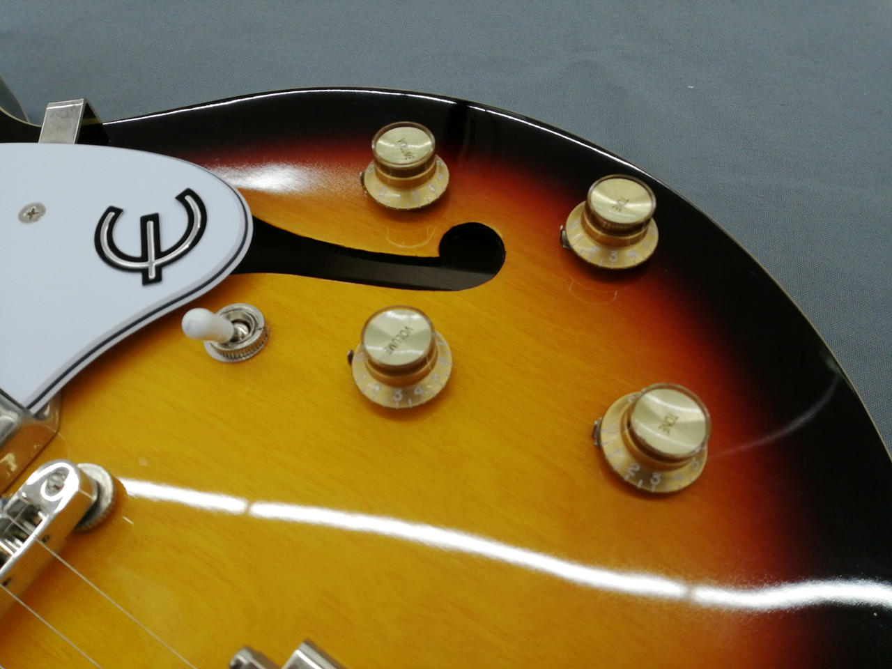 サンバーストに白いピックガードが特徴の一本。 |