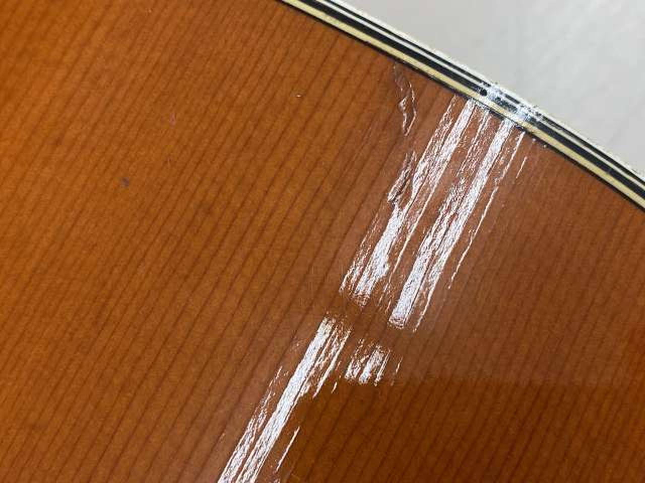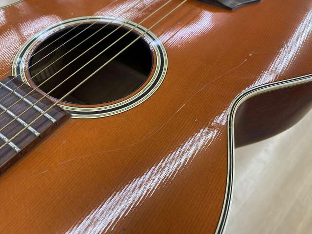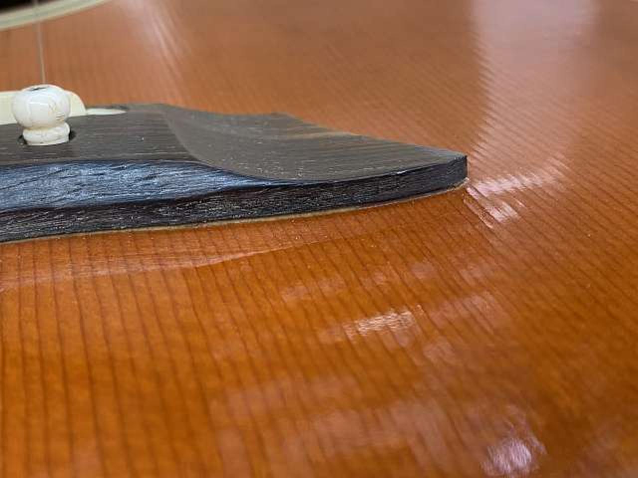 全体的にキズと1弦側ブリッジに少し剥がれとボディトップに膨らみがあります。現状でのお渡しです。 |