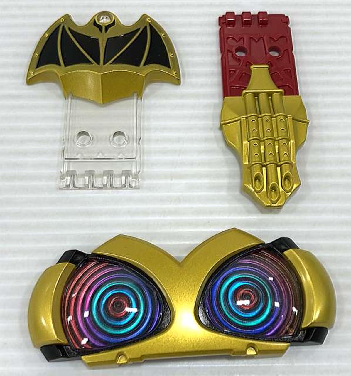 『CSMタツロット』には、タツロット本体と専用台座、別売りの『CSMキバットベルト』に装着可能な交換用アイパーツ(エンペラーver.)、タツロットフエッスルとウェイクアップフエッスル(ザンバットver.)が付属します。 |