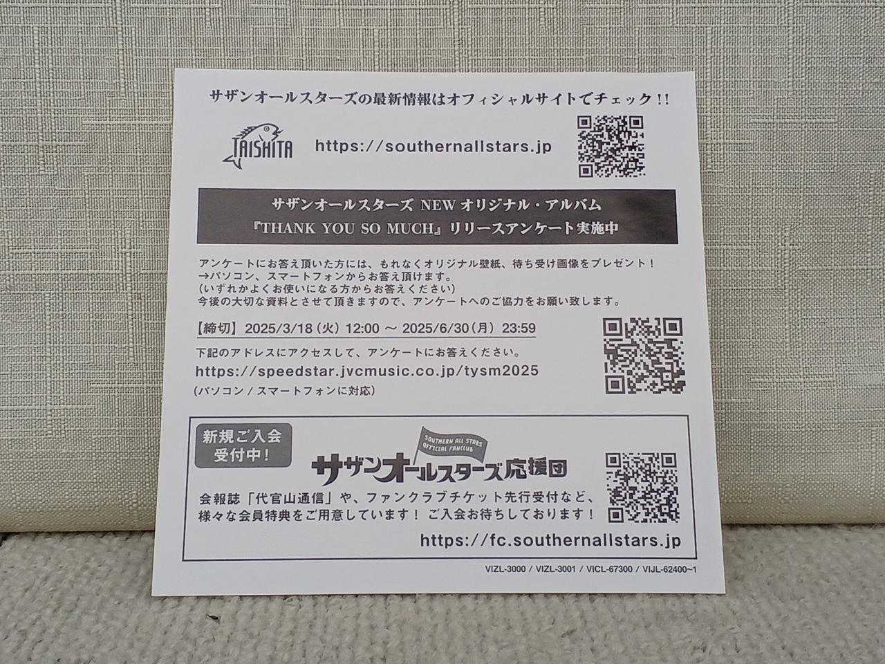 『サザンオールスターズ』10年ぶりの最新オリジナル・アルバム。アンケート用紙、歌詞カード兼ポスター付き。 |