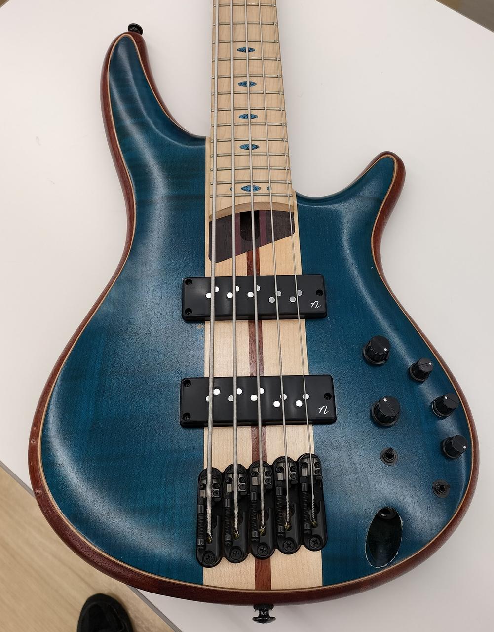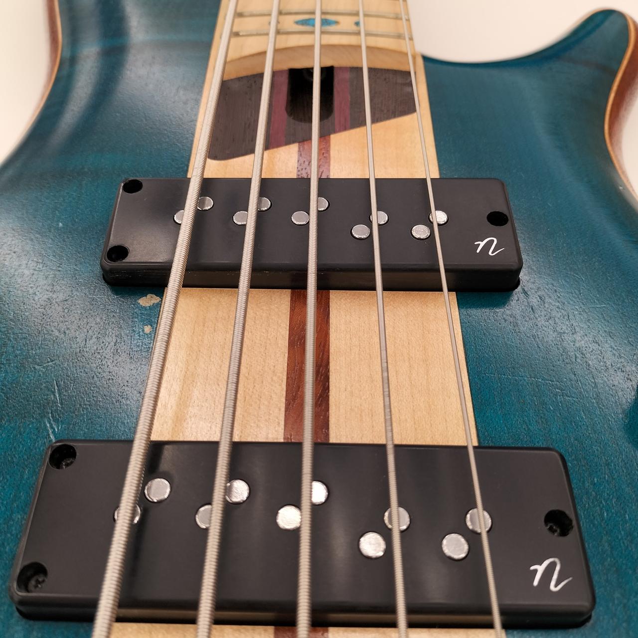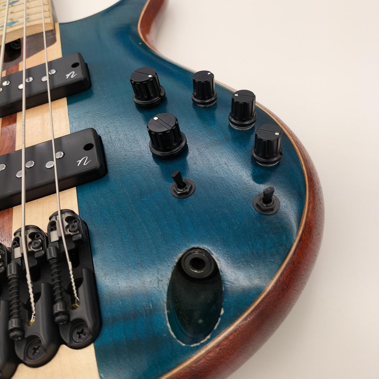 アフリカン・マホガニー材ボディ・バックに、フレイム・メイプル材(ウイング部)、フレイム・メイプル材+ブビンガ材(センター部)のボディ・トップを組み合わせた3次元アーチドSRボディ。ベースサウンドに欠かせなき豊かな中低音域特性、アタック感と歯切れの良い高音域特性を求めたマテリアルチョイスです。 |