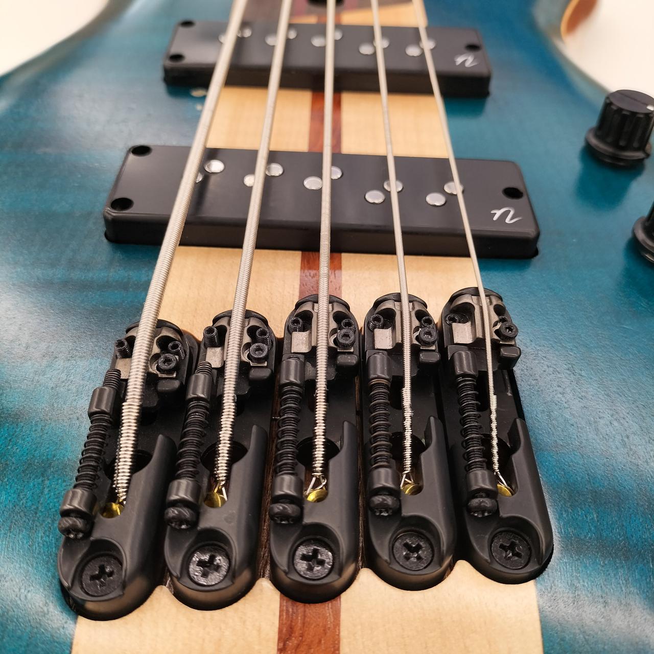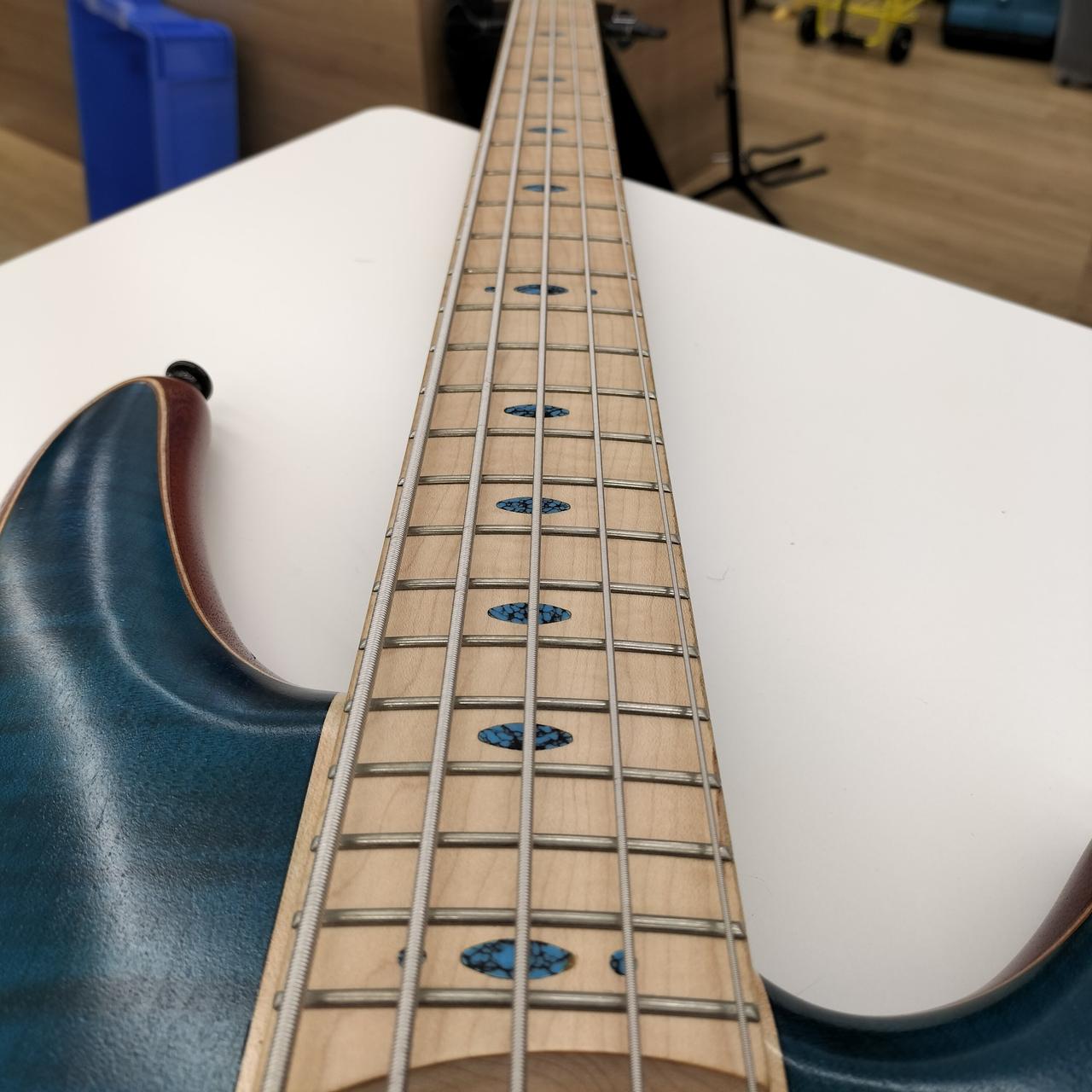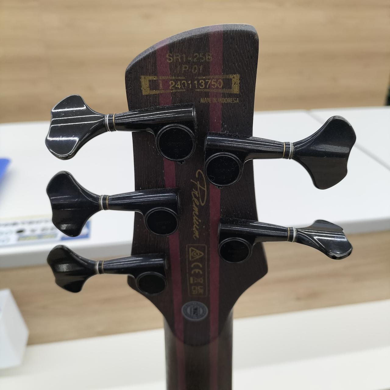 アフリカン・マホガニー材ボディ・バックに、フレイム・メイプル材(ウイング部)、フレイム・メイプル材+ブビンガ材(センター部)のボディ・トップを組み合わせた3次元アーチドSRボディ。ベースサウンドに欠かせなき豊かな中低音域特性、アタック感と歯切れの良い高音域特性を求めたマテリアルチョイスです。 |