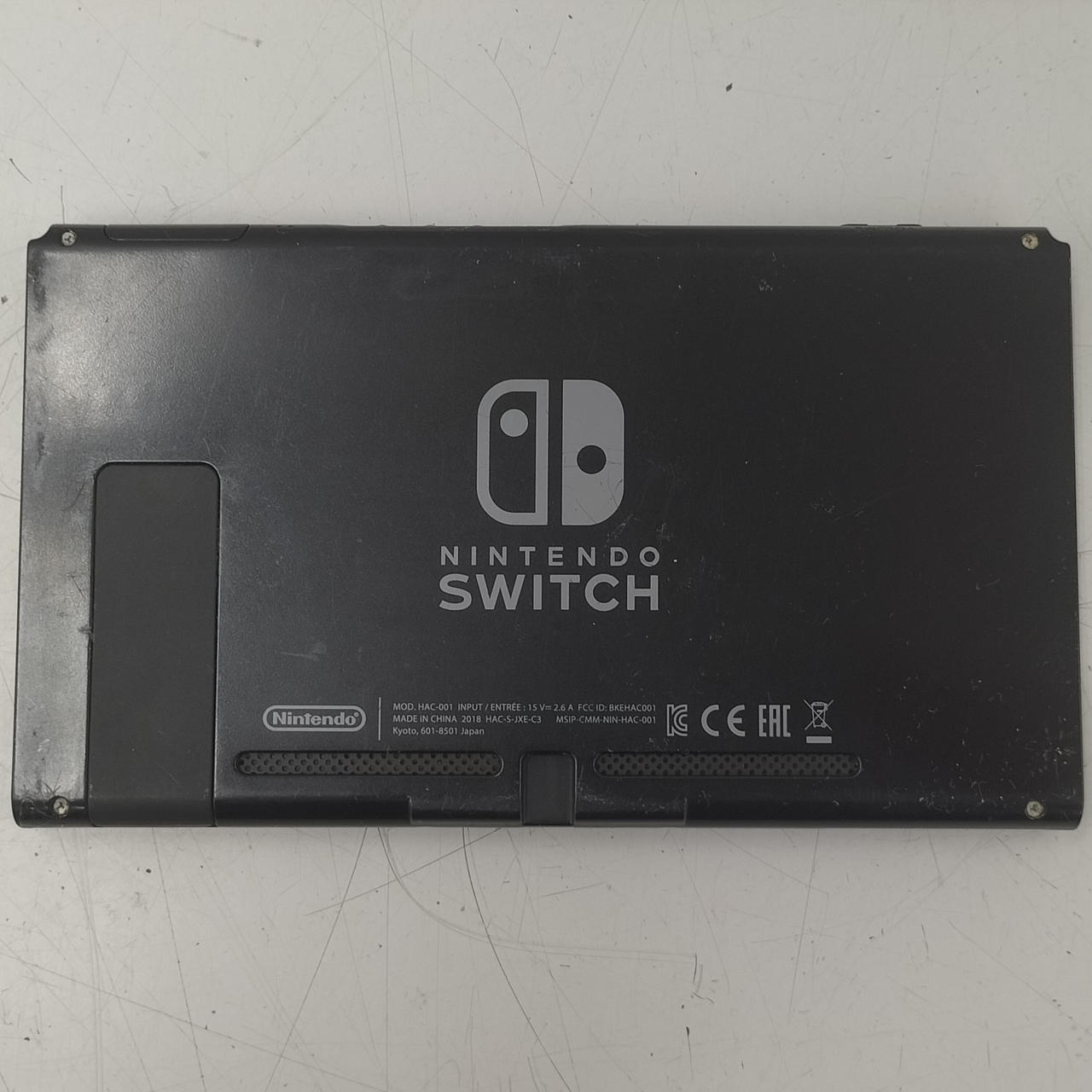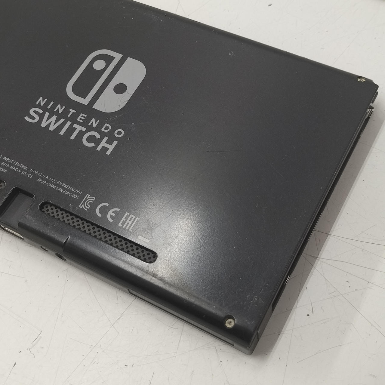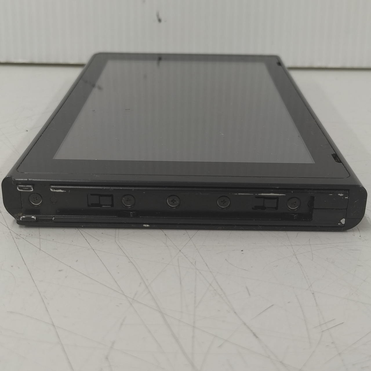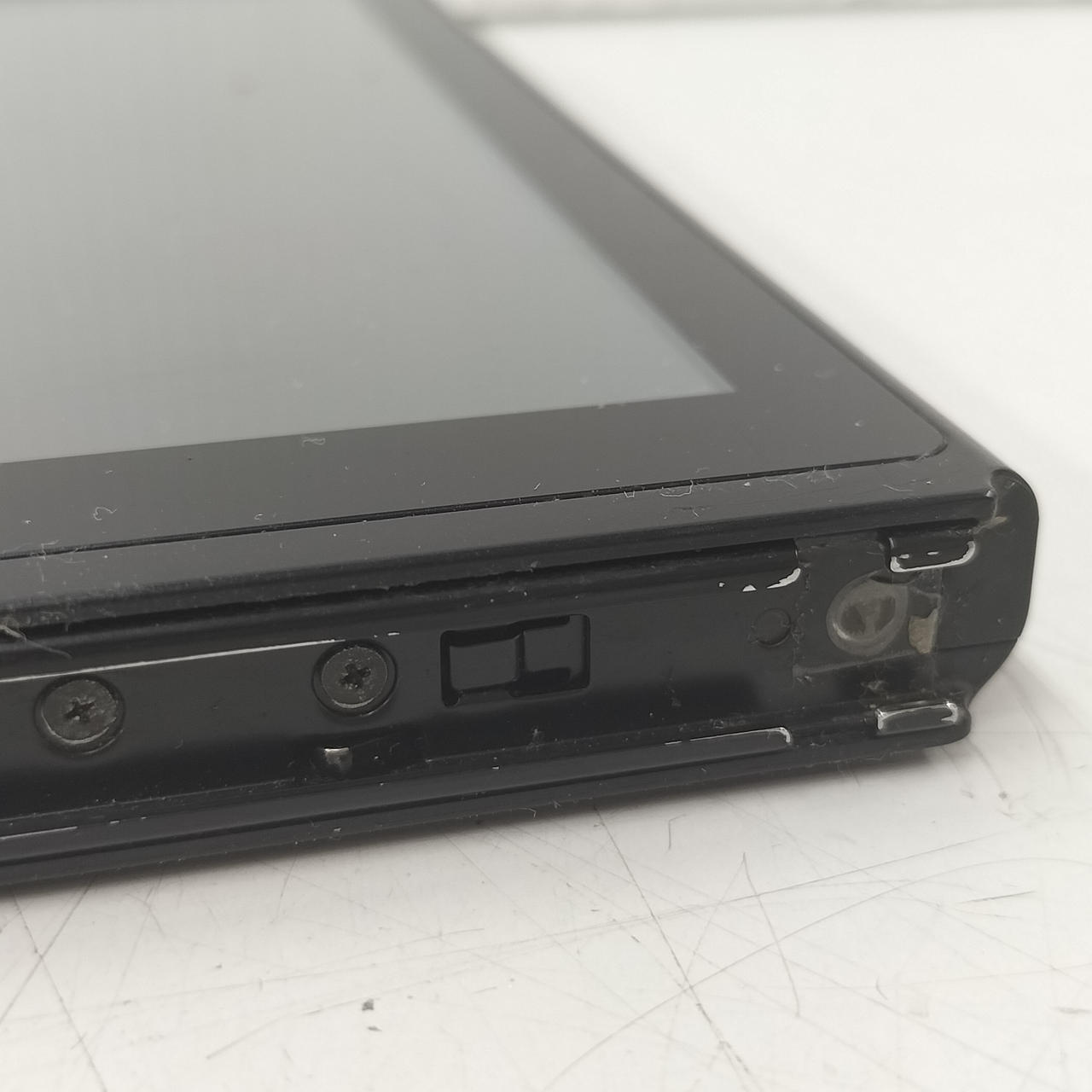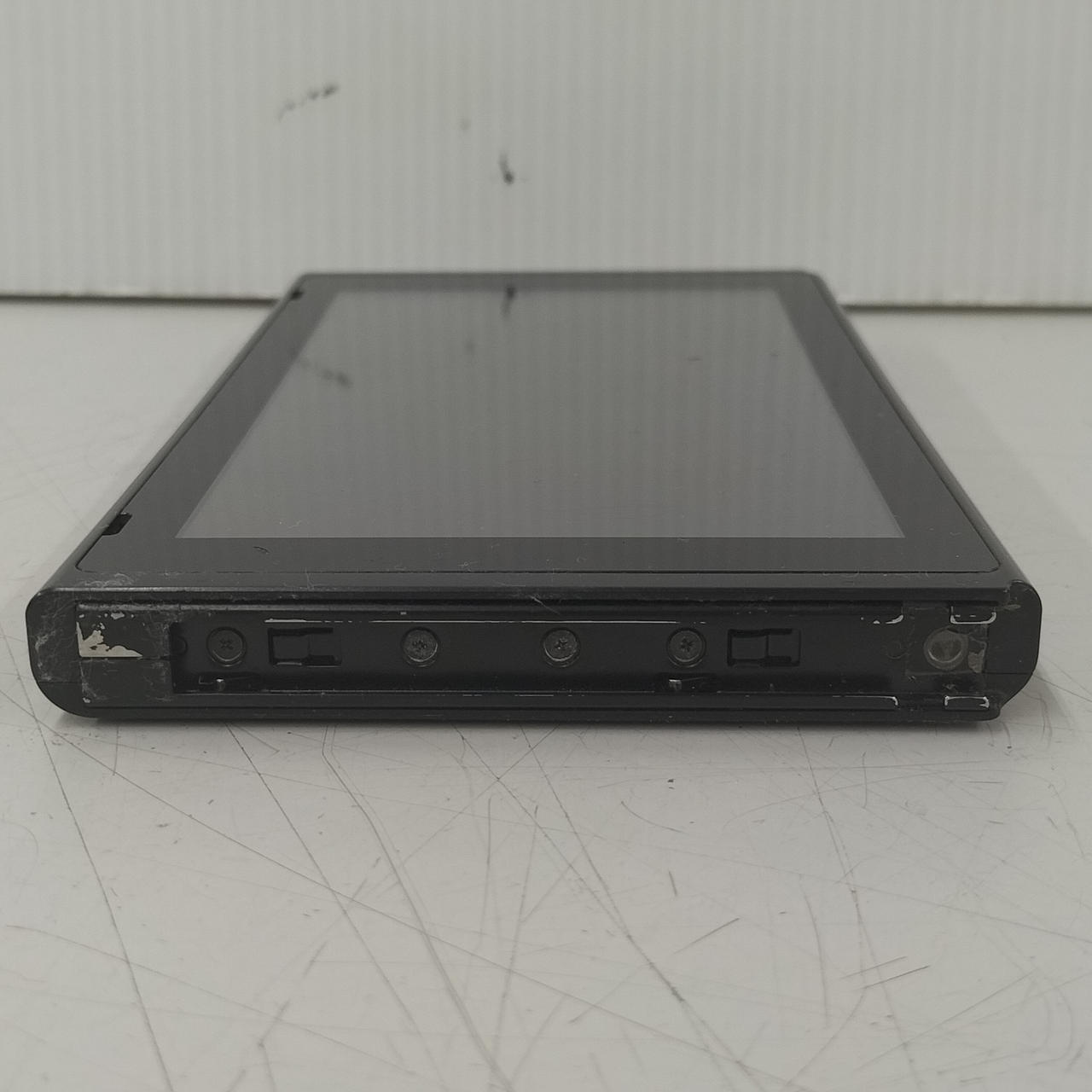 本体歪んでいます。背面を下にして平面な台の上に置くとわかる状態です。左右ともJoy-Con装着時のぐらつきが見られます。 |