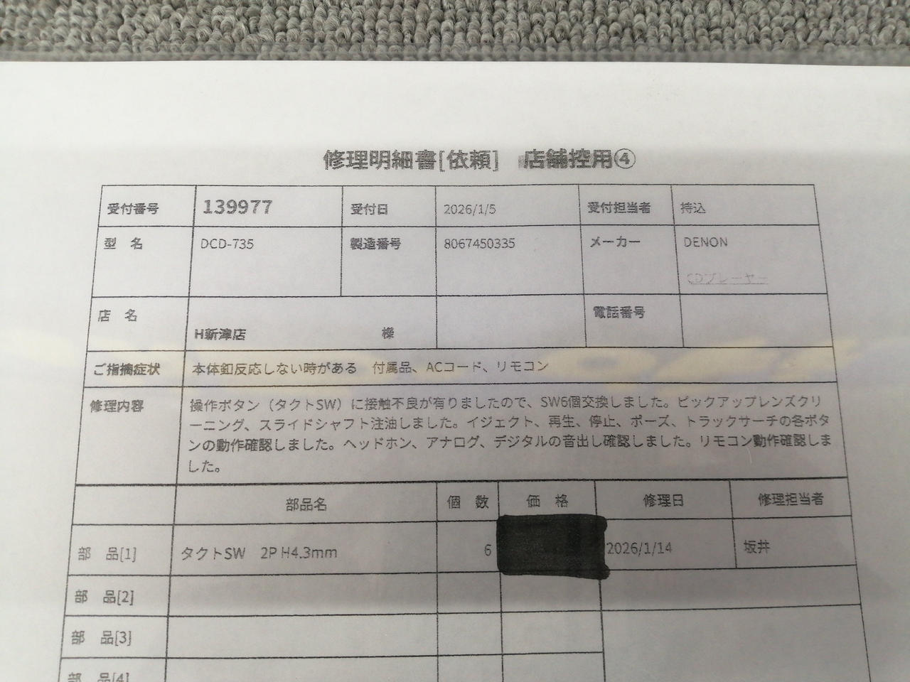 メンテナンス内容:操作ボタン(タクトSW)に接触不良がありましたので、SW6個交換しました。ピックアップレンズクリーニング、スライドシャフト注油しました。イジェクト、再生、停止、ポーズ、トラックサーチの各ボタンの動作確認しました。ヘッドホン、アナログ、デジタルの音出し確認をしました。リモコン動作確認しました。 |