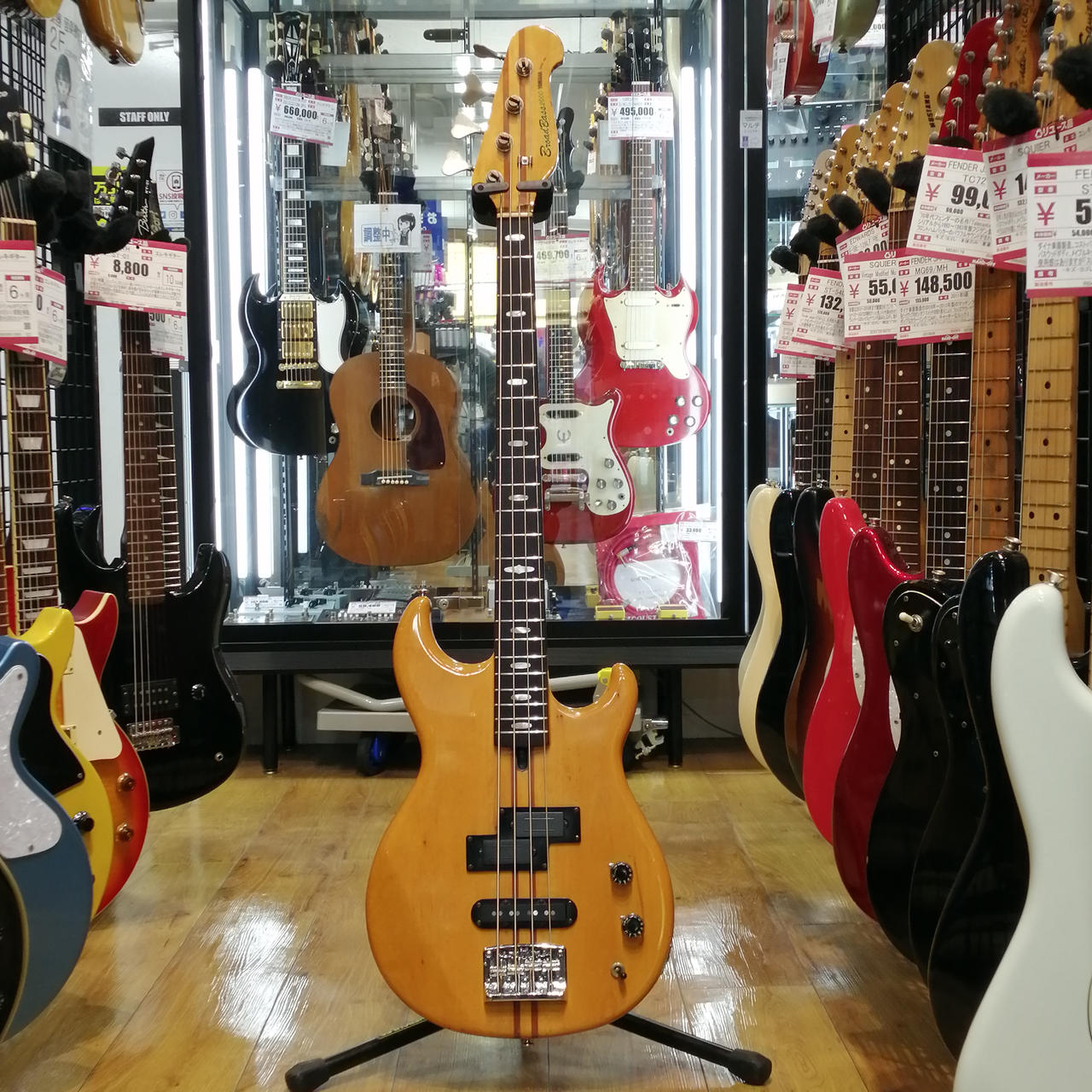 ヤマハの人気シリーズ「Broad Bass」。初年度翌年となる79年製BB2000です。年式を考えるとかなりの美品! |