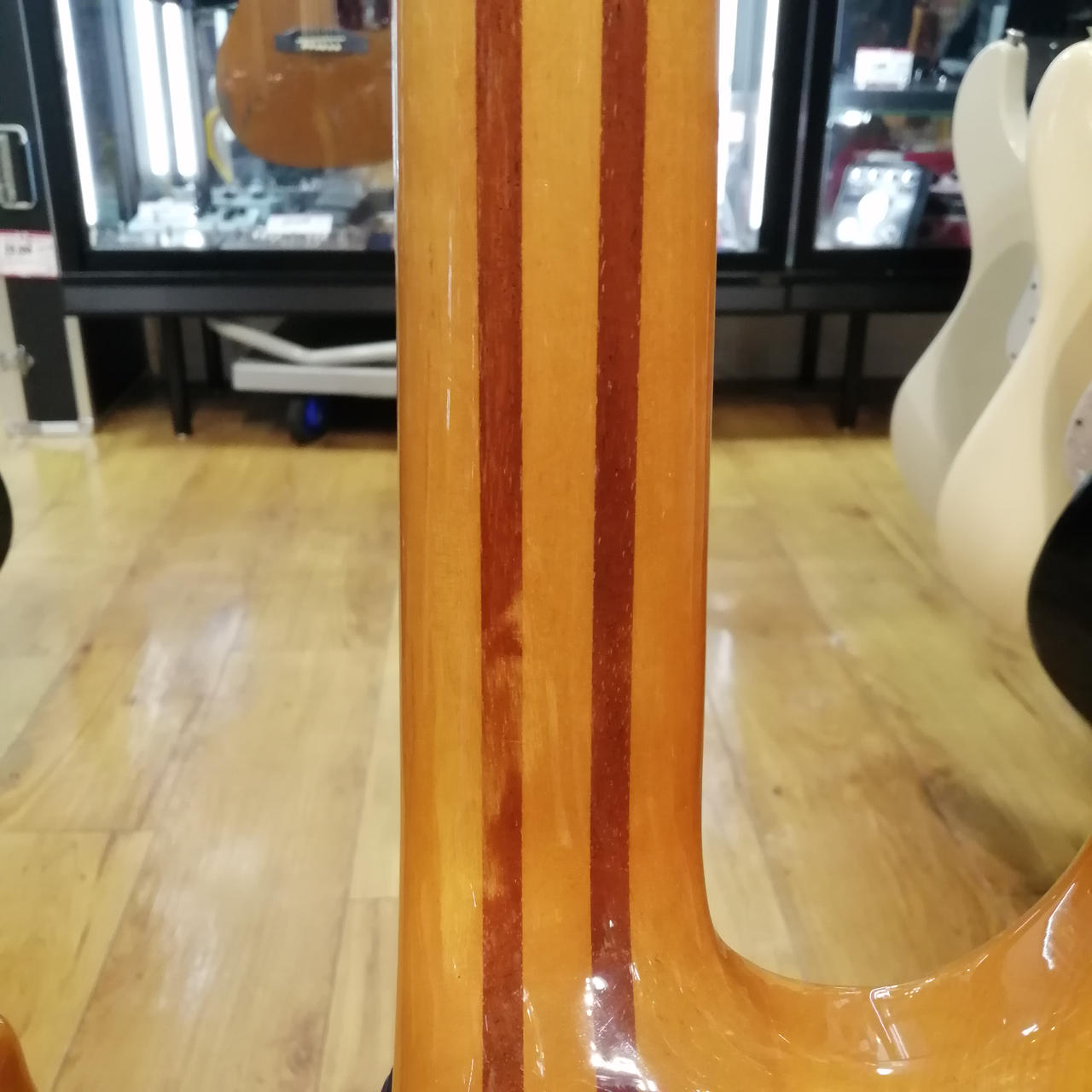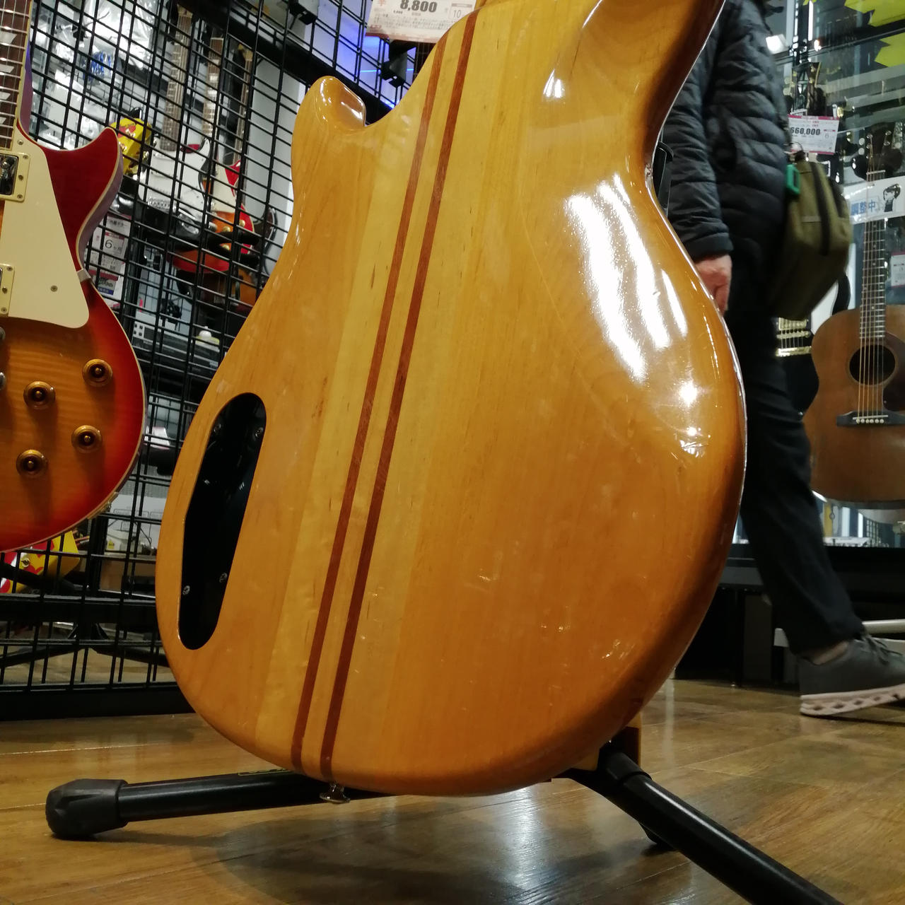 アルダーボディ、メイプル/マホガニー5ピーススルーネック、ストライプドエボニー指板、ピックアップはDiMarzio製に交換されています。 |