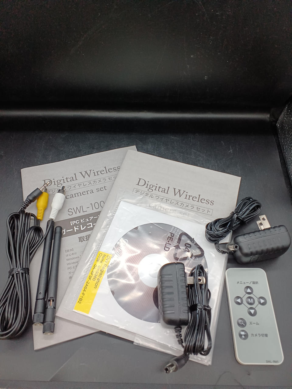 取扱説明書、システムディスク、カメラ、レシーバー、アンテナ2本、電源ケーブル2本、リモコン、映像ケーブル |
