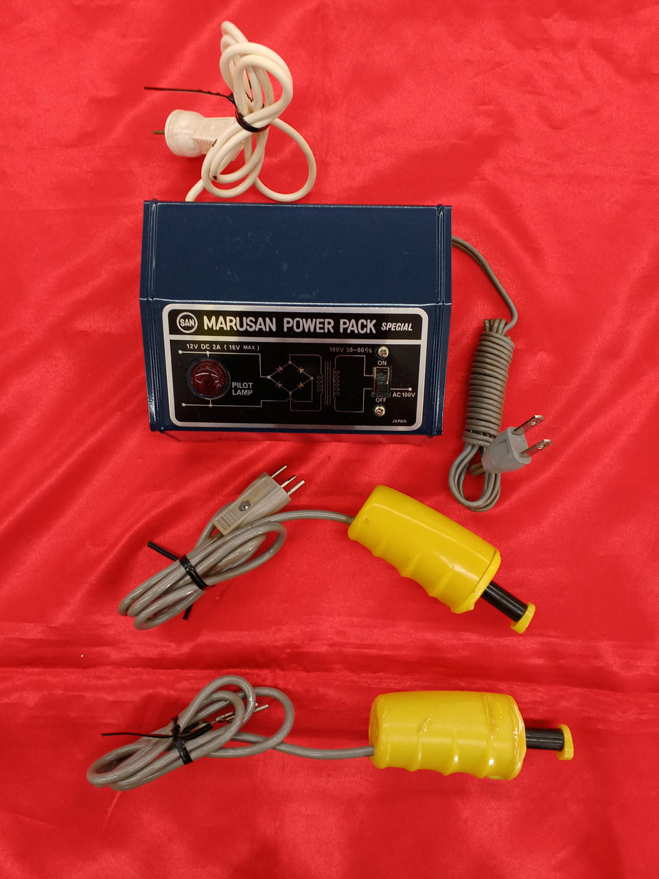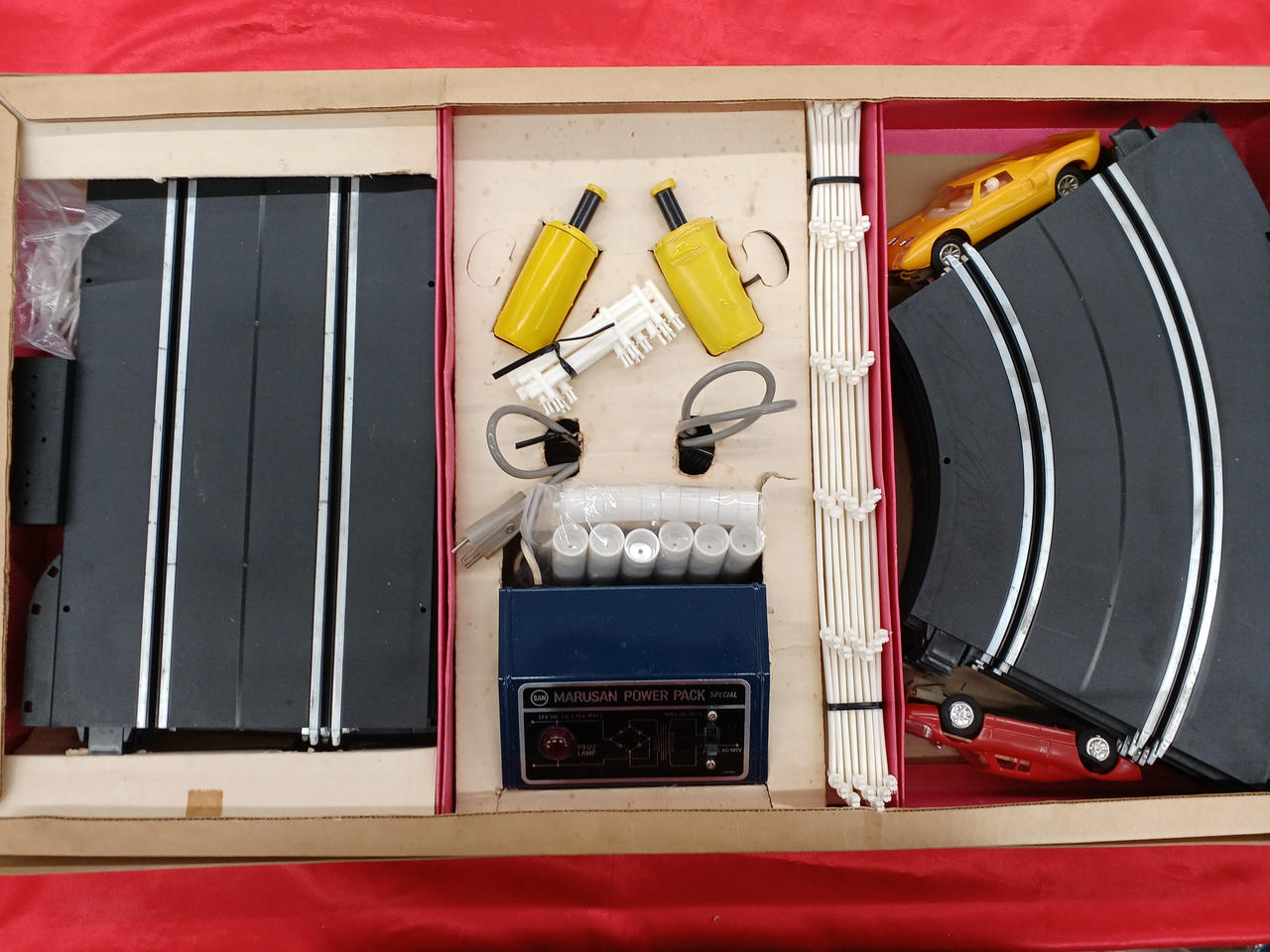 外箱イタミ、劣化、汚れなど。本体通電しました(パワーパック、ターミナルレール、両スピードコントローラー)。ジャンクスロットカー2台おまけで付属します(通電するも走りません)。パーツ取りなどにどうぞ。こちらの商品はエアパッキンを巻いただけの簡易包装での発送となります。予めご了承下さい。 |