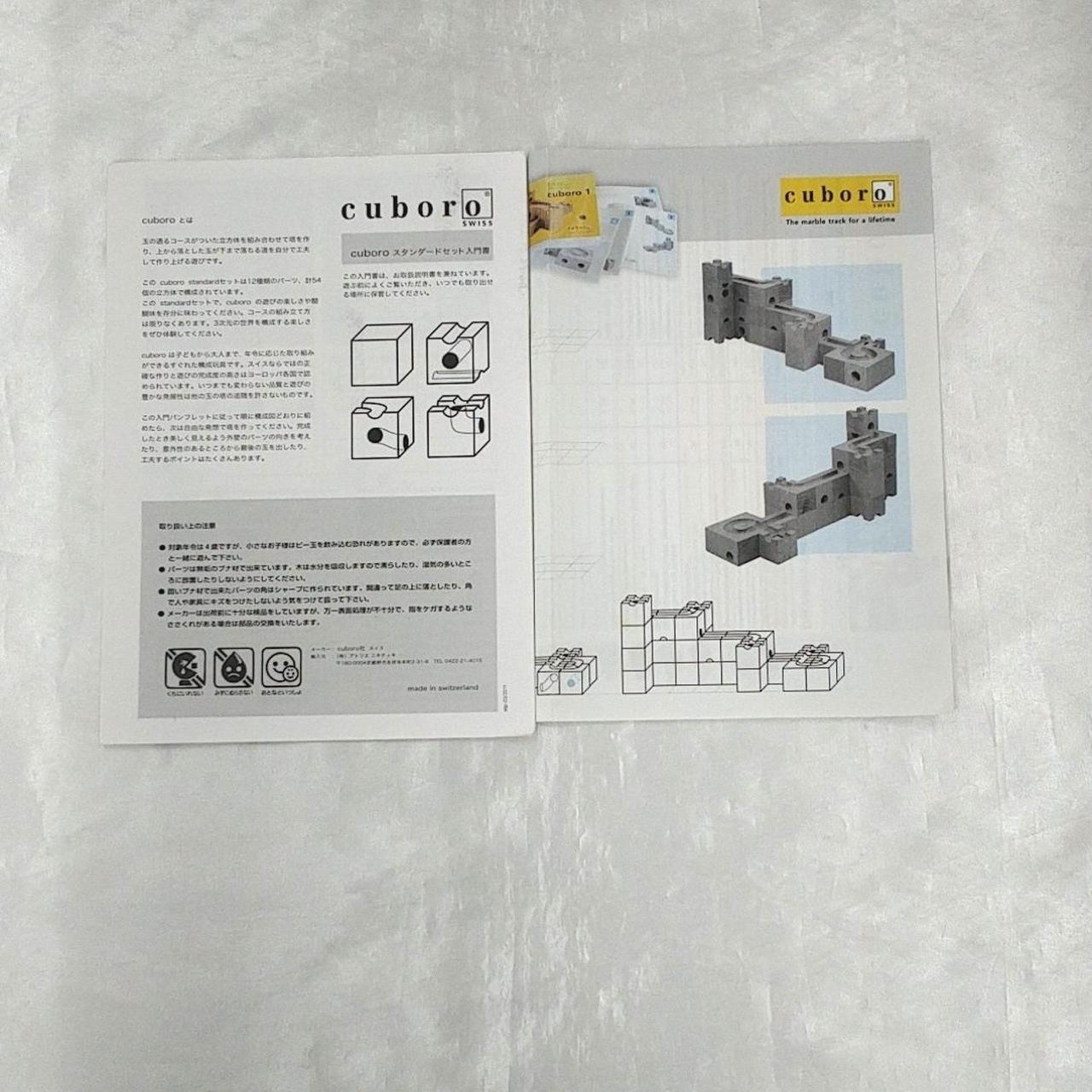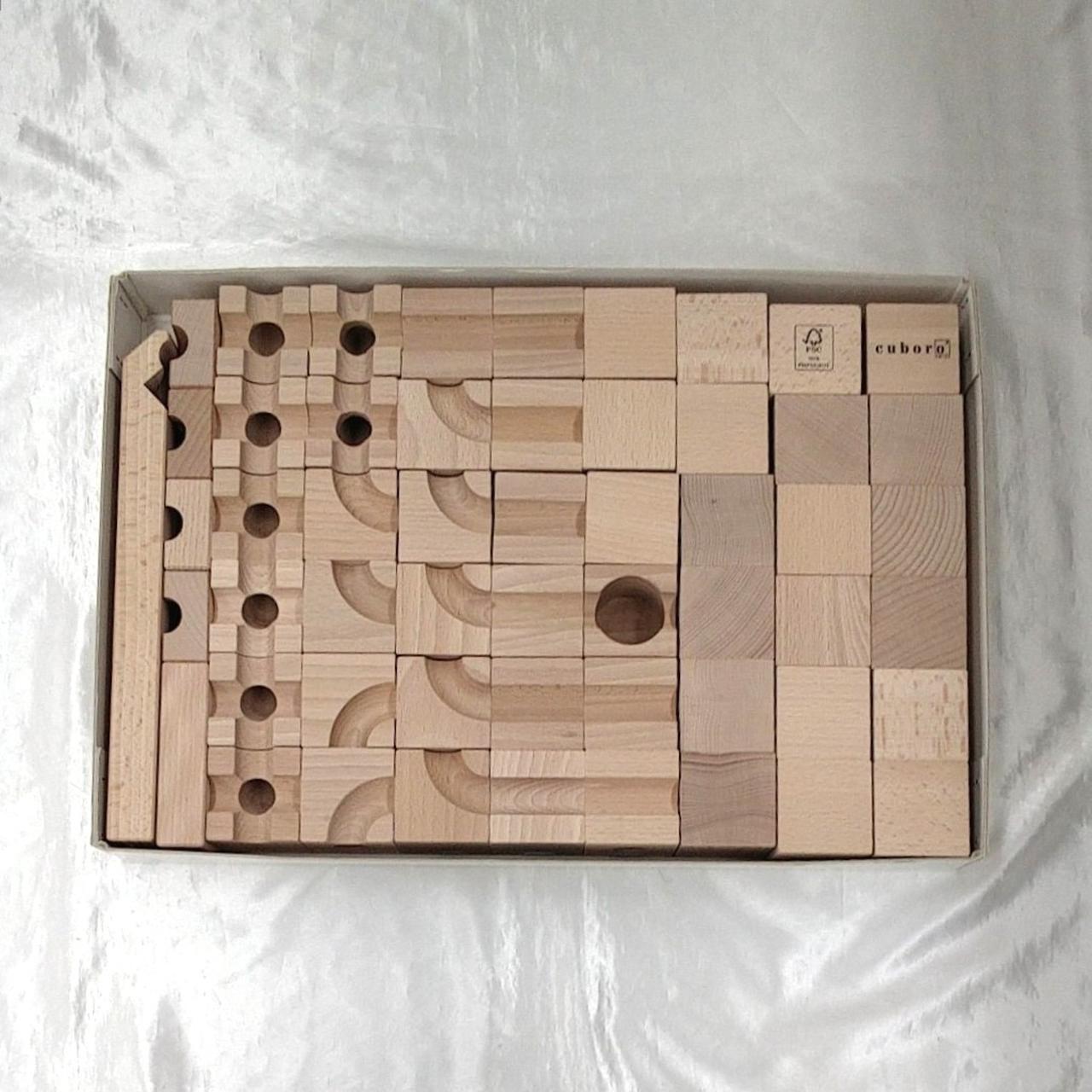 玉が通るコースがついた立方体を組み合わせて塔を作り、上から落とした玉が下まで落ちる道を自分で工夫して作り上げるおもちゃです。このcuboro standardセットは12種類のパーツ、計54個の立方体で構成されています。
