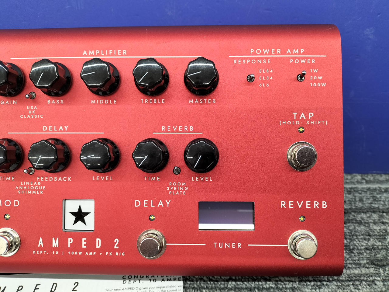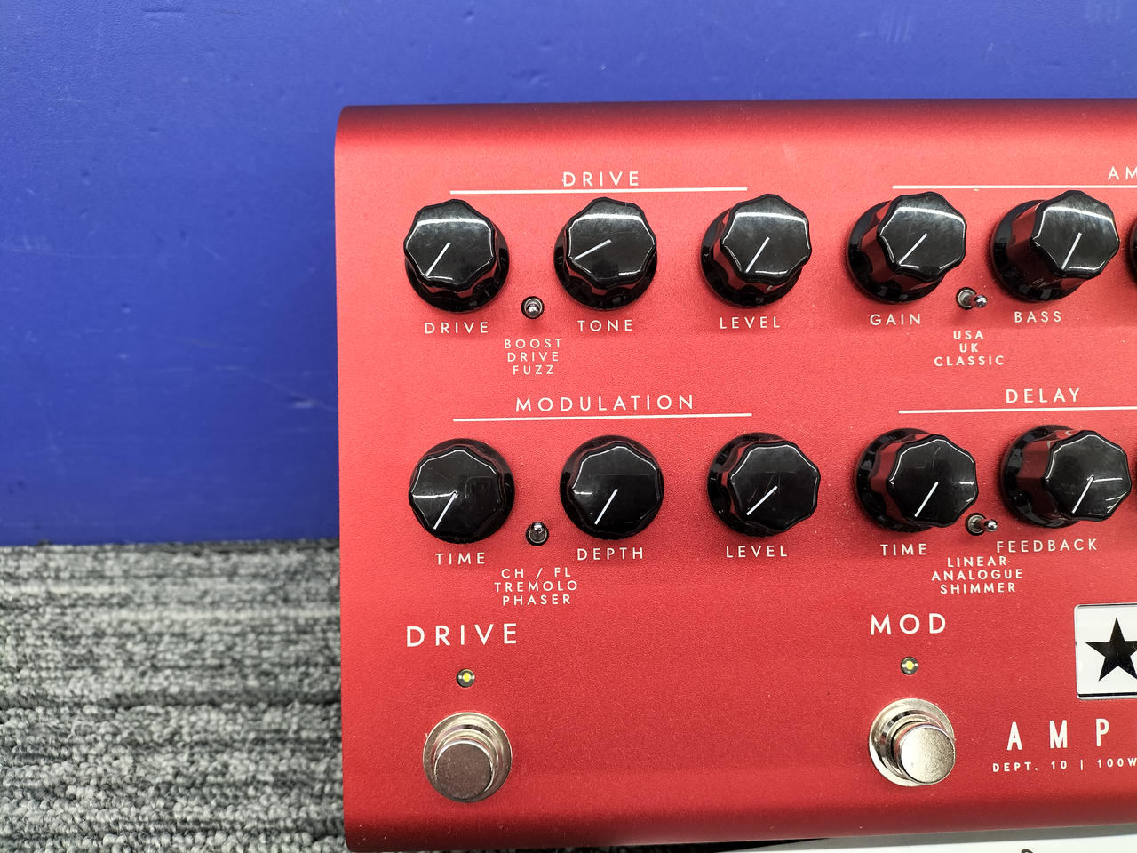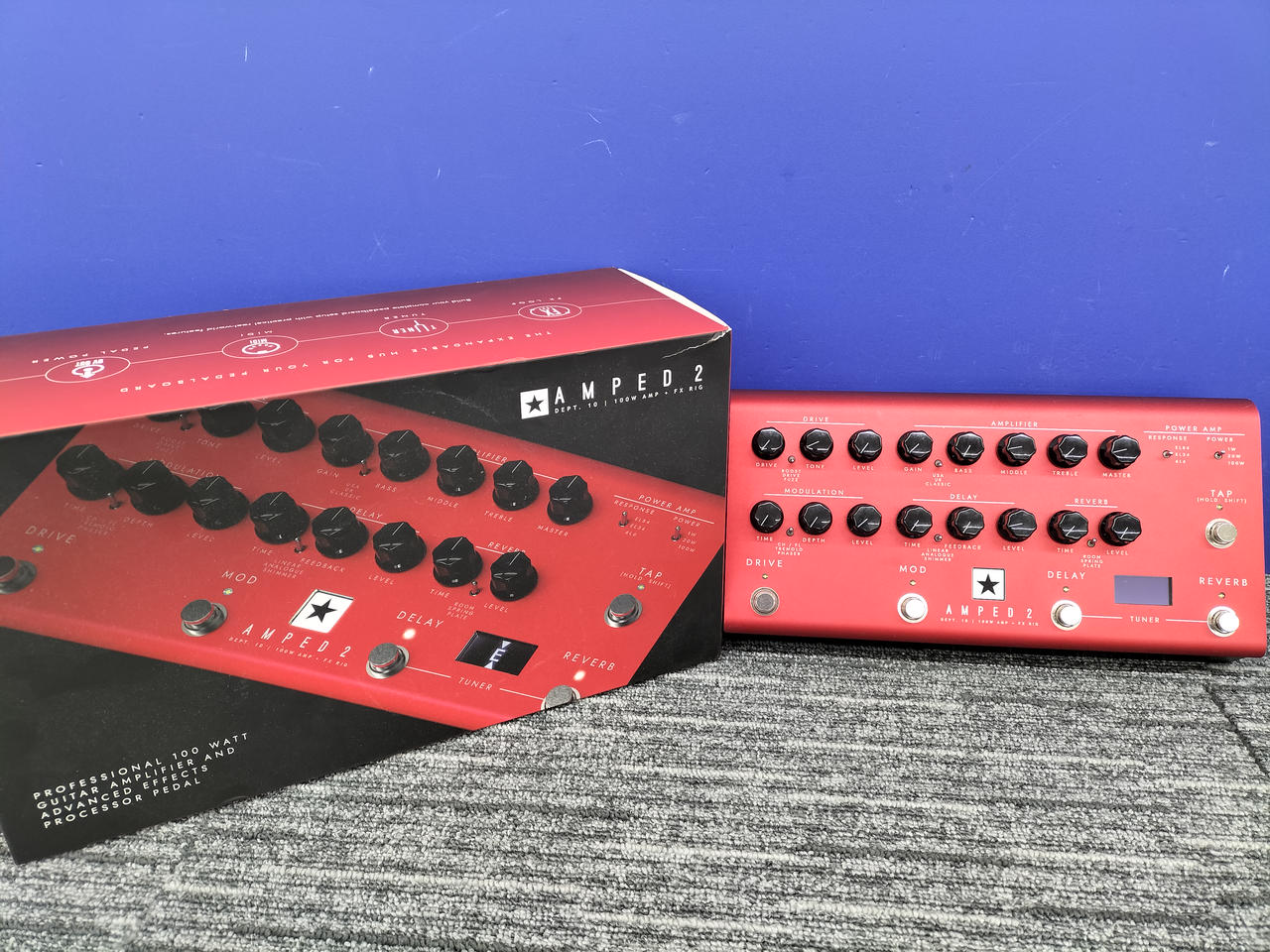 前段にドライブ・セクションを備えた100Wのペダル形アンプ |