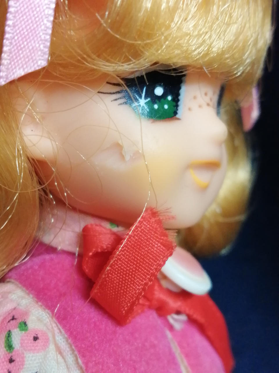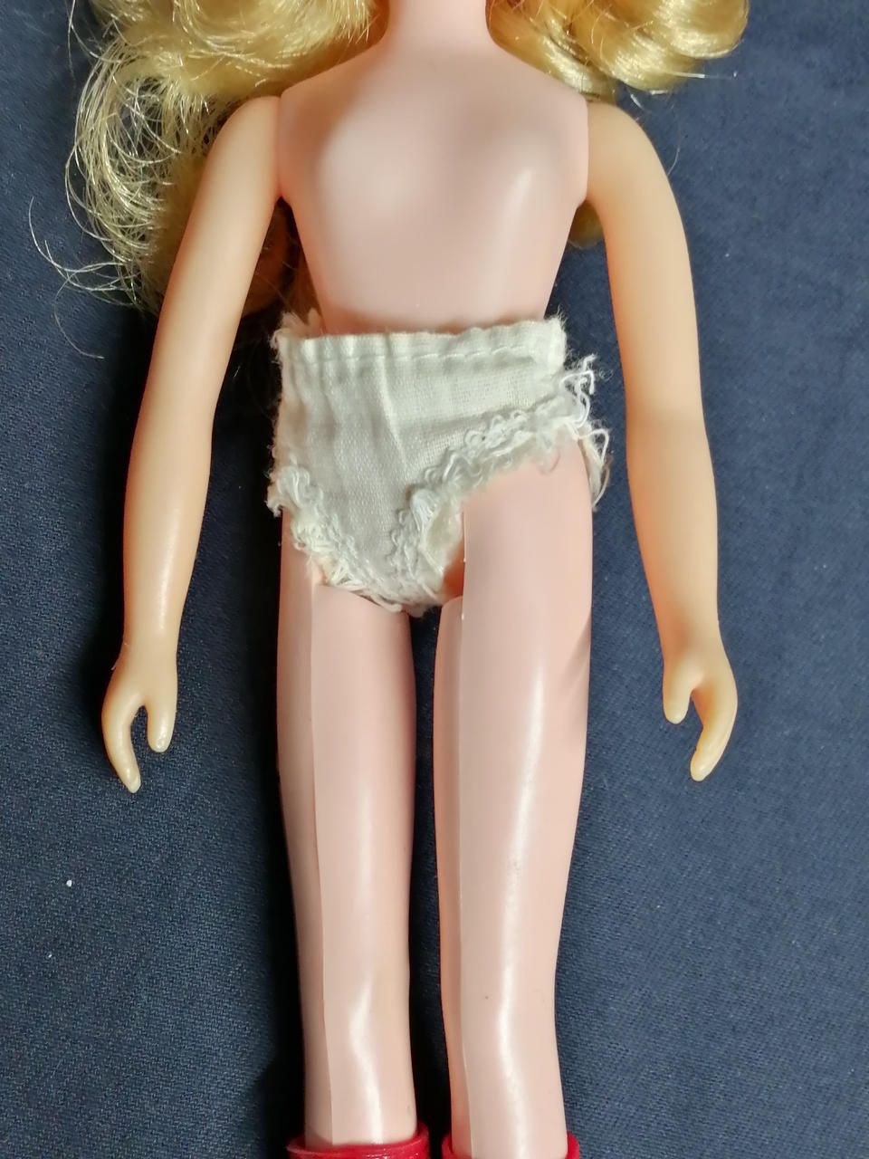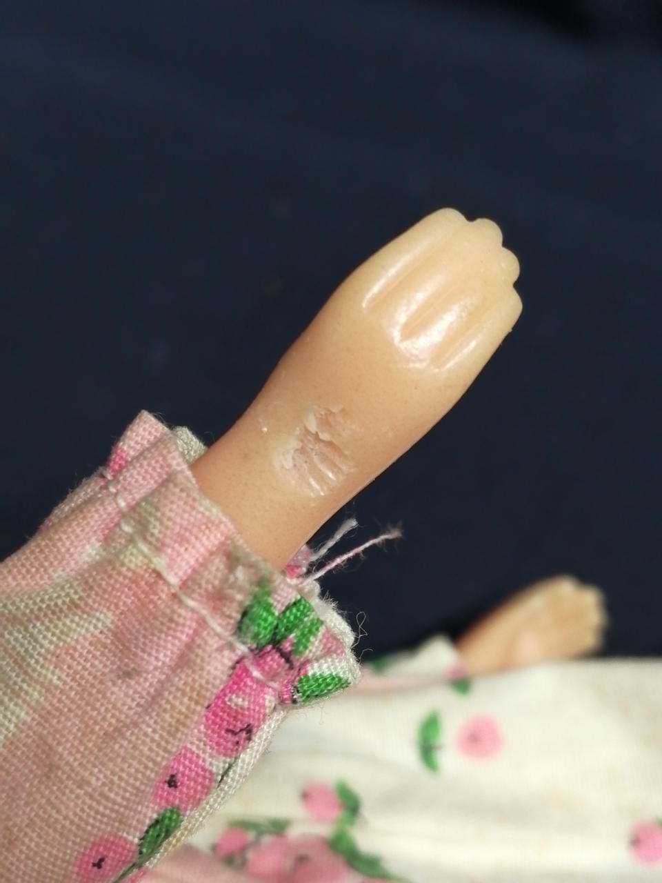 服に汚れ・変色が多数あります。右手の甲・右頬が削られています。左腿の裏に何か刺さったような跡があります。 |