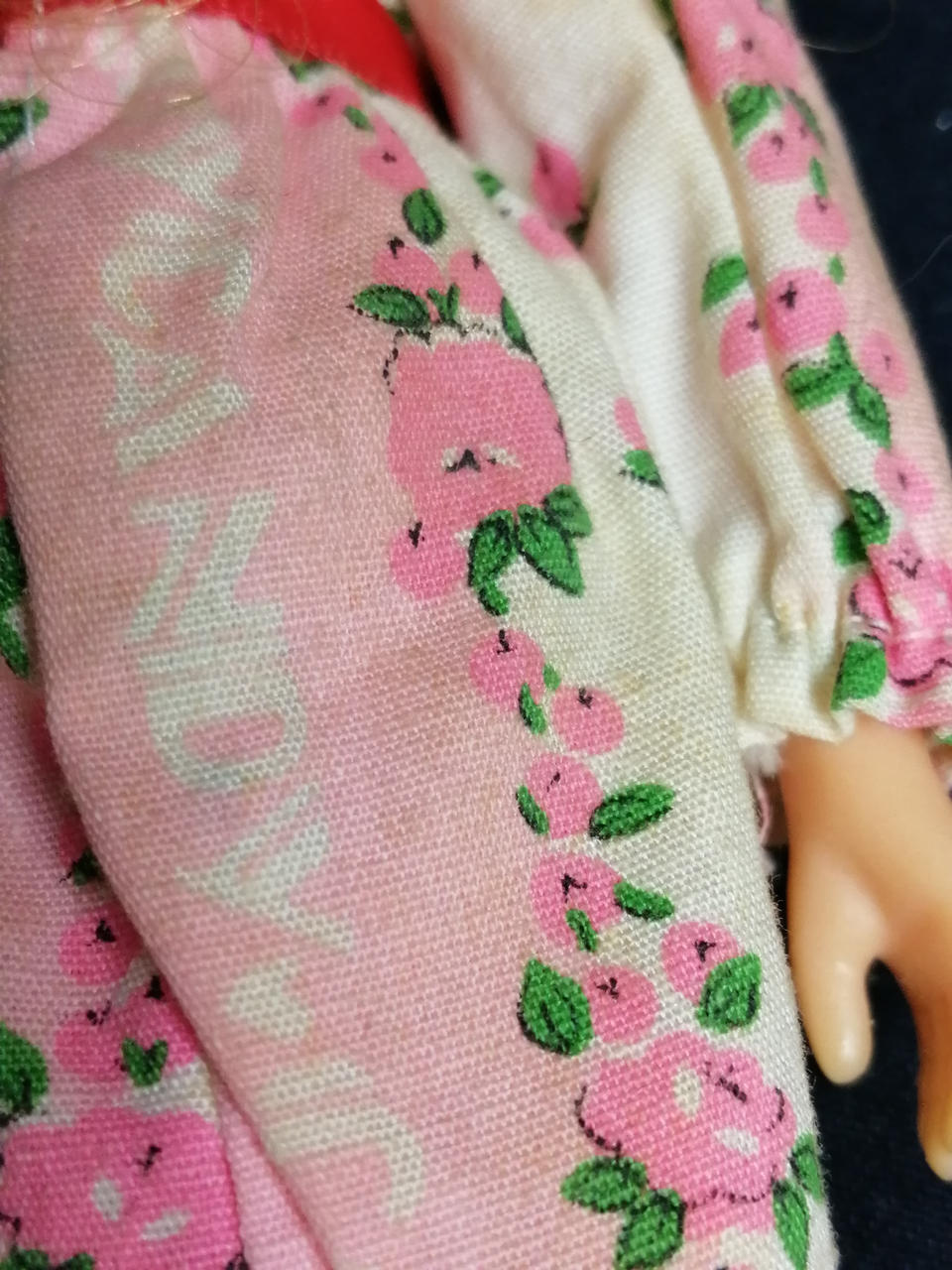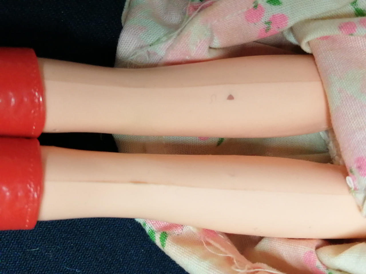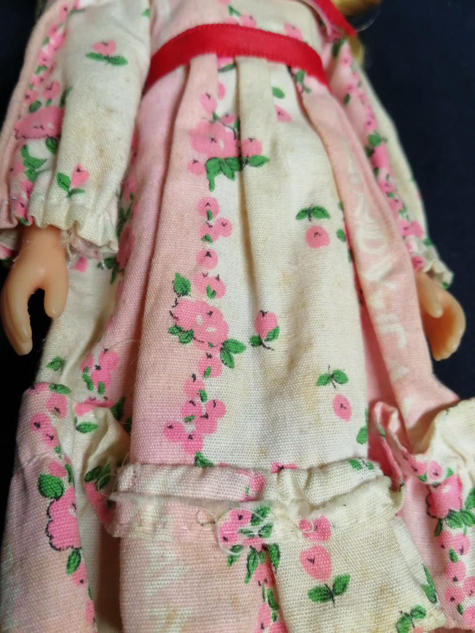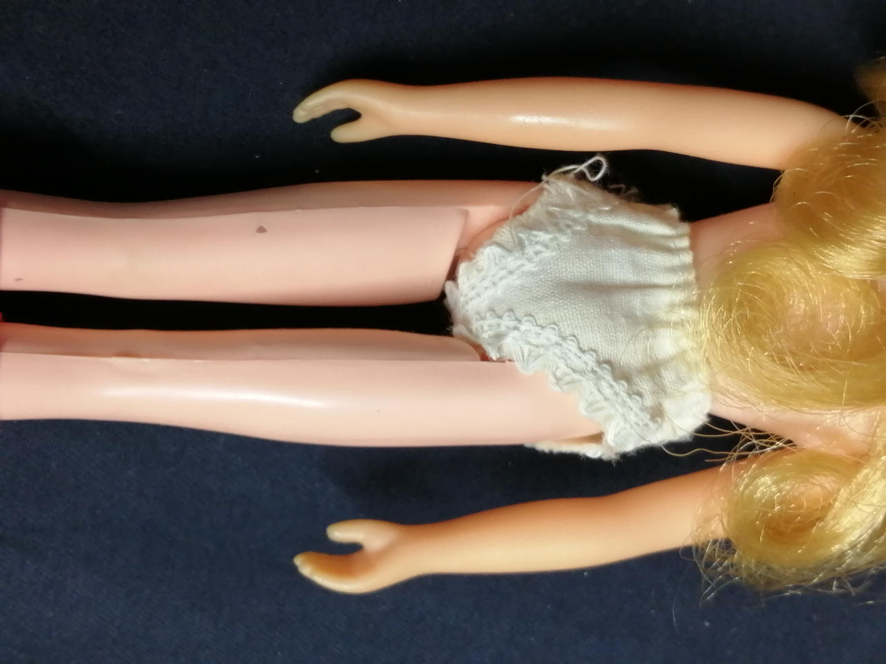 服に汚れ・変色が多数あります。右手の甲・右頬が削られています。左腿の裏に何か刺さったような跡があります。 |