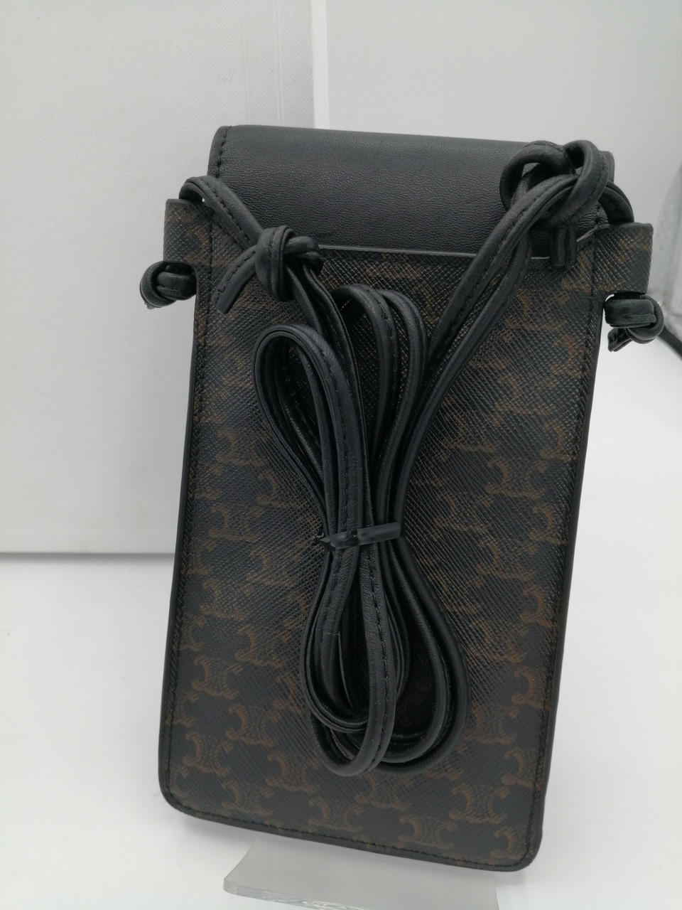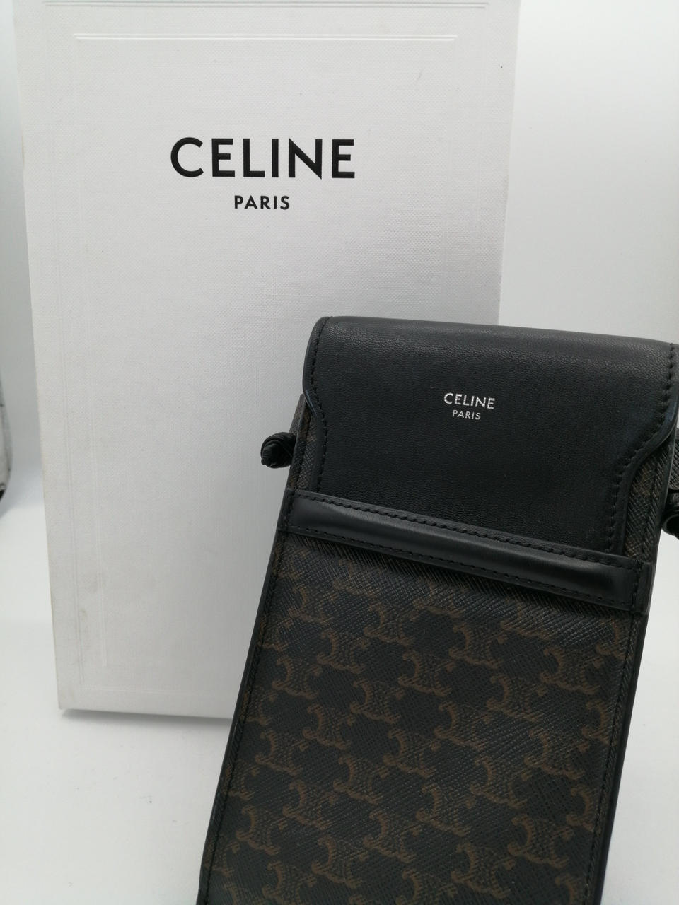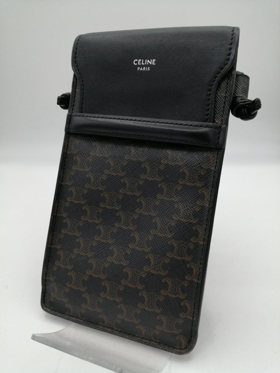 CELINEのスマホポーチは、トリオンフキャンバスとラムスキンのコンビネーションで仕立てられたアイテムです
