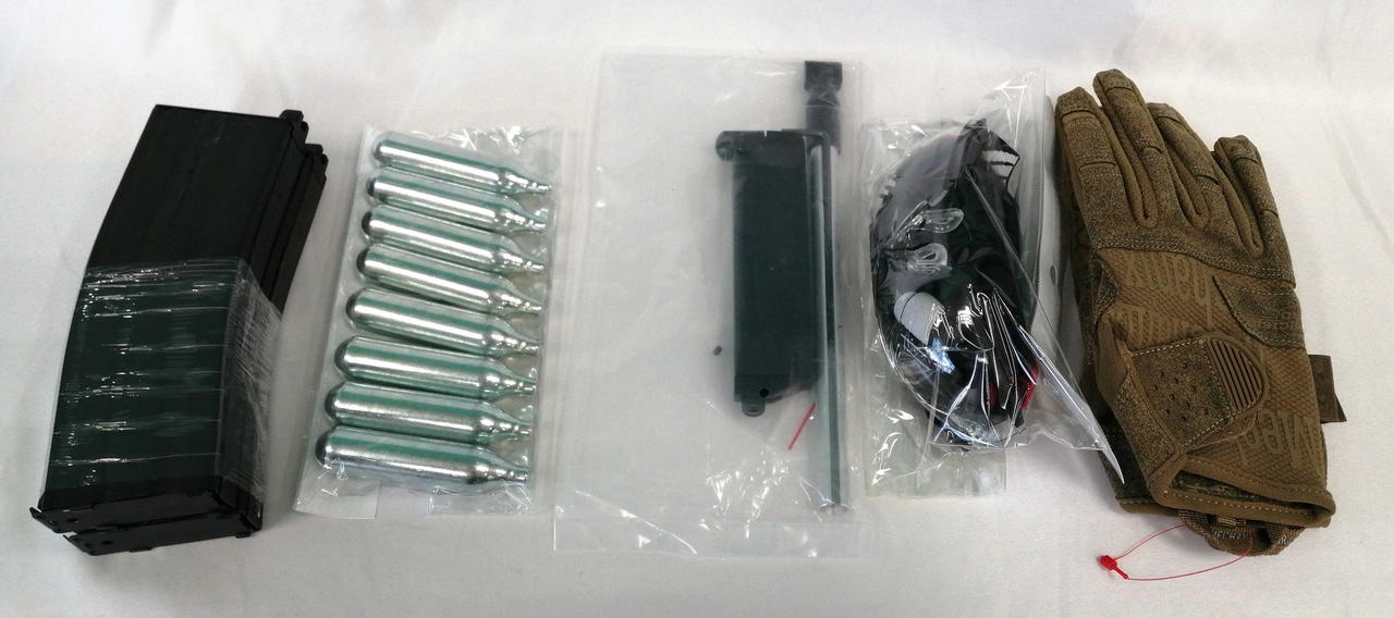 ガスシリンダー式(マガジンx2 シリンダーx8 ゴーグル グローブ バッグ)付属 |