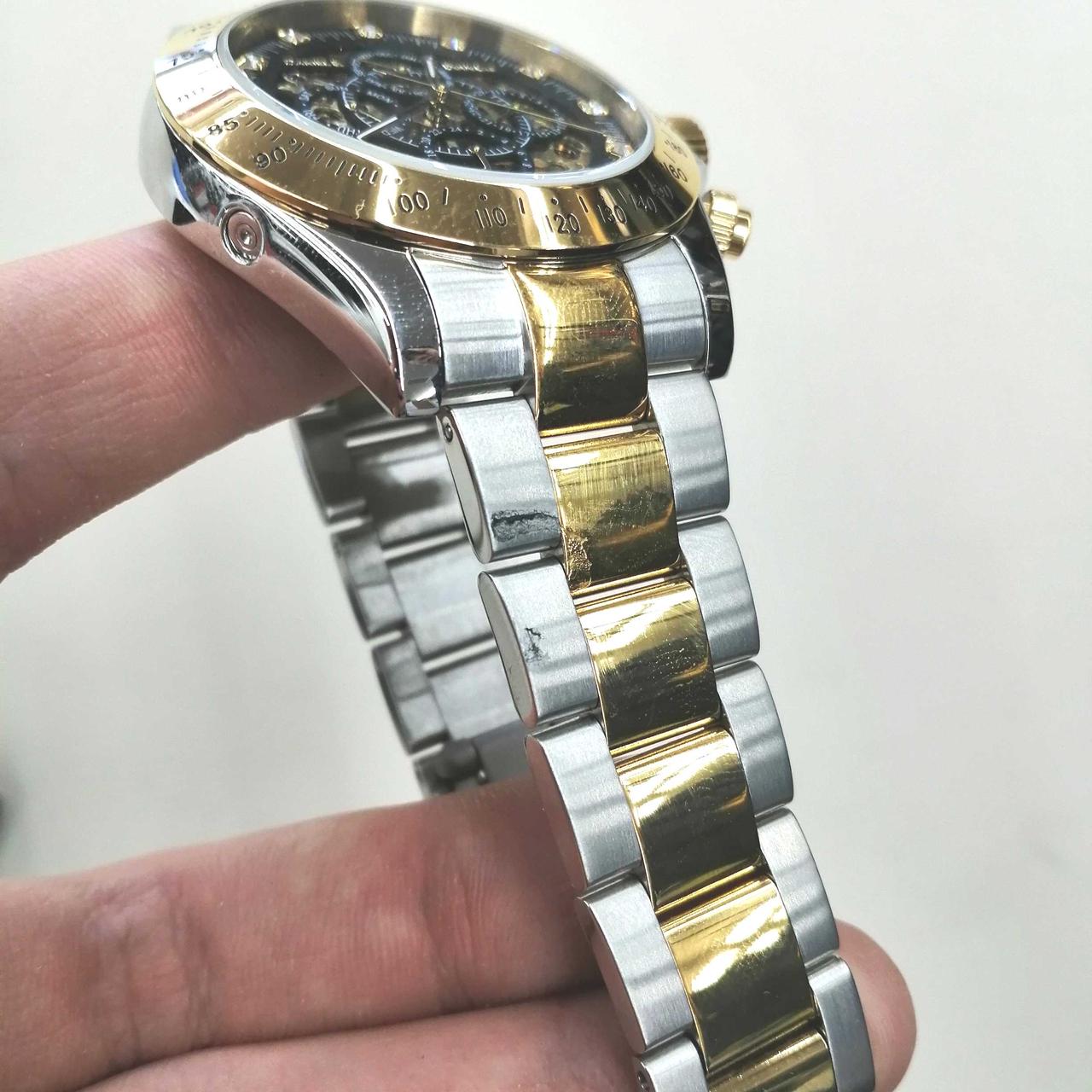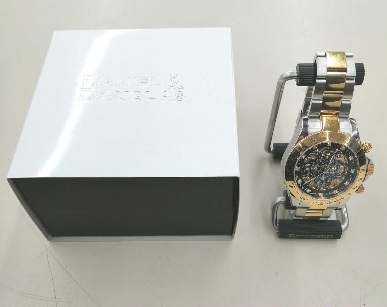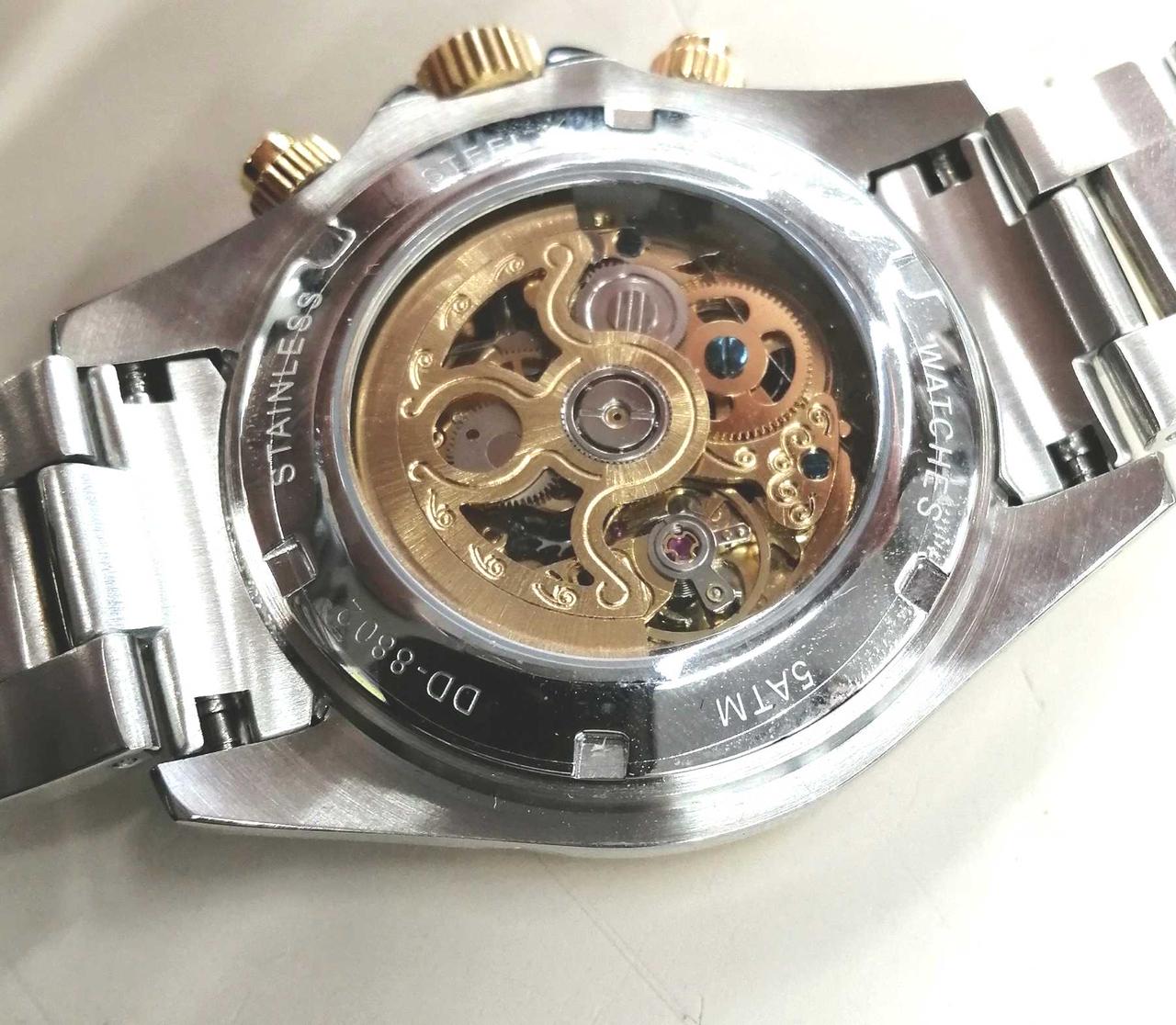 メンズ向けの自動巻き時計です。裏側がスケルトンなので機構が見えます。 |