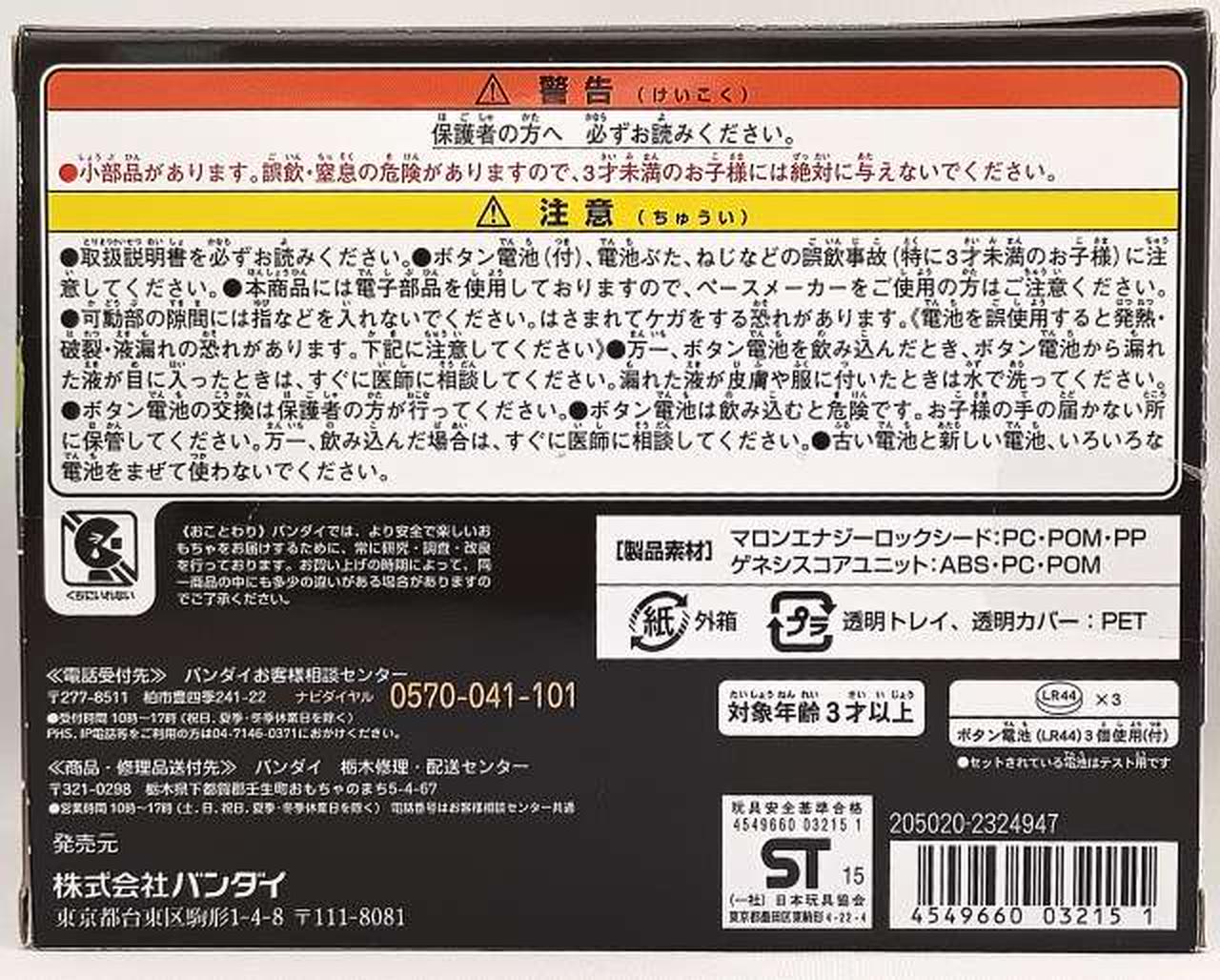 Vシネマ『鎧武外伝』の第二弾のうち、仮面ライダーナックル版のストーリーに登場する「マロンエナジーロックシード」と、変身ベルトDX戦極ドライバーに装着できる「ゲネシスコアユニット」をセットにしたプレミアムバンダイ限定品。 ロックシードの背面のボタンを押すと発光し、収録されているザックと戒斗の台詞が鳴ります。二人の掛け合いなど、多数の収録音声が楽しめます。音声例:ザック「俺には守るものがある!犠牲を超えて、戦う価値がある!」戒斗「強くなったな、ザック」※音声は一例です。 |