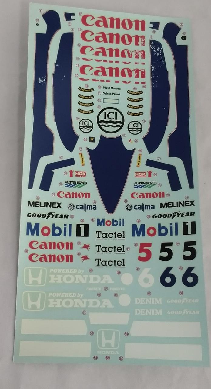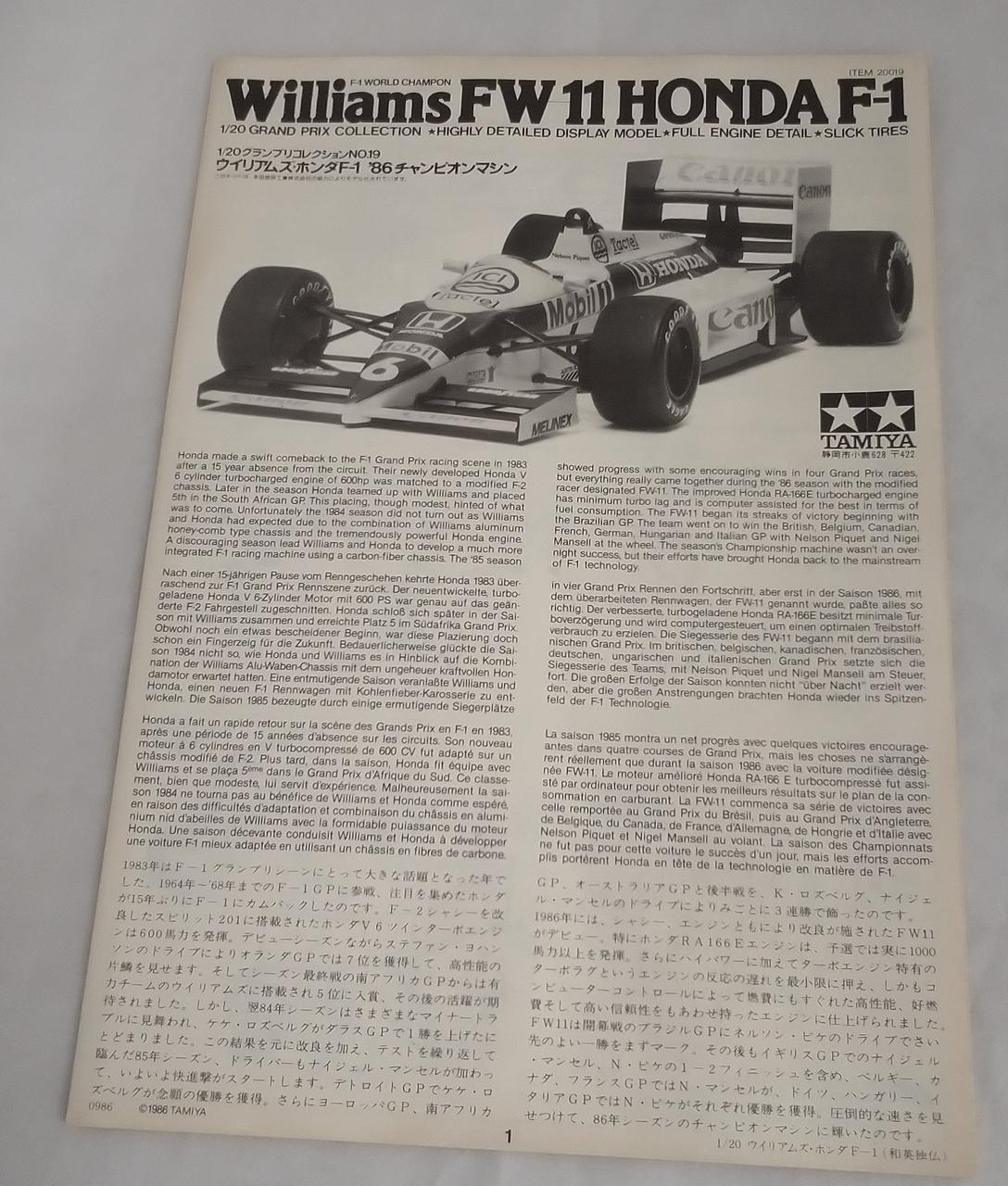 型番:1/20 WILLIAMS FW11 HONDA F-1
