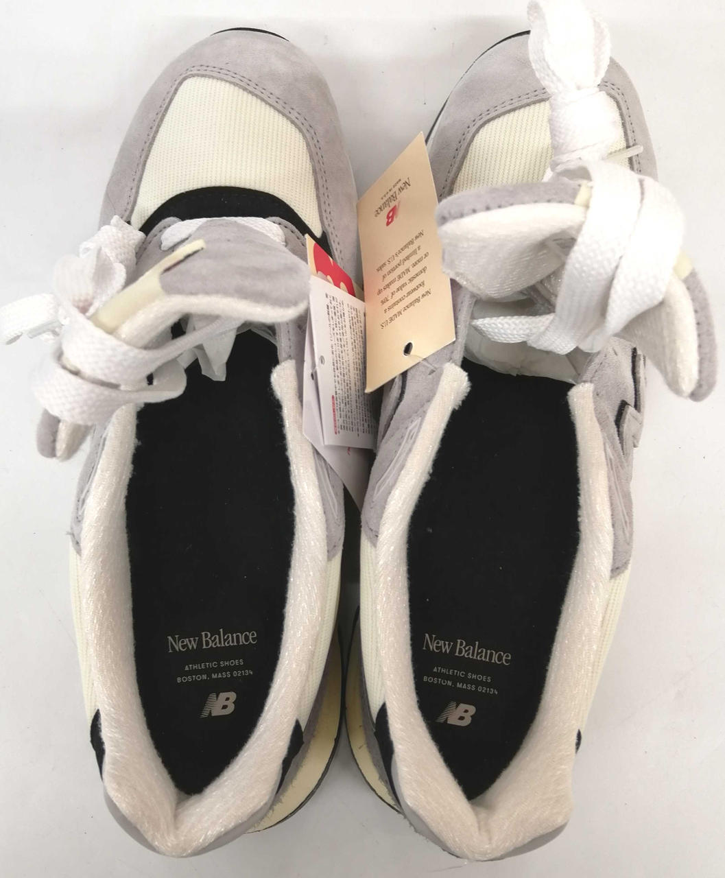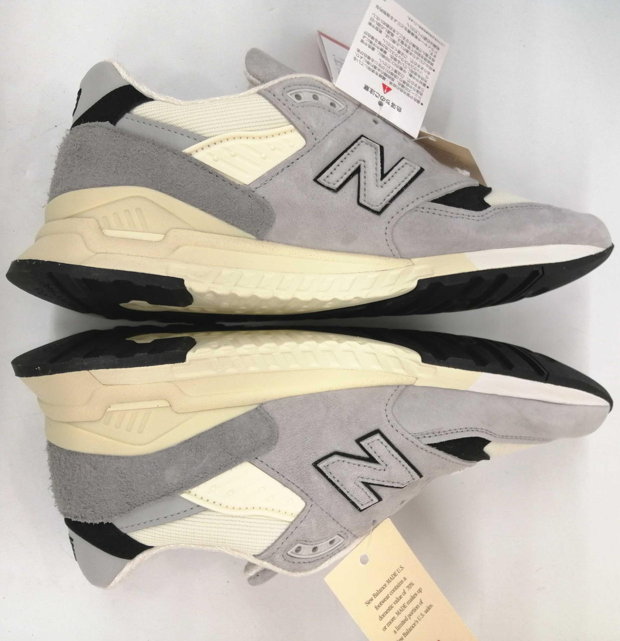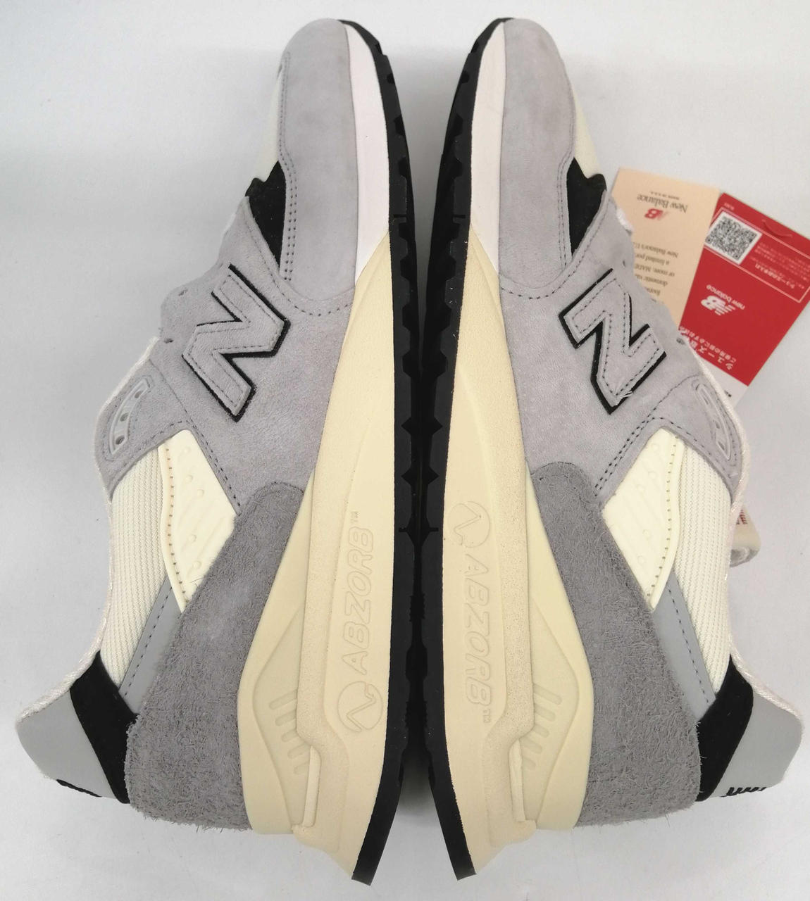 上質なピッグスキンスエードとメッシュを採用し、ヘリテージカラーのグレーをベースにホワイトとブラックのアクセントが施されています。