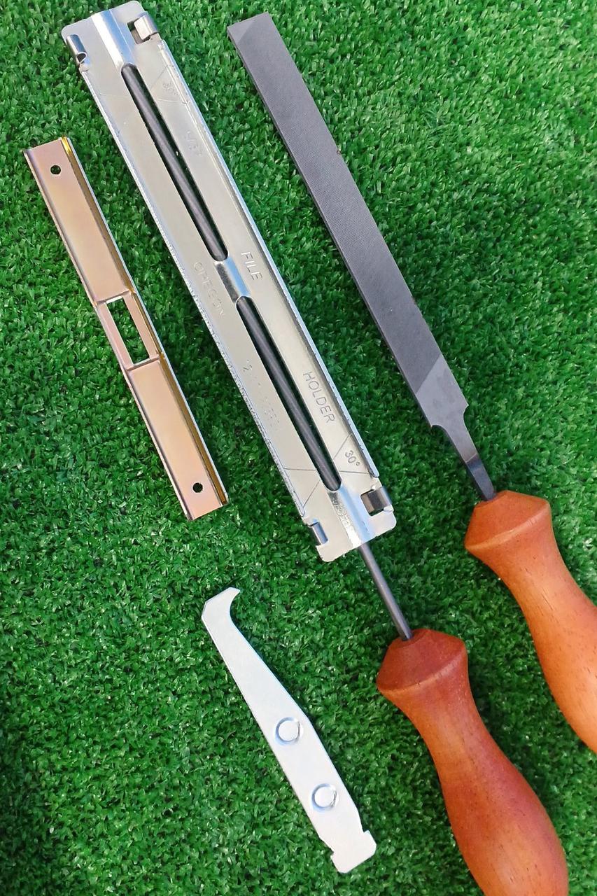 やすりホルダー 4.0mm、平ヤスリ(ハンドル付き)、バークリーナー(ガイドバーのレール・ホール木屑除去)、デプスゲージジョインター、マルチメジャー(チェーンピッチ・チェーンゲージ・バーゲージ・ヤスリサイズの識別) |