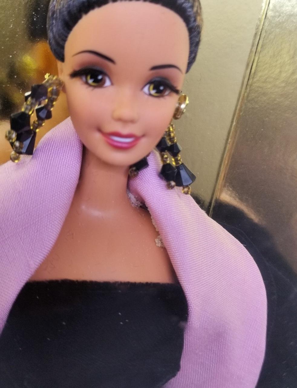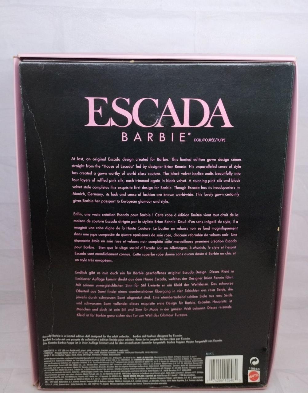 1996年に発売された限定版のコレクタードールです。高級ファッションブランド「エスカーダ」のデザインによる豪華なドレスが特徴です。 |